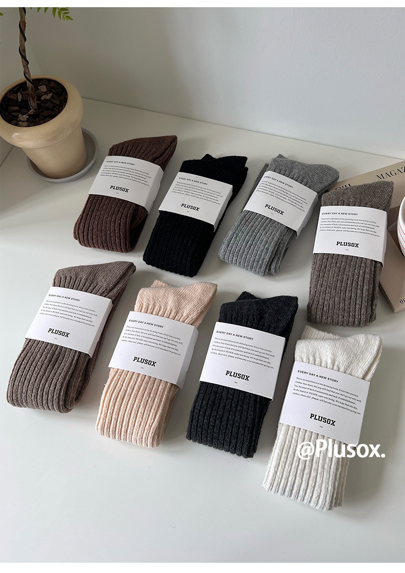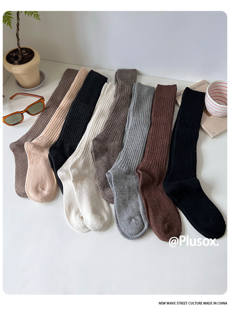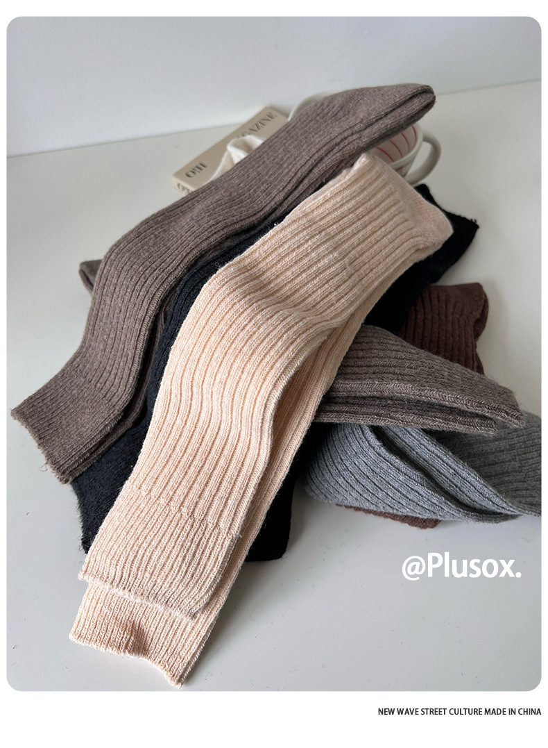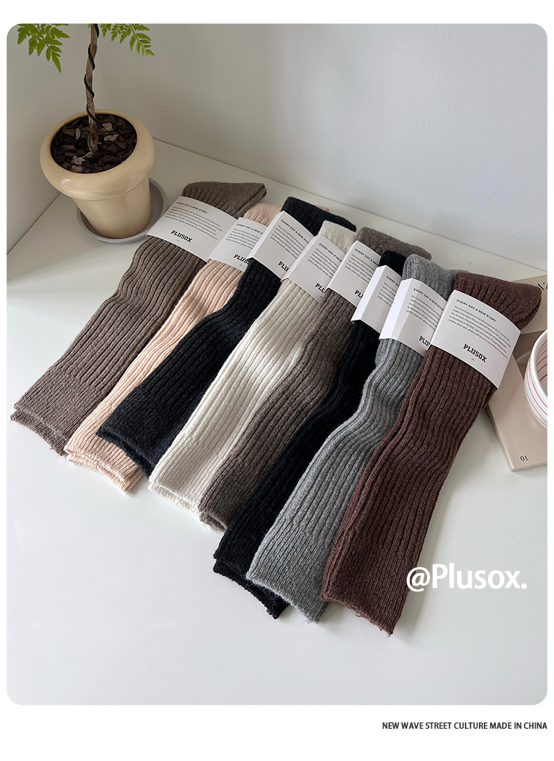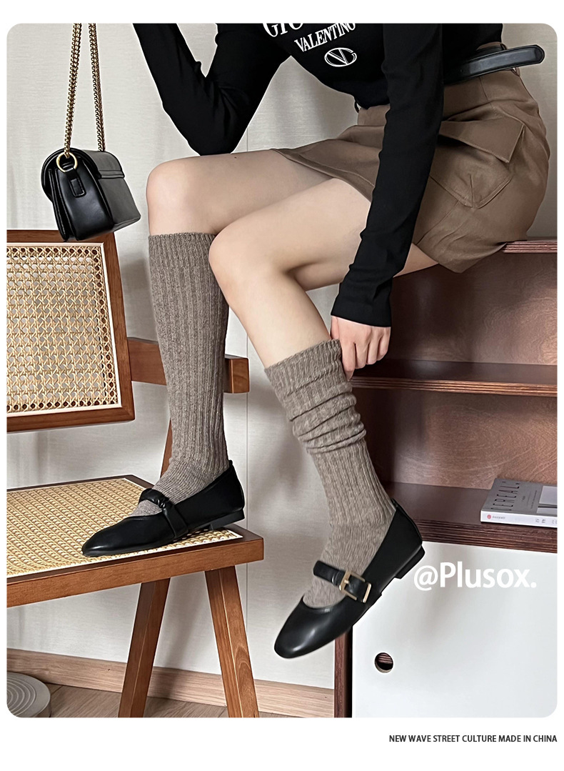 plusox羊毛小腿袜秋冬加厚袜子咖色双针堆堆袜日系女袜及膝袜