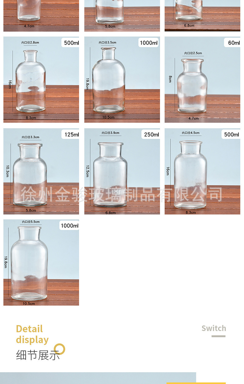 仕様とモデル 60ml - 大口+コルク、透明。,60ml - 小口+コルク、透明。,125ml - 大口+コルク、透明。,125ml - 小口 + コルク、透明,250ml - 大口+コルク、透明,250ml - 小口+コルク、透明。,500ml - 大口+コルク、透明,500ml - 小口+コルク、透明,1000ml-大口+コルク、透明,1000ml - 小口+コルク、透明。,30 大口 + コルク、透明,30 小口 + コルク、透明