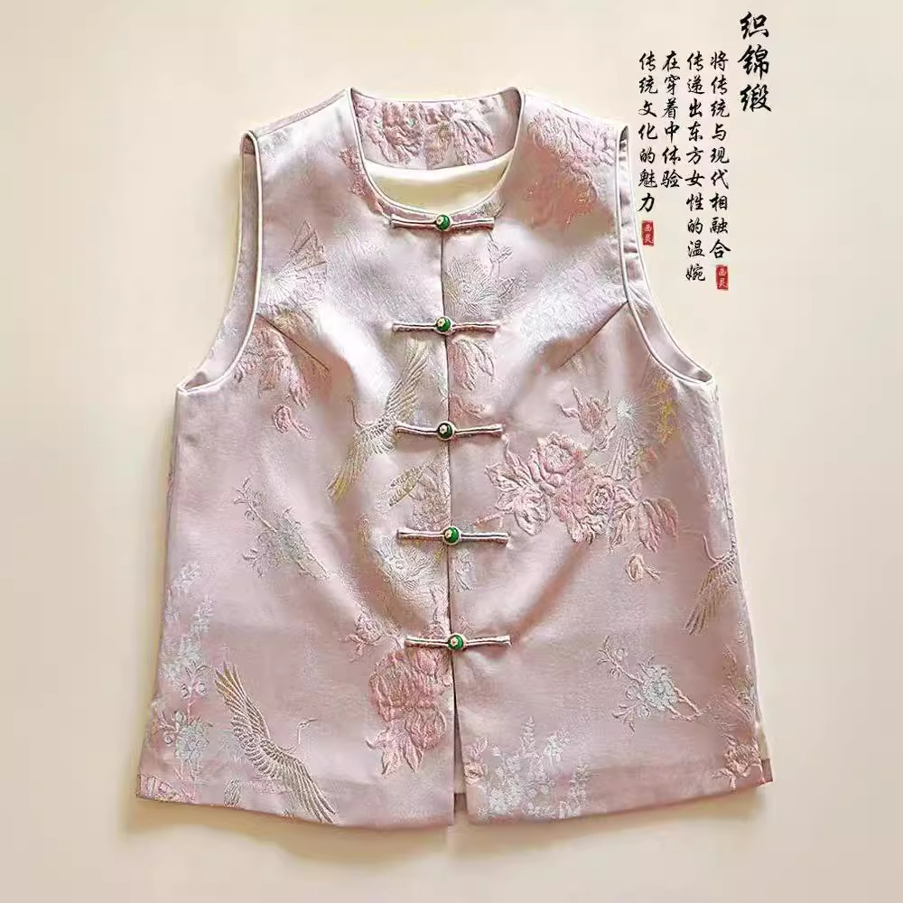 織錦ジャカード新中国式ピンクベスト女性春の新型国風盤ボタン唐装カン肩上着コート