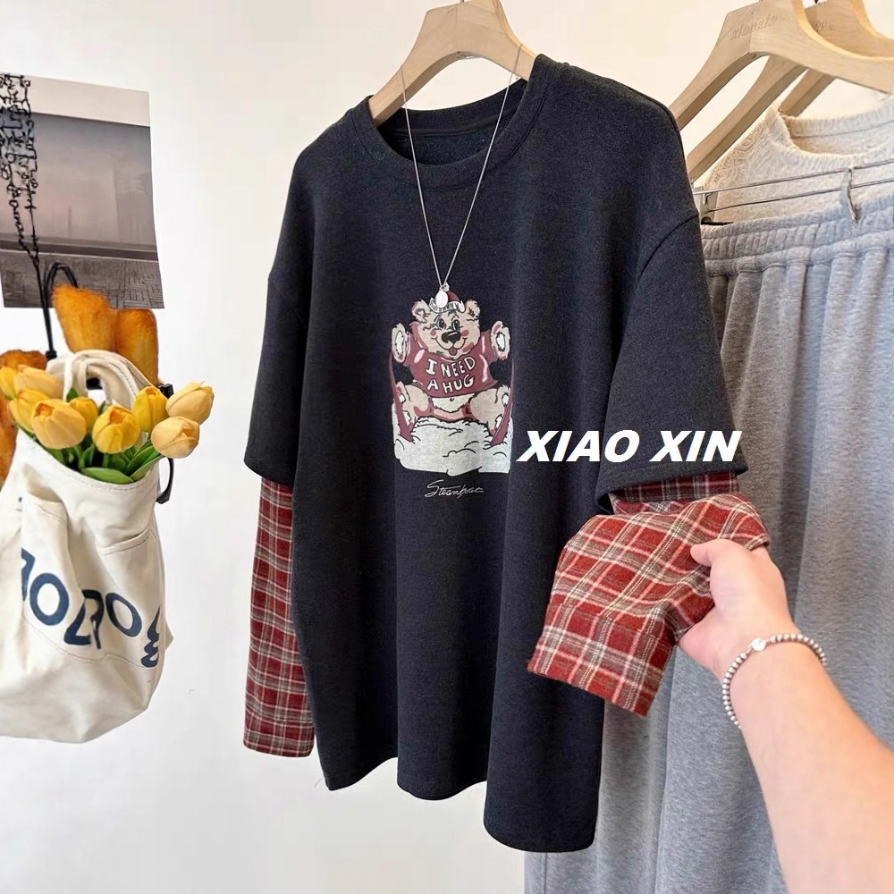 240斤大码跨境韩系格子假两件磨毛长袖T恤女装春秋外穿上衣服宽松