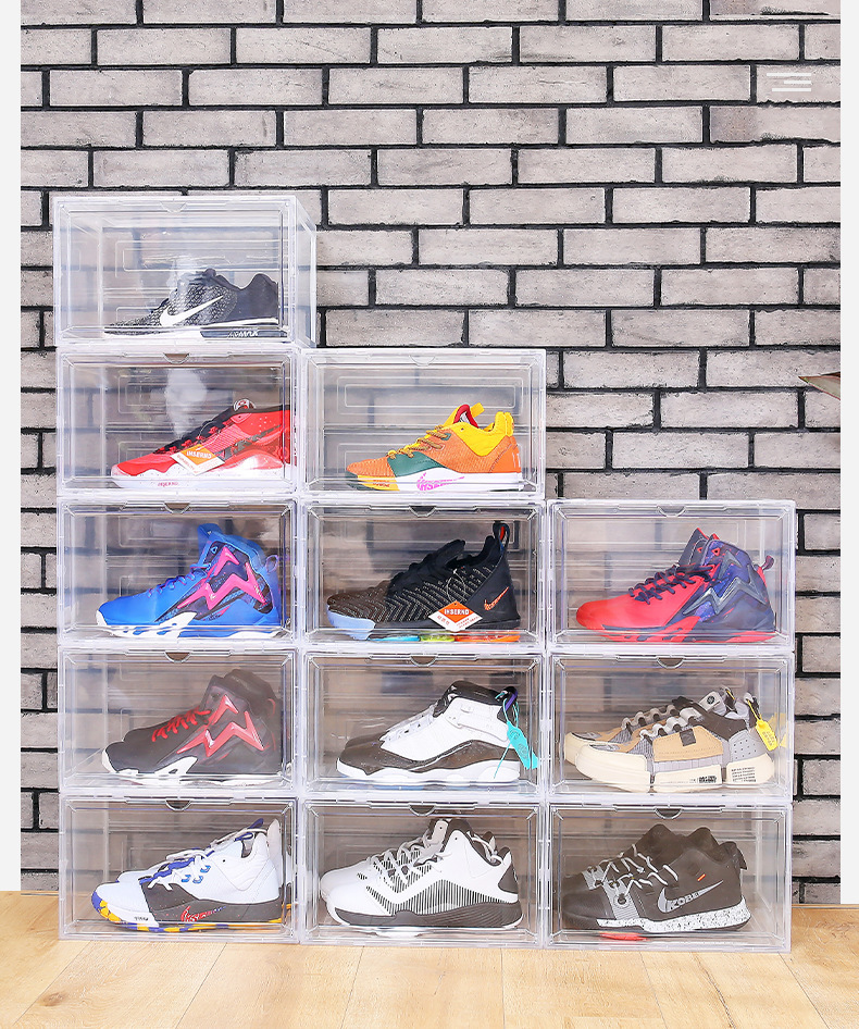 新型プラスチック製バスケットボールシューズ用磁気開閉式透明シューズボックス、卸売アクリル収納ボックス、清潔収納ラック