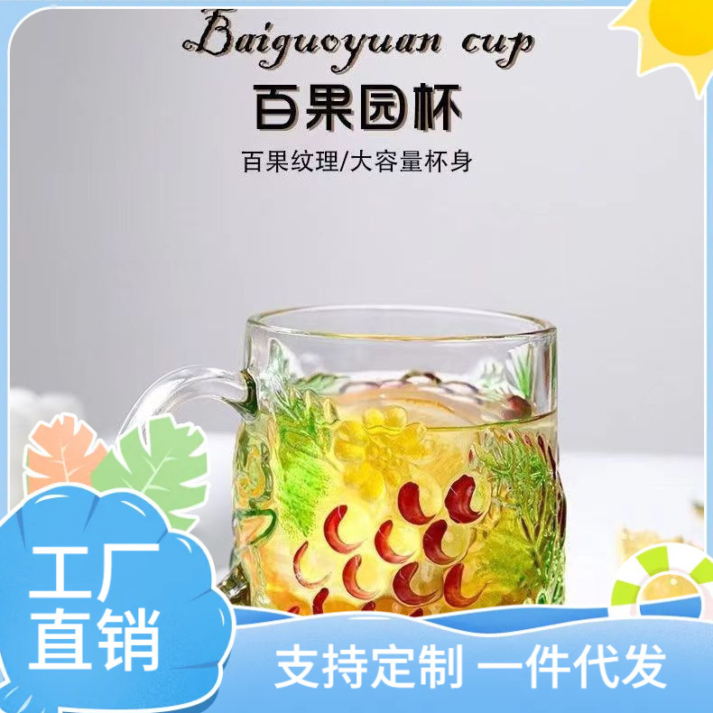 百果手描きハンドルカップ創造性レリーフガラスジュースカップ鉛フリー水銀フリーカップ厚い断熱家庭用カップ