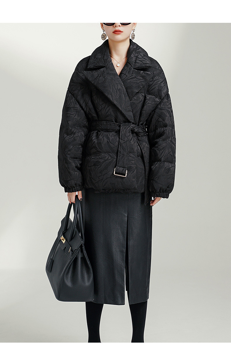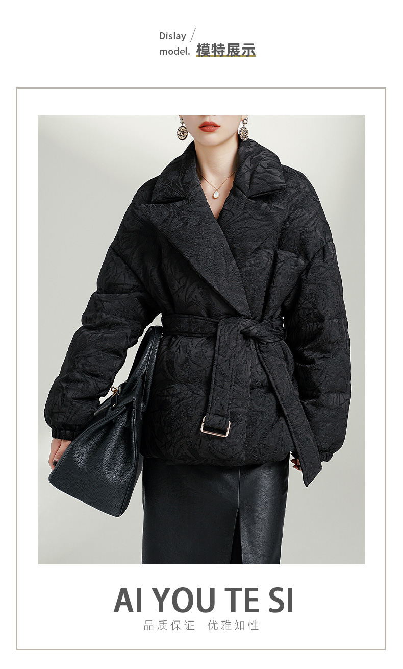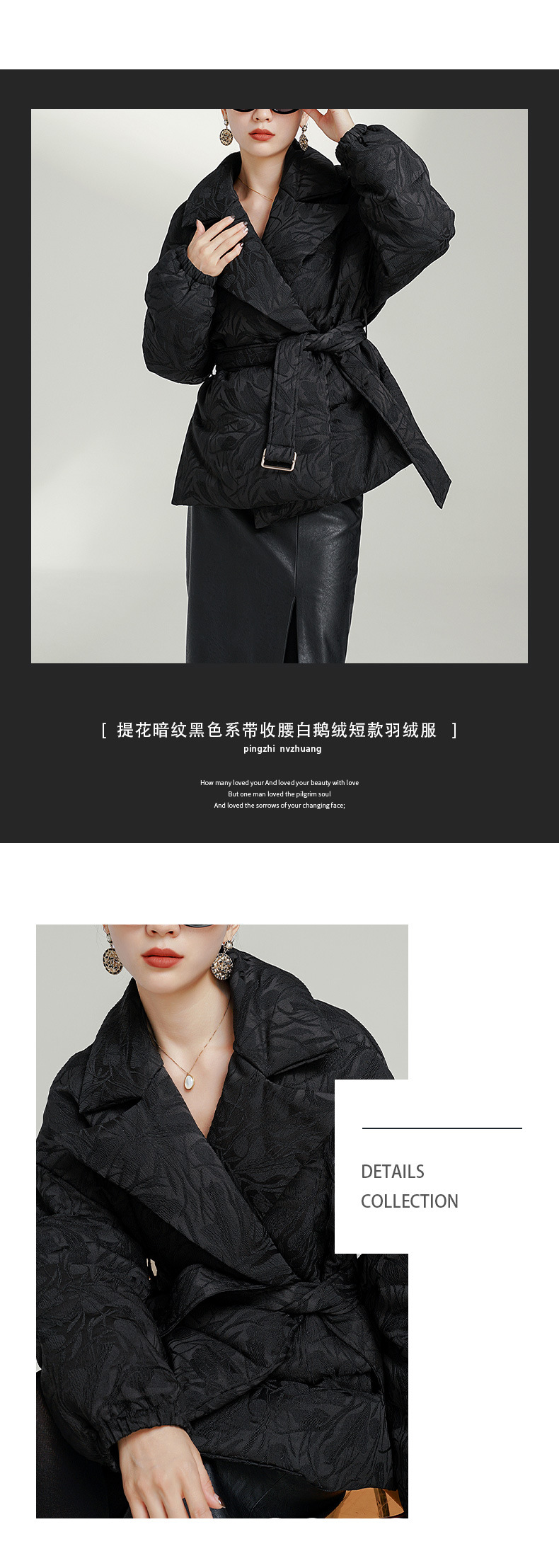 ジャカードは腰のガチョウのベルベットの黒いダウンジャケットの女性の高級婦人服の短い平湖冬服の冬の95白ガチョウのベルベットを収めた