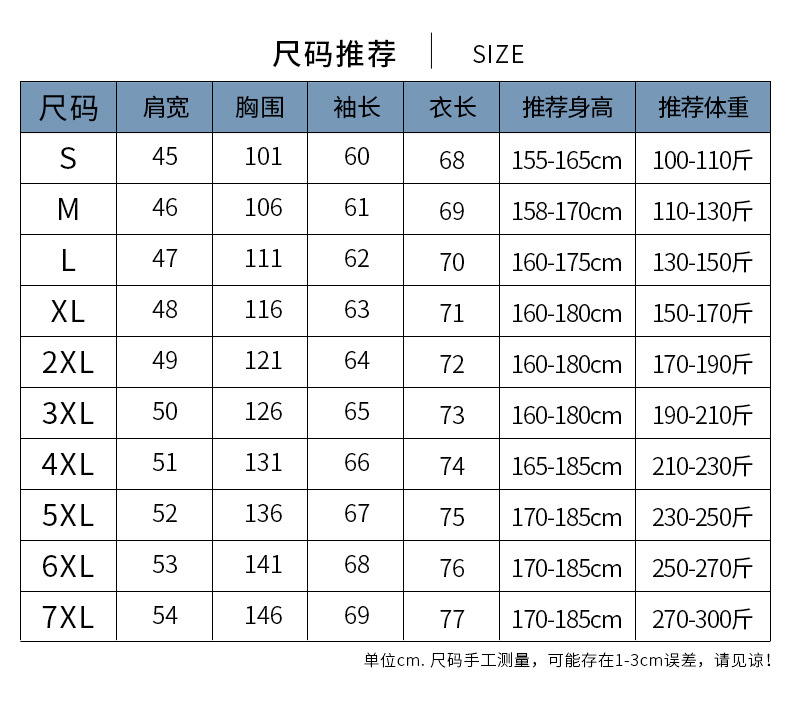 S提案 (100-120)斤,Mアドバイス (120-140)斤,L推奨 (140-160)斤,Xlアドバイス (160-180)斤,2xlアドバイス (180-200)斤,3xlアドバイス (200-220)斤,4xlアドバイス (220-240)斤,5xlアドバイス (240-260)斤,6xlアドバイス (260-280)斤,7xlアドバイス (280-300)斤