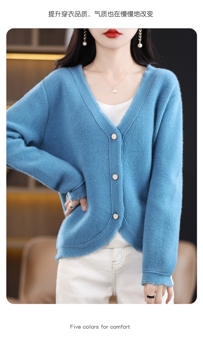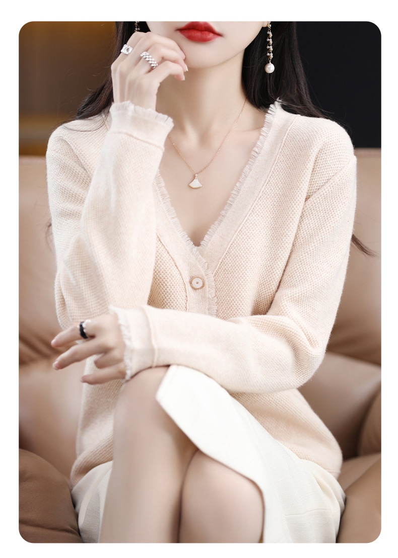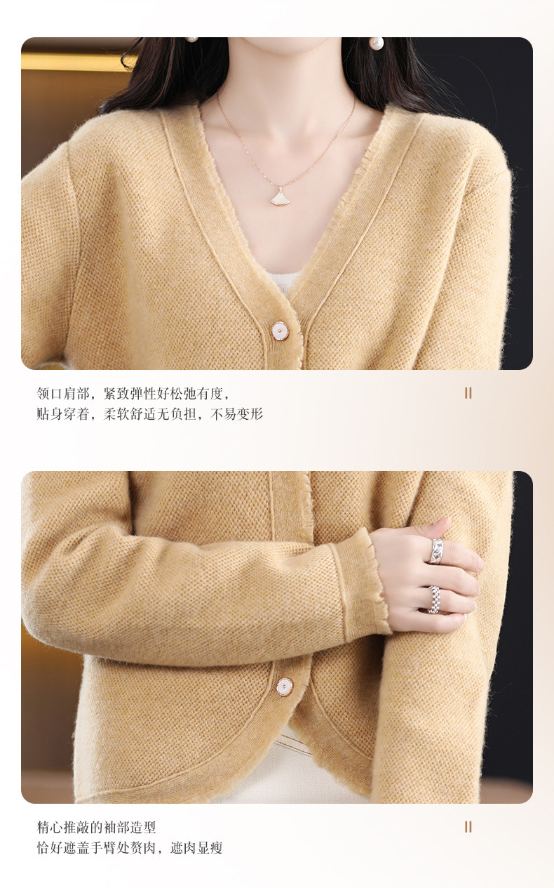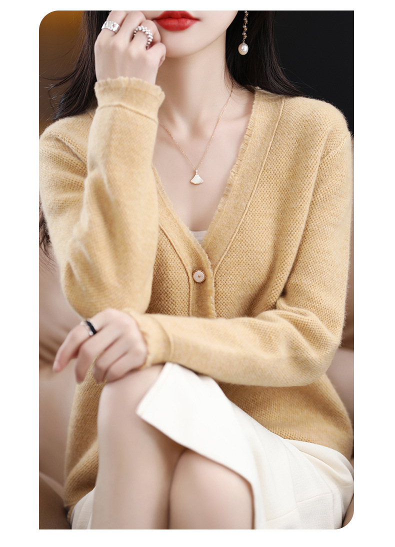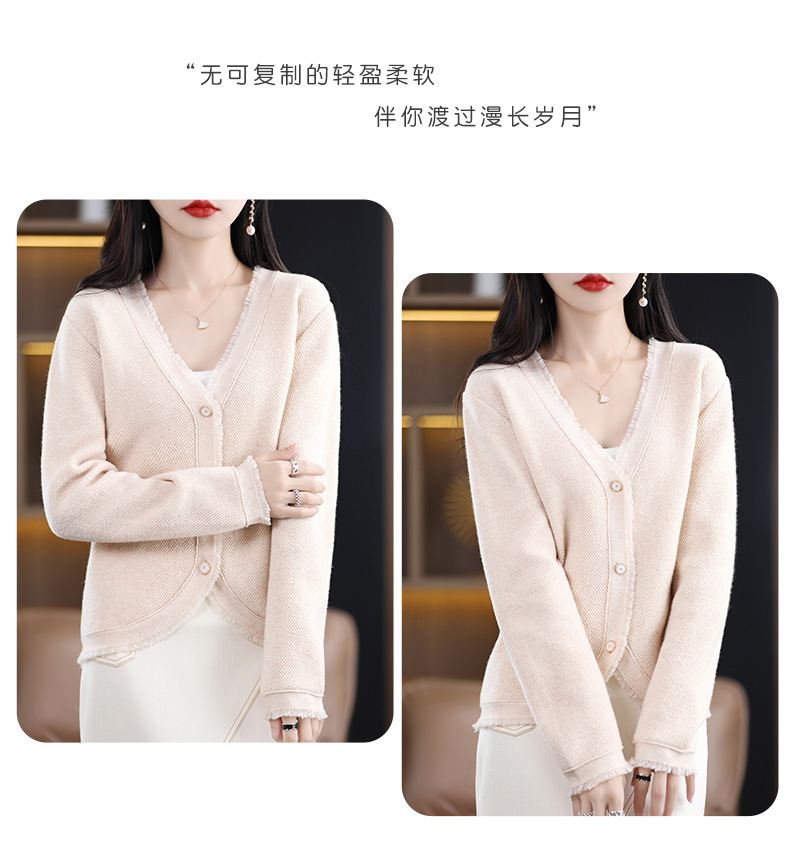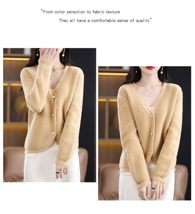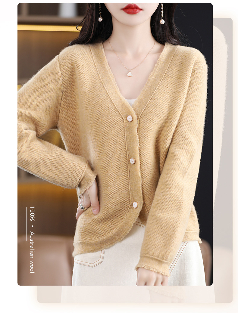 純粋なウールのニットのカーディガンの女性の2023春の服の新型のベージュの外はゆったりしている短いvネックのセーターのオーバーを掛けます。