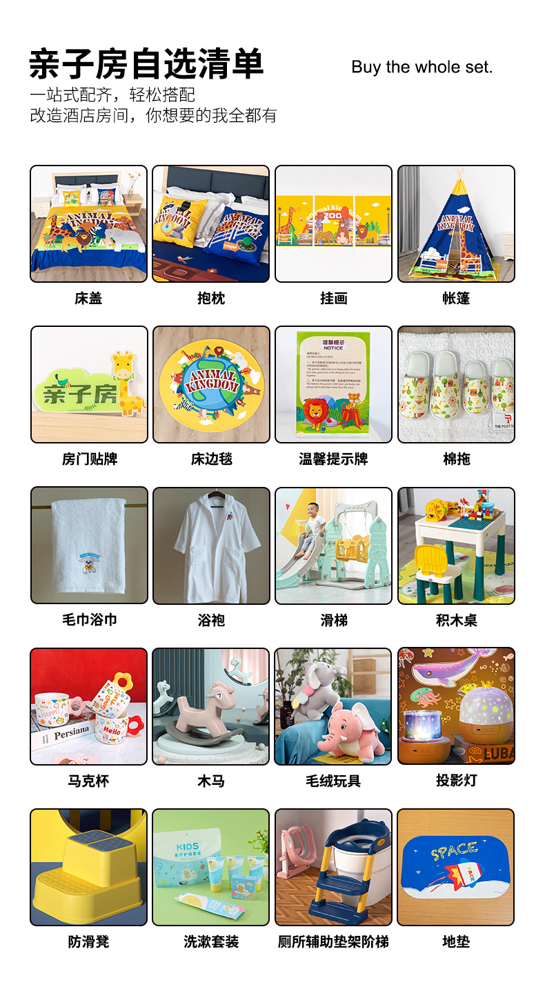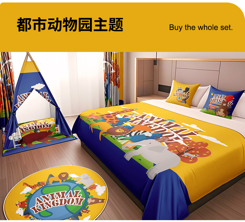 ホテルの親子ルームレイアウト、子供用漫画ベッドカバー、枕、テント、装飾玩具、B&B親子テーマルーム改修