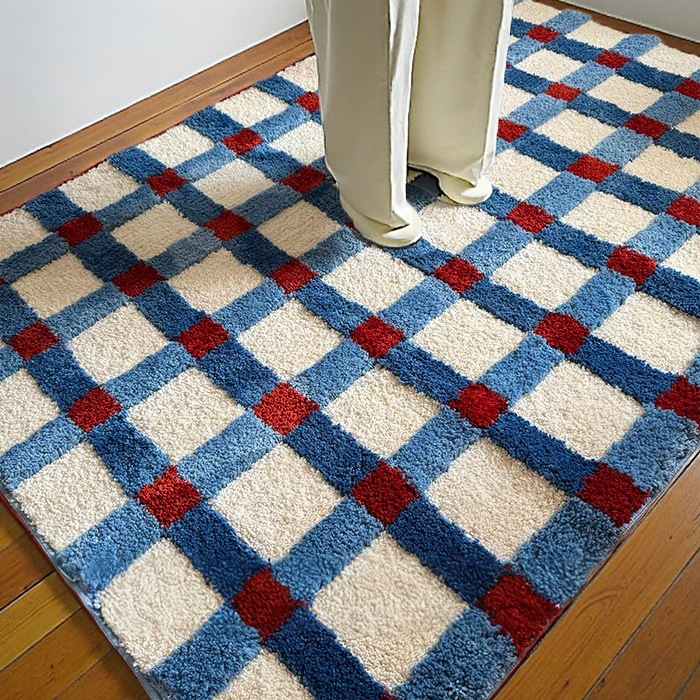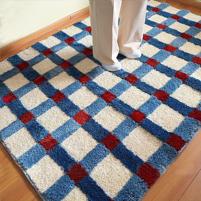 ins 中古レトロ韓国スタイルシーブルーチェック柄ブロガー寝室リビングルームクロークタフテッドカーペット植毛フロアマット