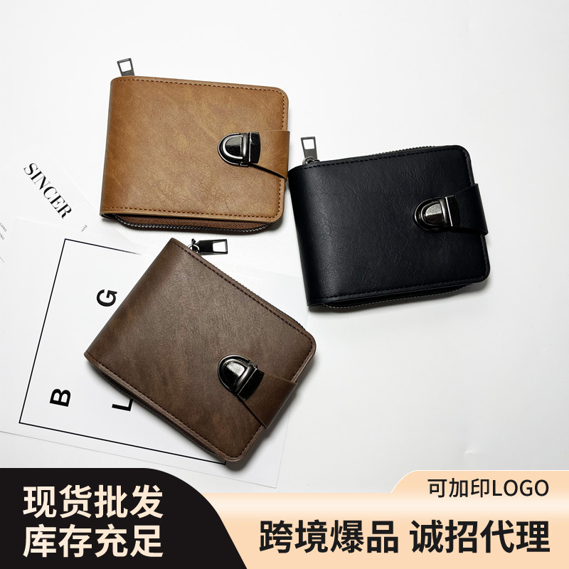 クロスボーダー新商品2024レトロ男性ショート財布横型ファスナー多機能カードバッグ三つ折りファスナー小銭入れ