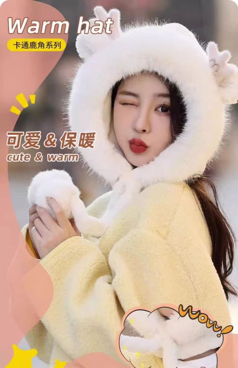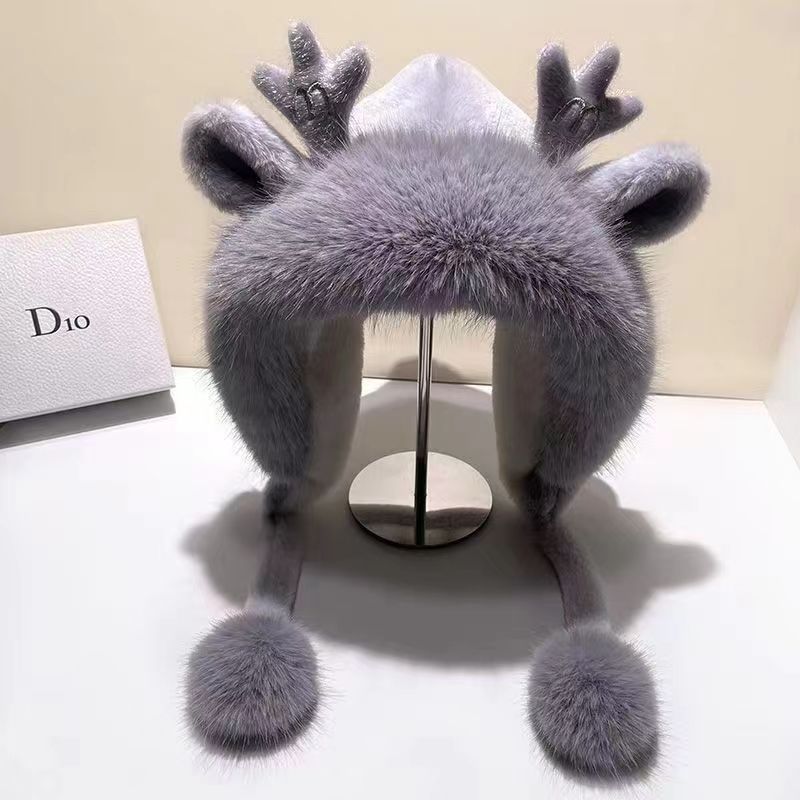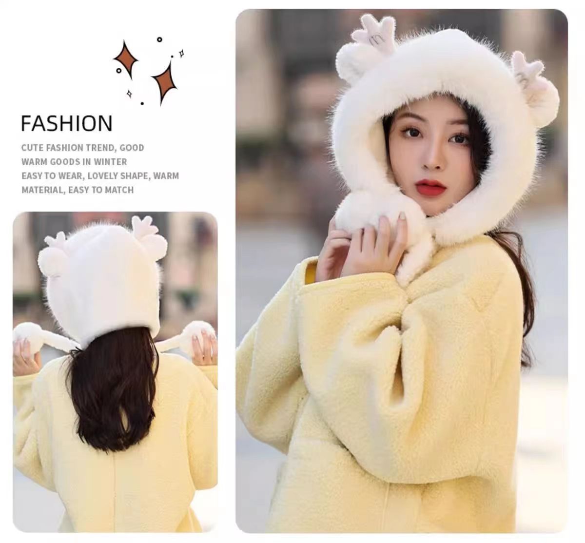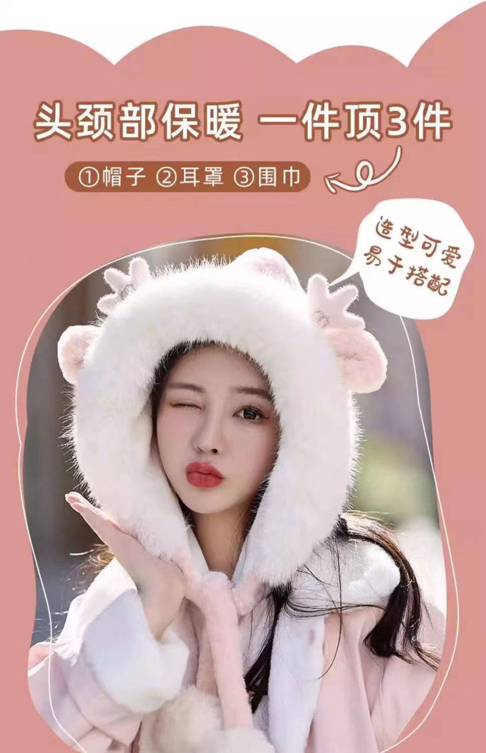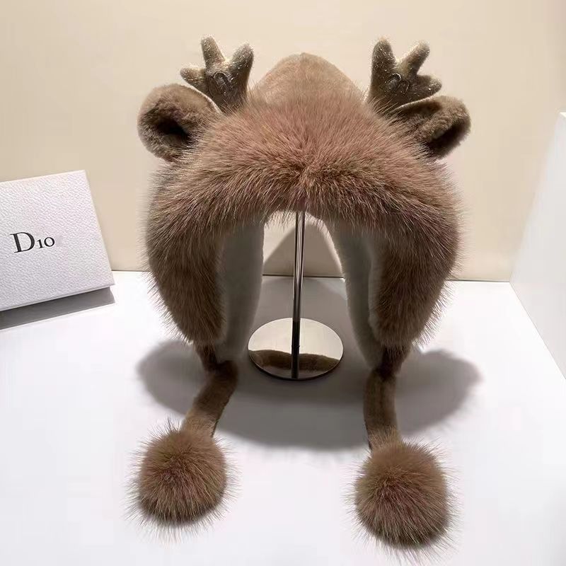 新款鹿角毛绒加绒加厚保暖骑车防寒毛球护耳连体帽冬季可爱帽子女