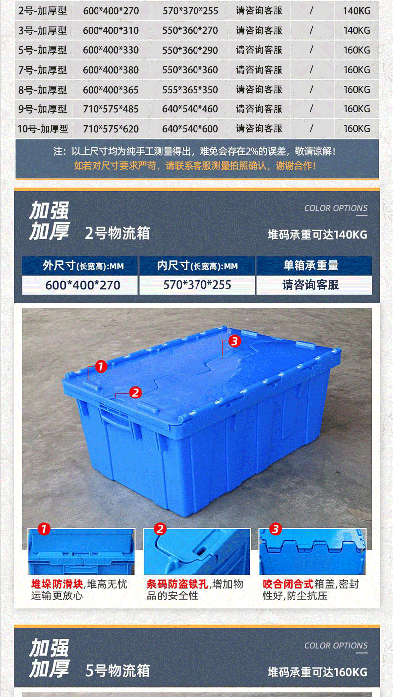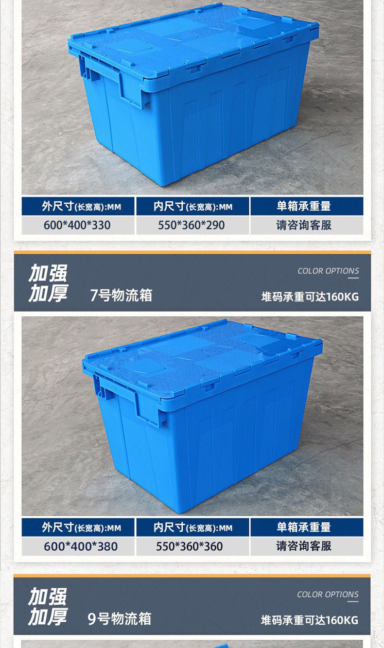 規格型番 560x380x330 1号物流箱 * 新素材ブルー,600x400x270 2号物流箱 * 新素材ブルー,600x400x310 3号物流箱 * 新素材ブルー,600x400x315 4号物流箱 * 新素材ブルー,600x400x330 5号物流箱 * 新素材ブルー,600x400x355 6号物流箱 * 新素材ブルー,600x400x380 7号物流箱 * 新素材ブルー,600x400x365 8号物流箱 * 新素材ブルー,710x575x485 9号物流箱 * 新材料ブルー,710x575x620 10号物流箱 * 新材料ブルー