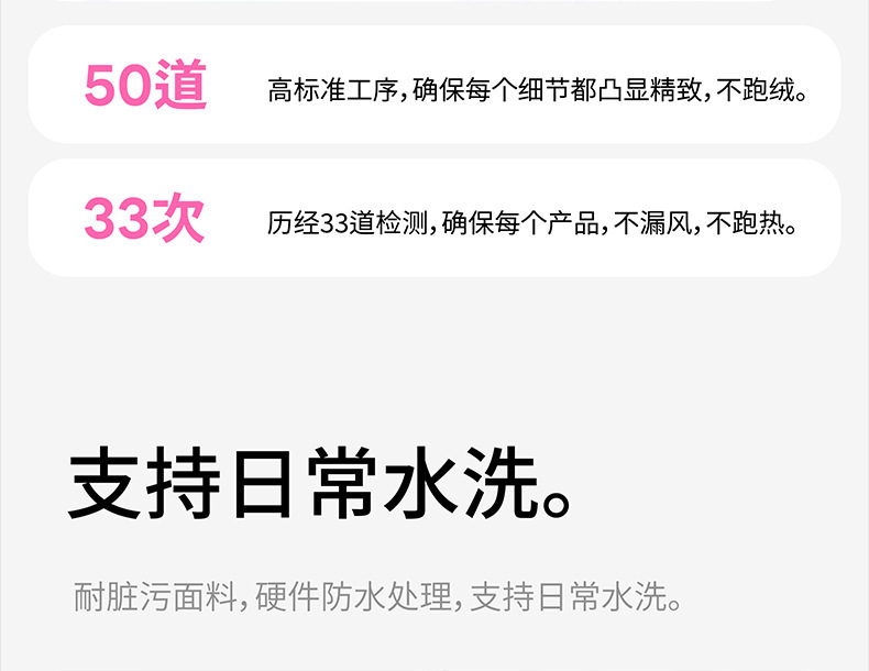 产品填充物:白鸭绒(RS3)/水洗棉(RS4)