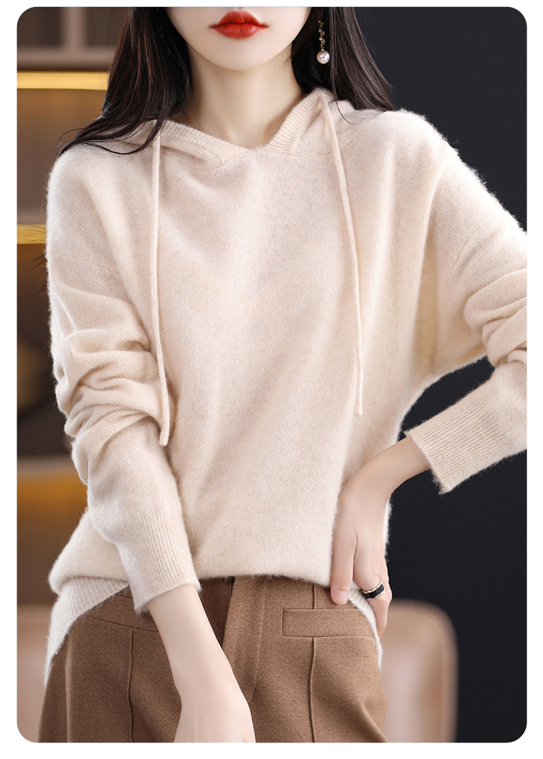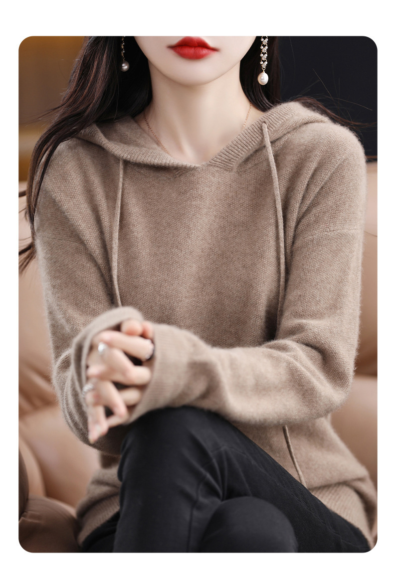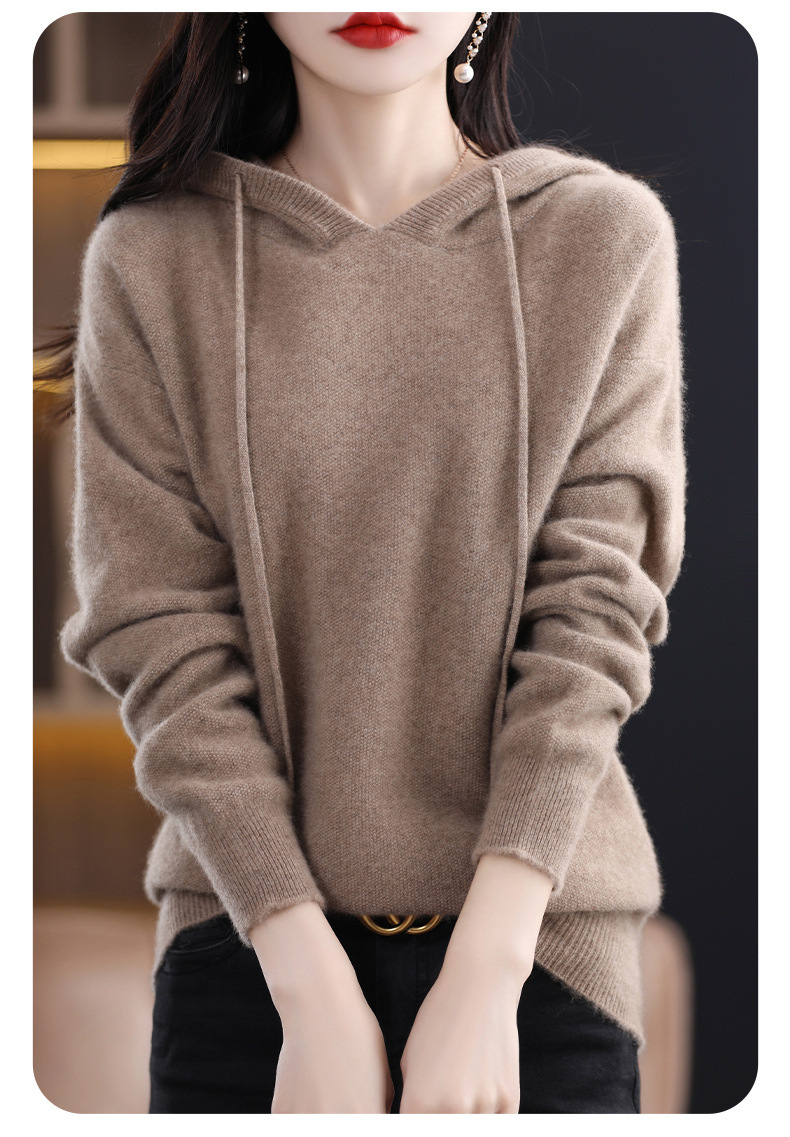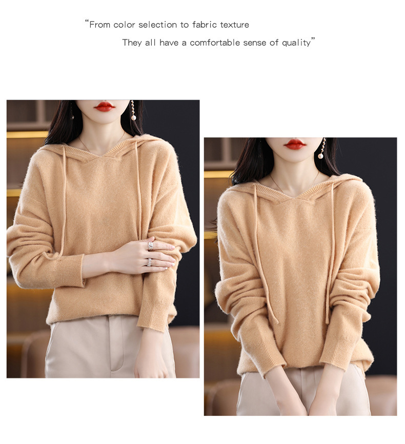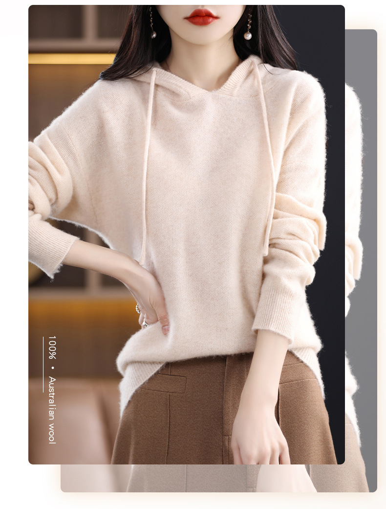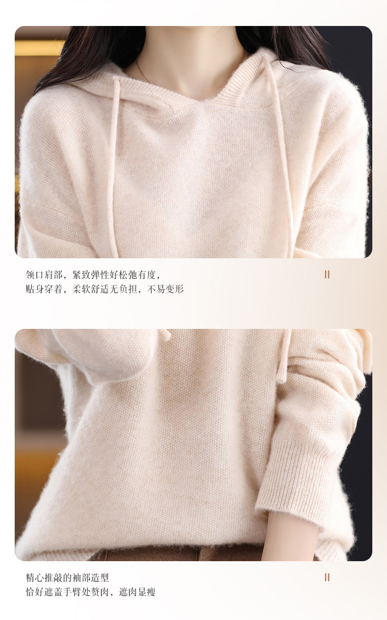 2023年秋冬の新型フード付きウールニットの女性パーカーのゆったりとしたプルオーバーの帽子付きセーター