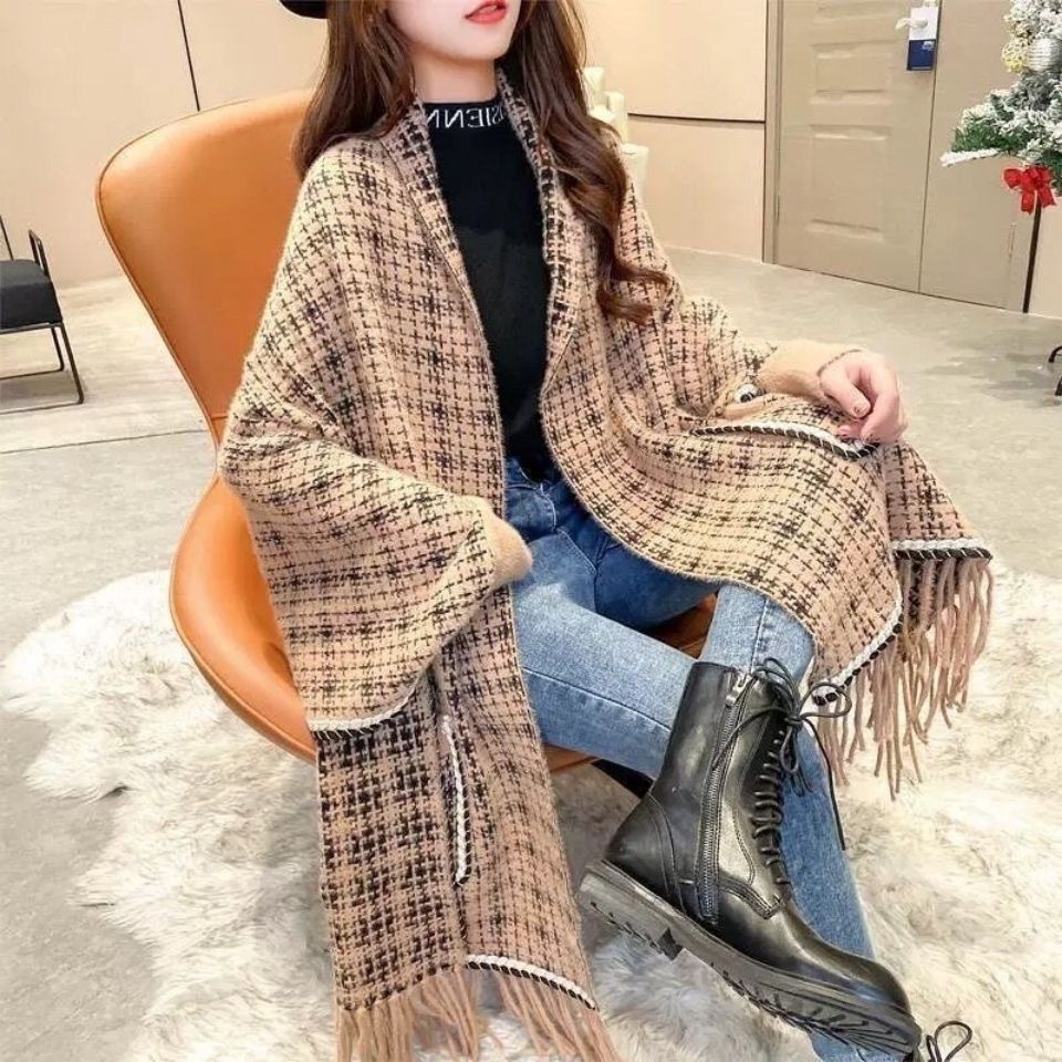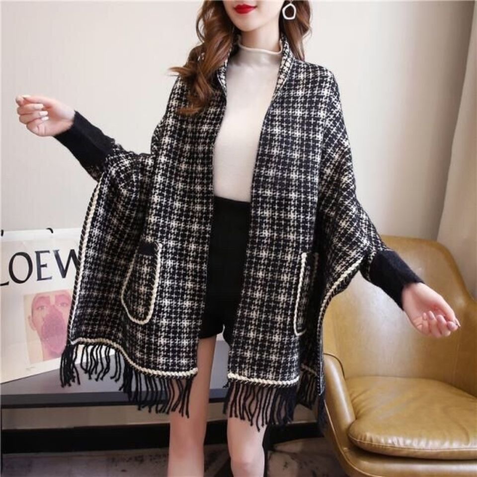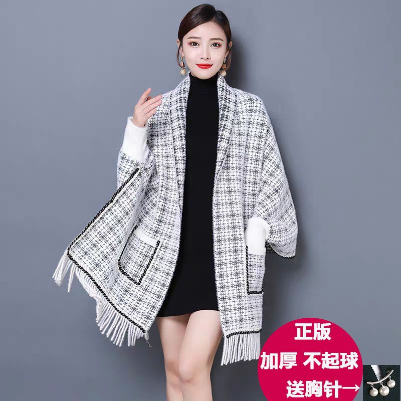 ミンクのニットのマントのカーディガンのコートの女性の千鳥の格のポケットの秋冬の新型のフリンジの袖のマントのマントのマントのマントのマント