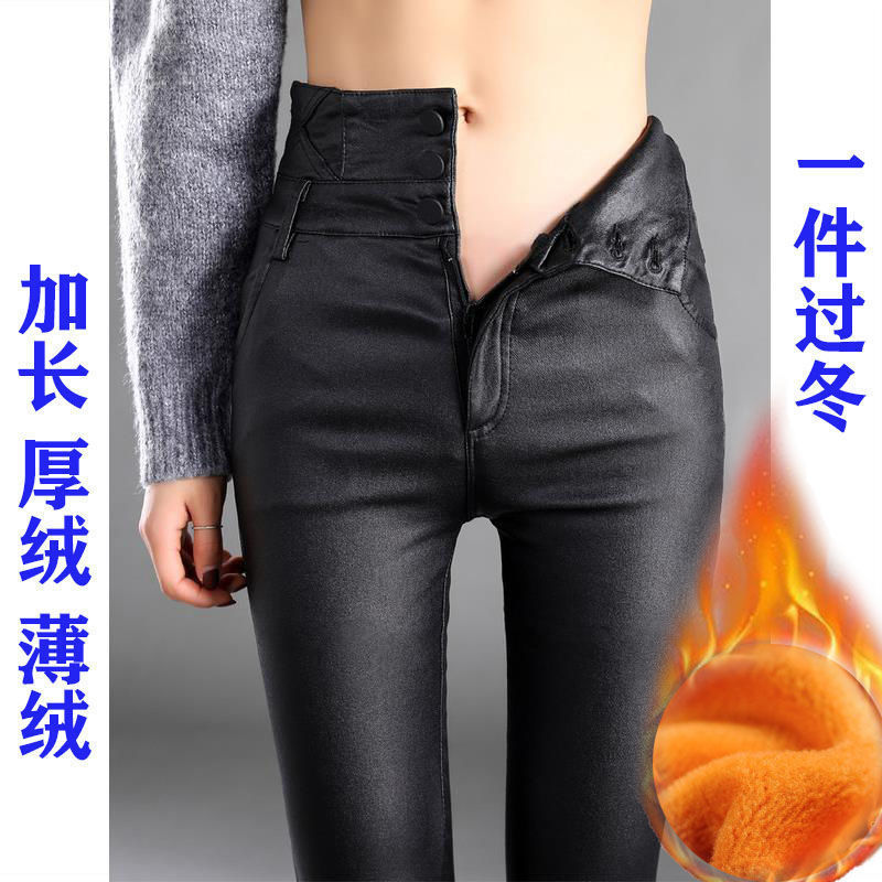 革のズボンの女性の秋冬のレギンスの外は黒色の2025新型の高腰のベルベットの厚いpuのタイトな足のズボンを着ます。