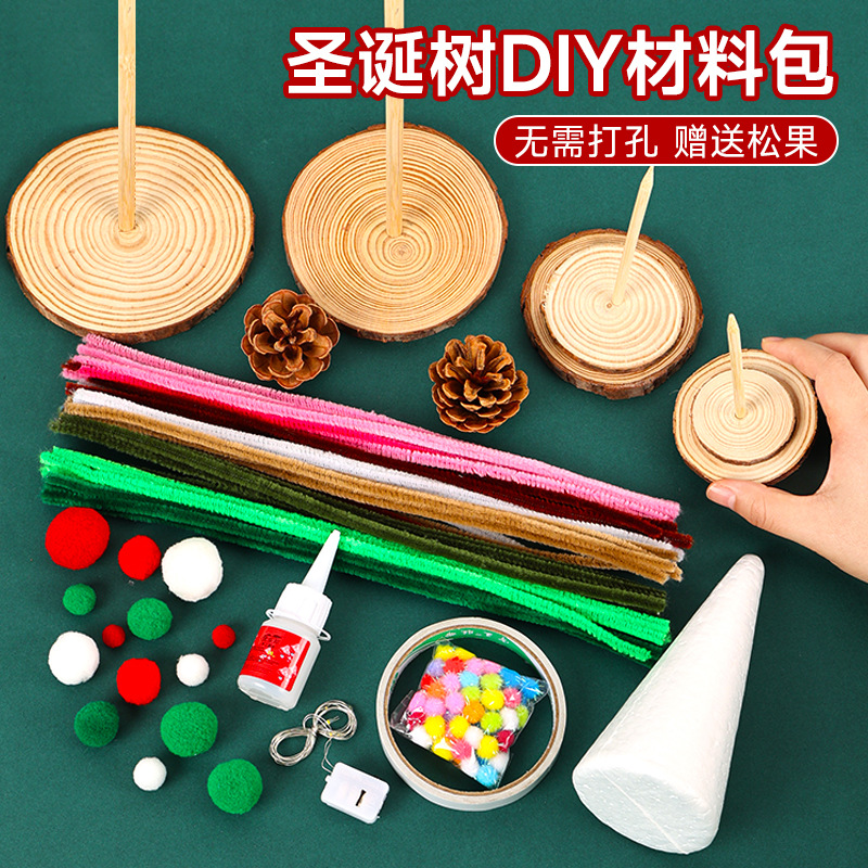圣诞树底座diy材料包原木底托底盘打孔送松果扭扭棒粘土圣诞装饰
