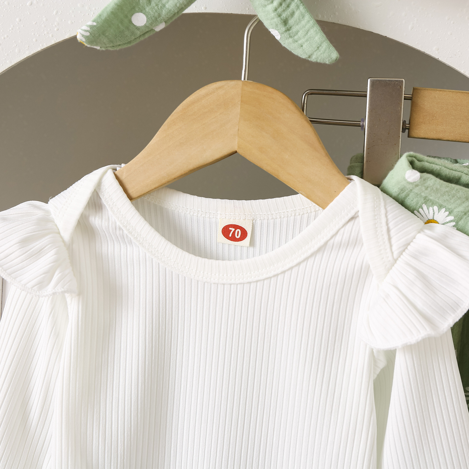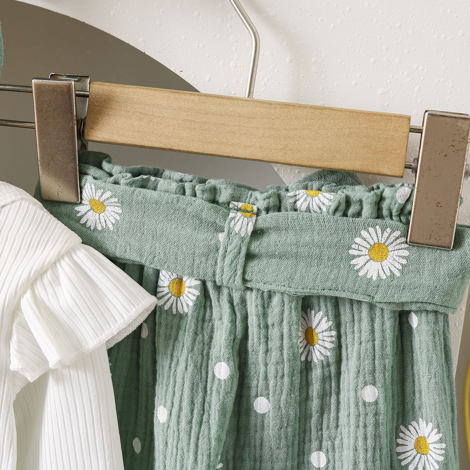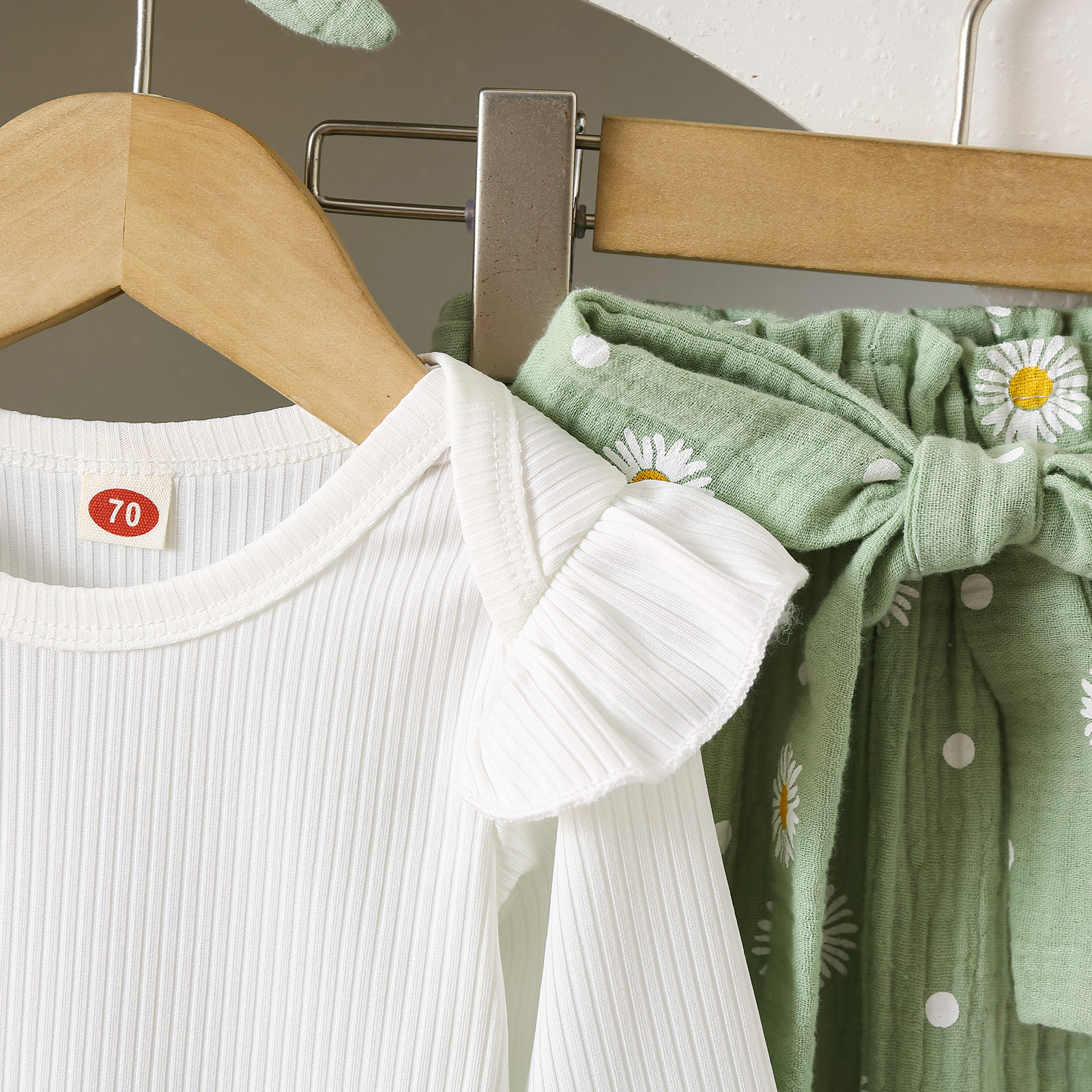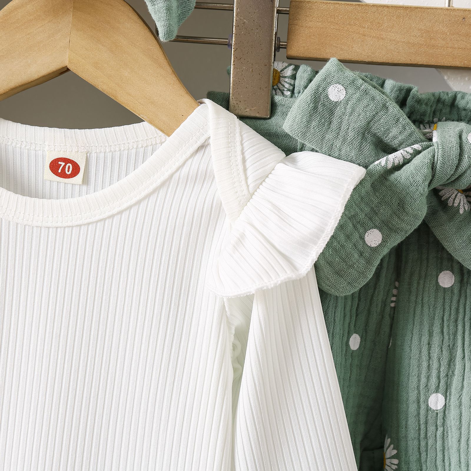 グリーンカーキ色のトップス:ポリエステル100%、パンツ:ポリエステル100% 白のトップス:綿95%、ポリウレタン5% パンツ:綿100%