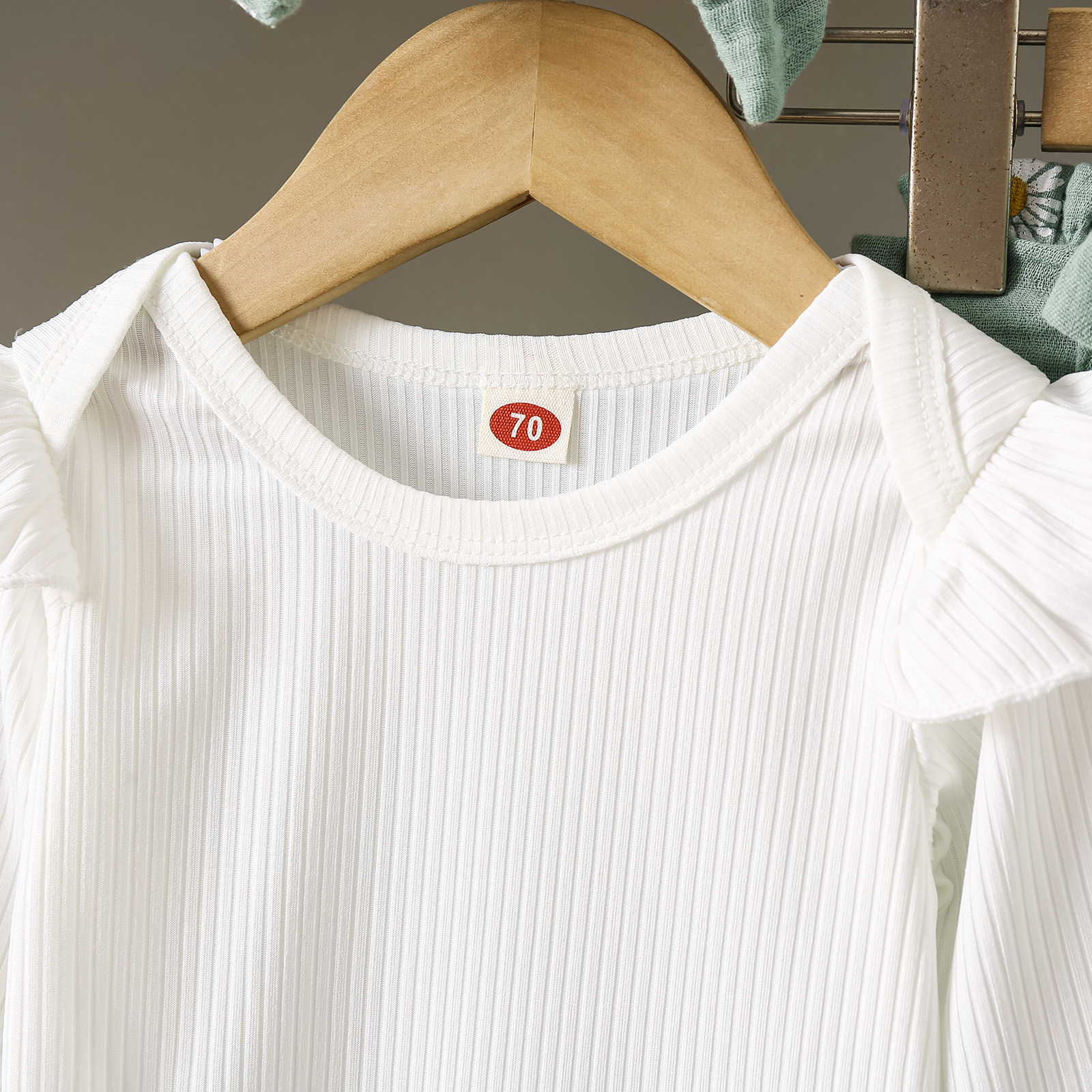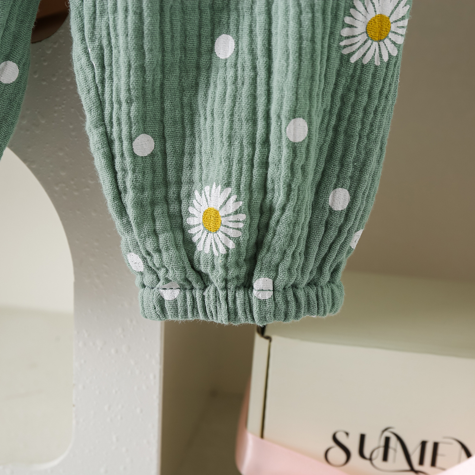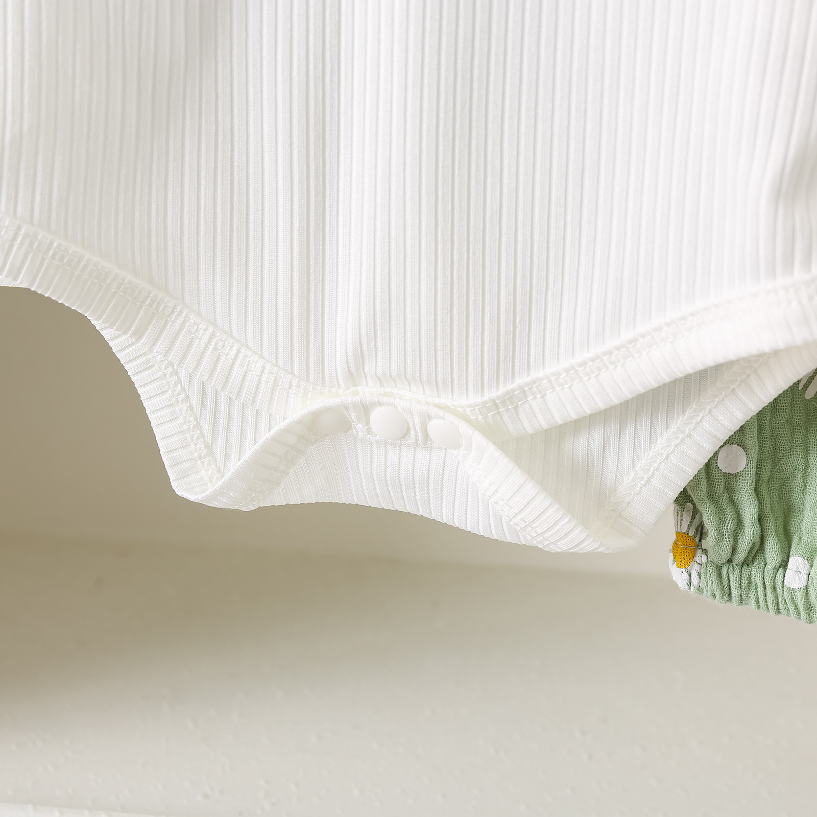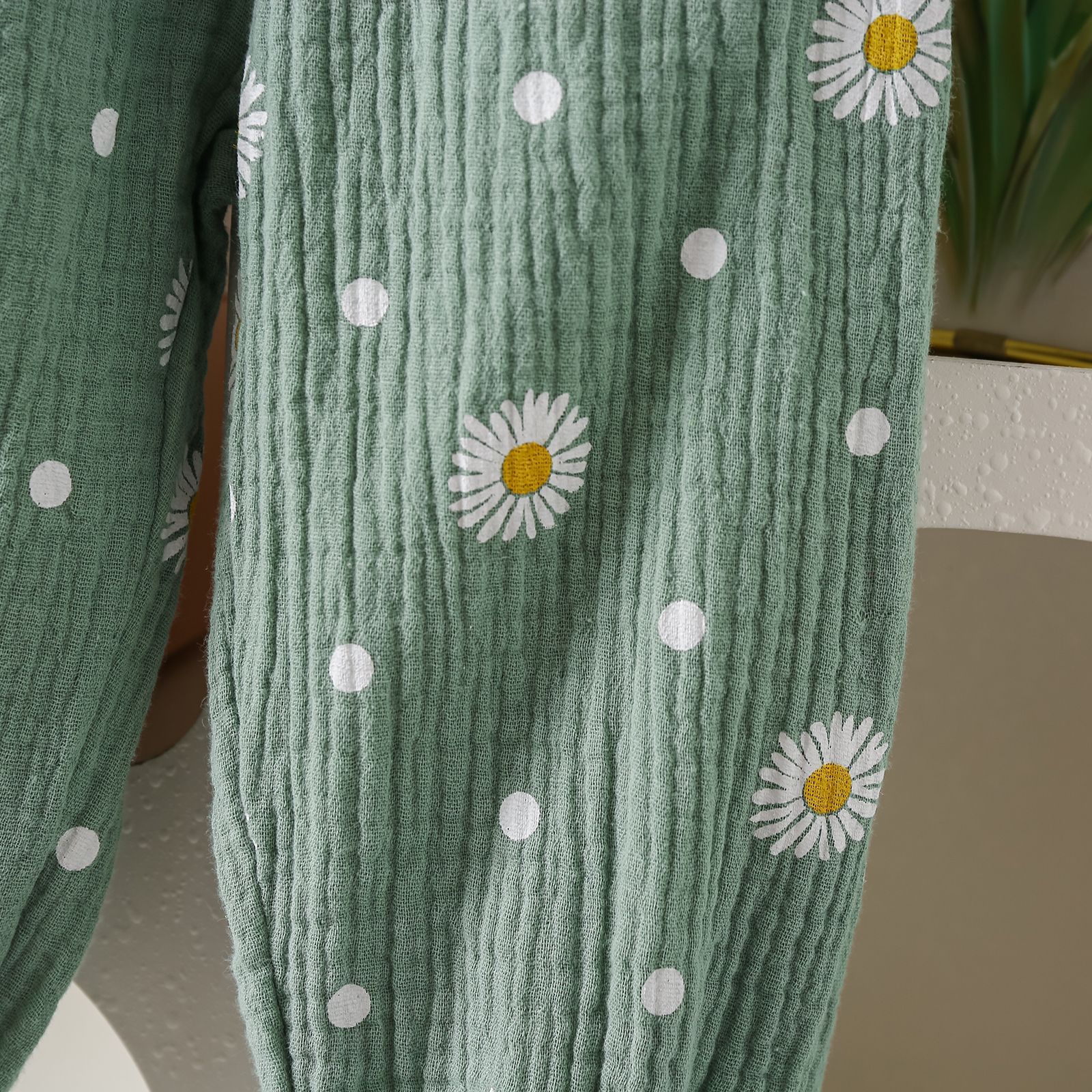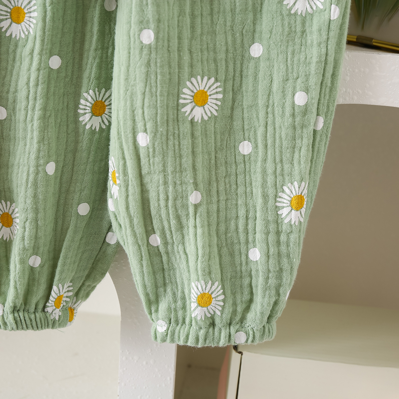 グリーンカーキ色のトップス:ポリエステル100%、パンツ:ポリエステル100% 白のトップス:綿95%、ポリウレタン5% パンツ:綿100%