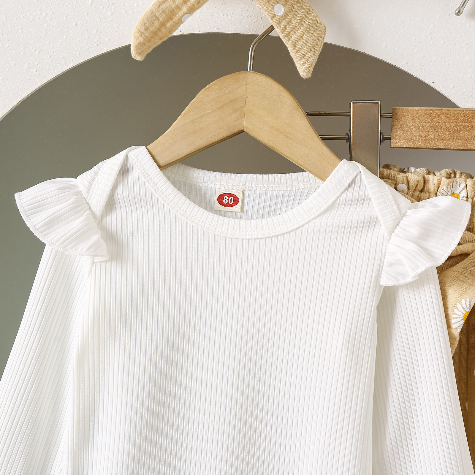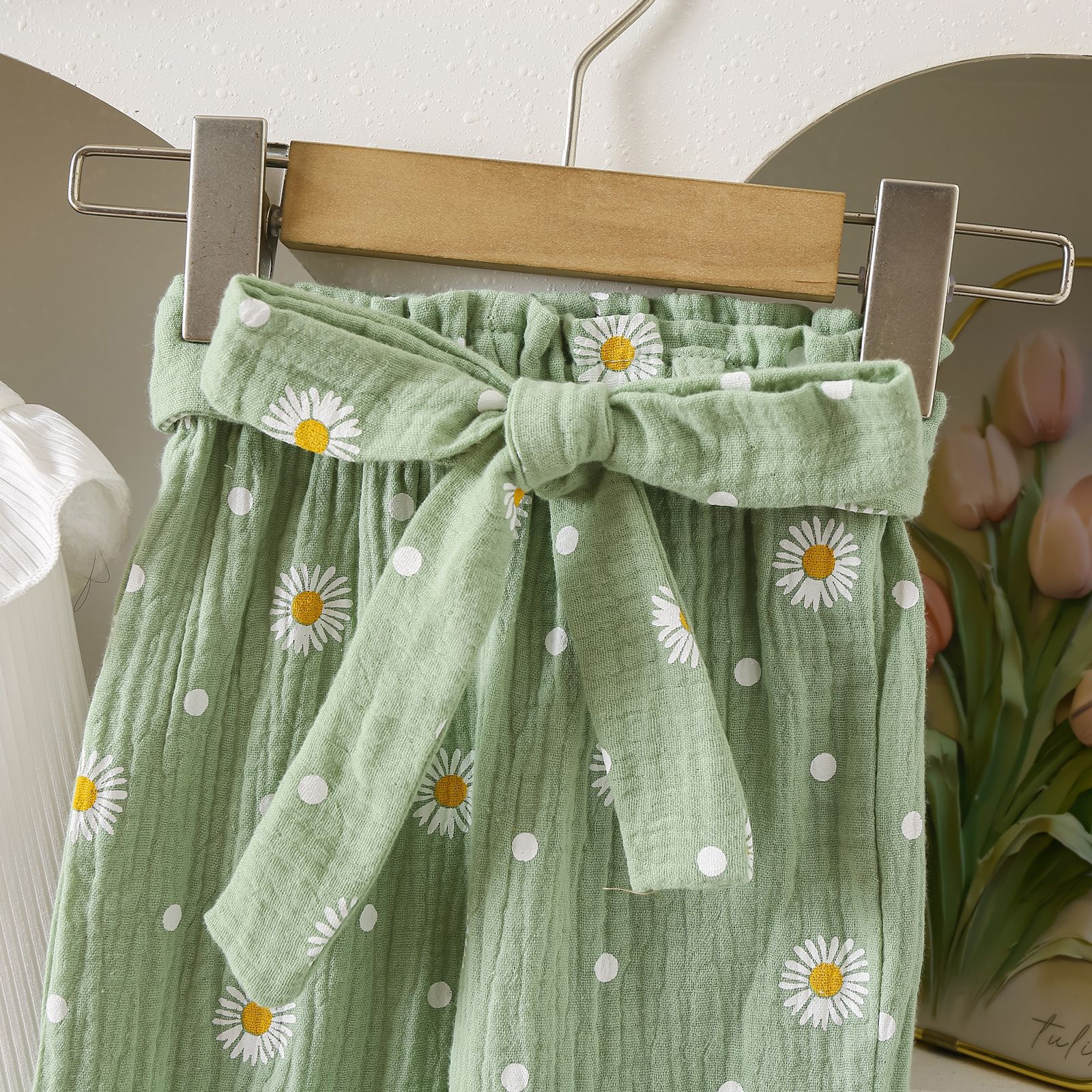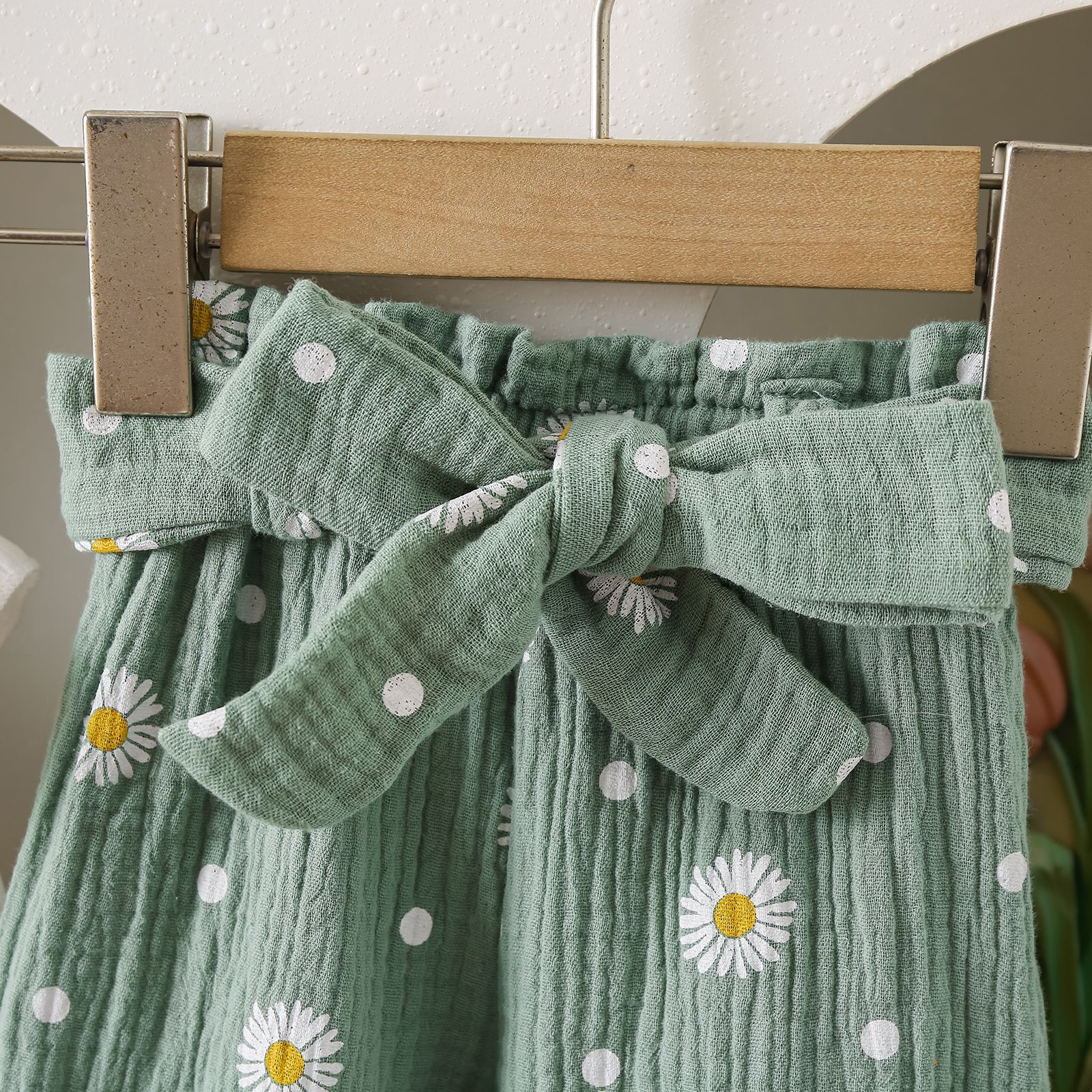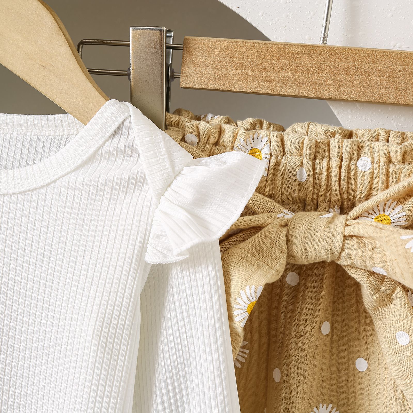グリーンカーキ色のトップス:ポリエステル100%、パンツ:ポリエステル100% 白のトップス:綿95%、ポリウレタン5% パンツ:綿100%