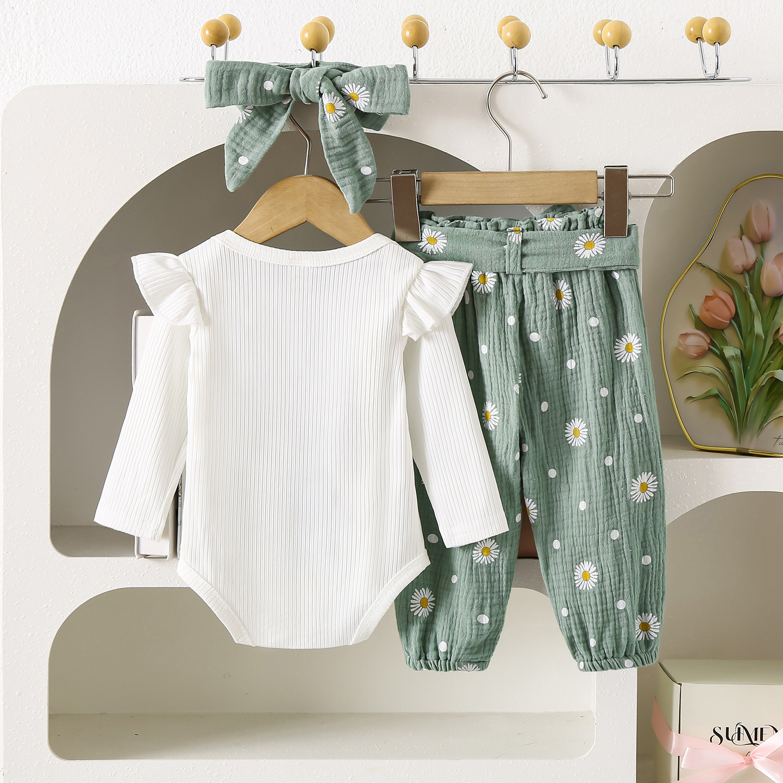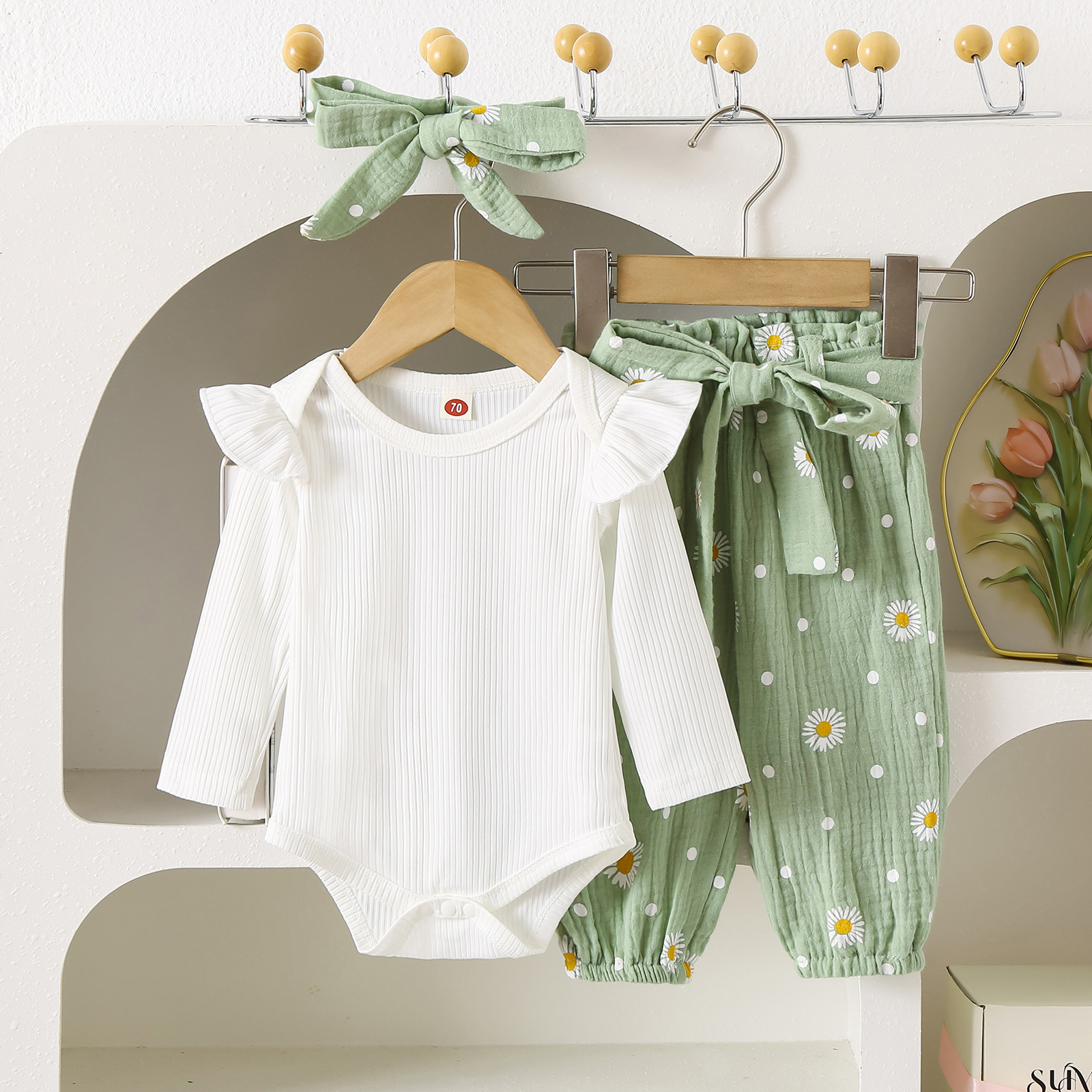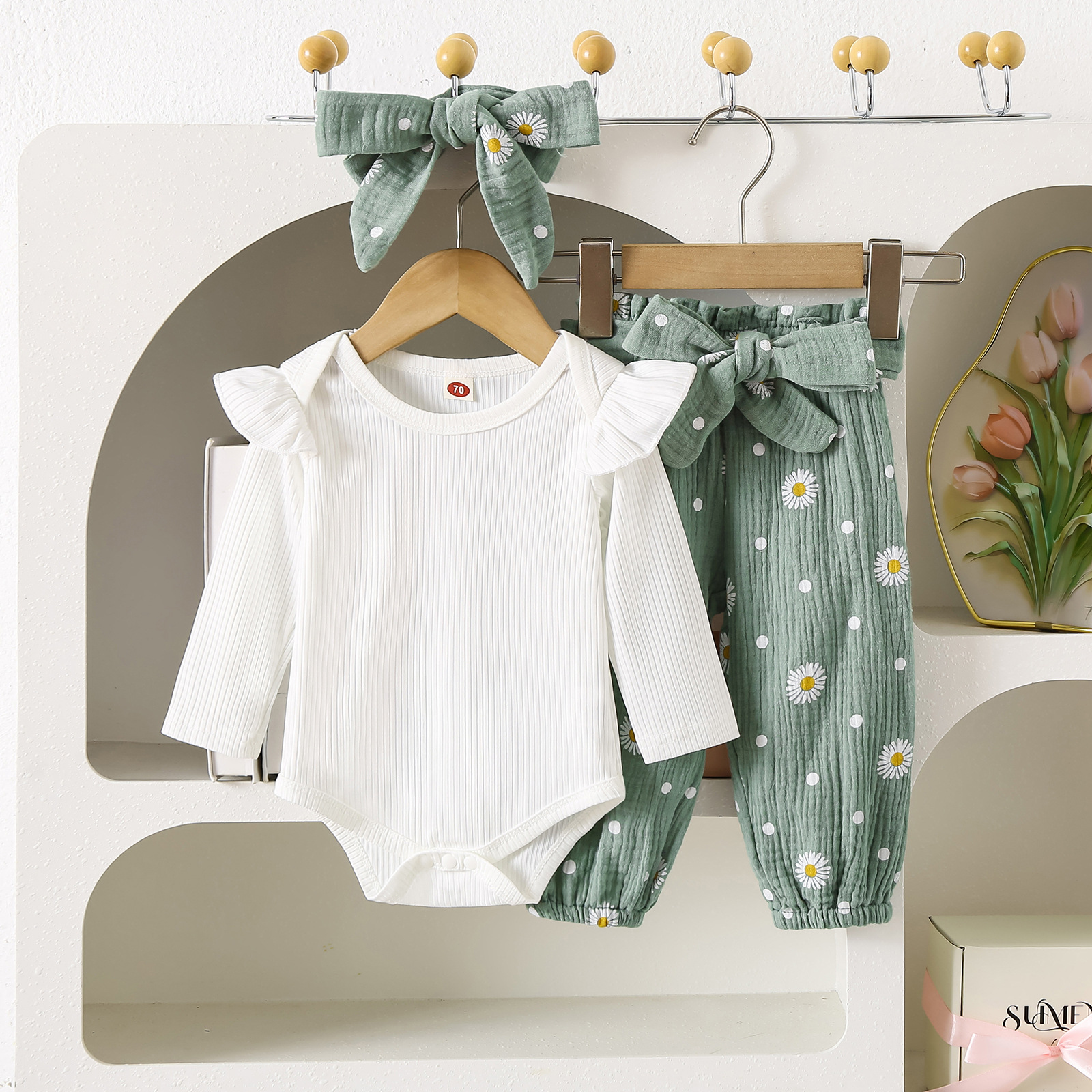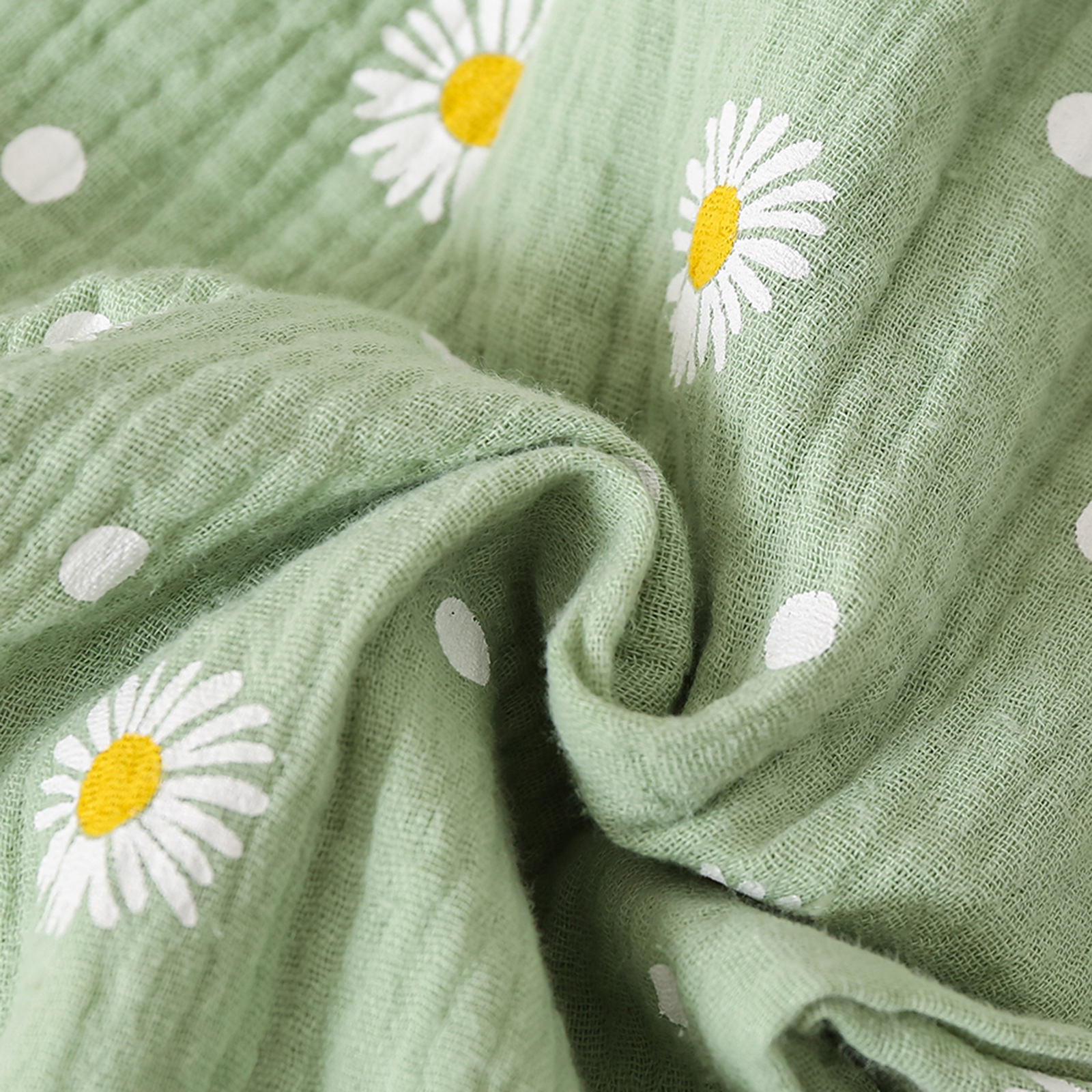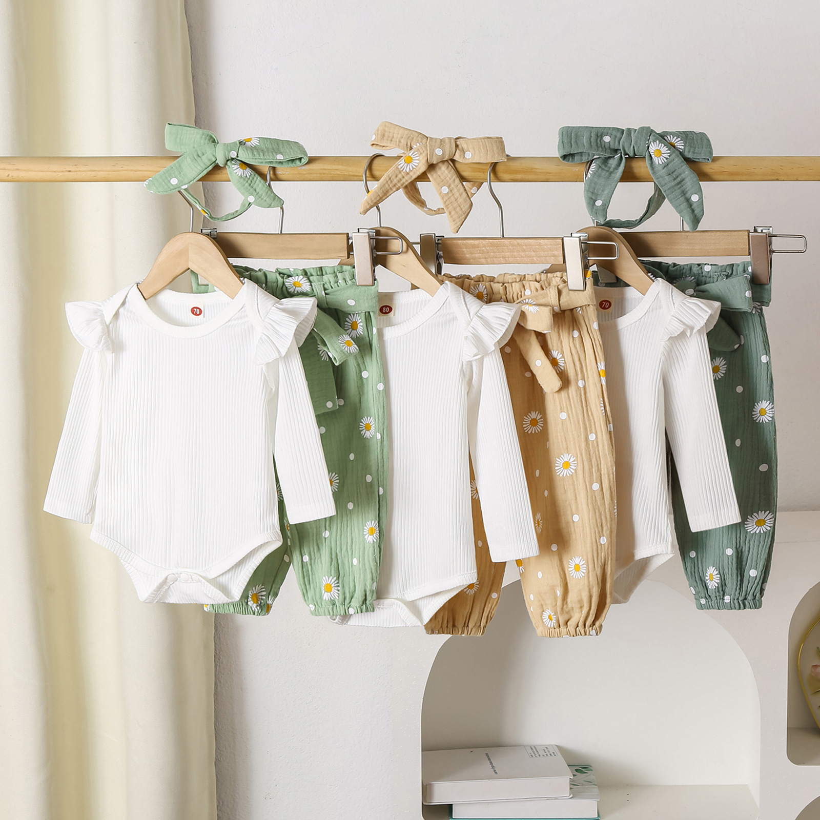 グリーンカーキ色のトップス:ポリエステル100%、パンツ:ポリエステル100% 白のトップス:綿95%、ポリウレタン5% パンツ:綿100%