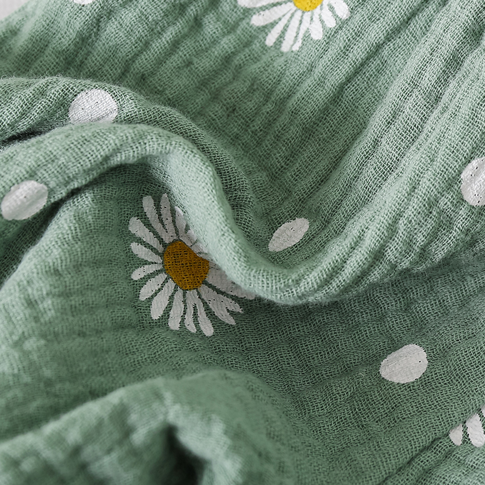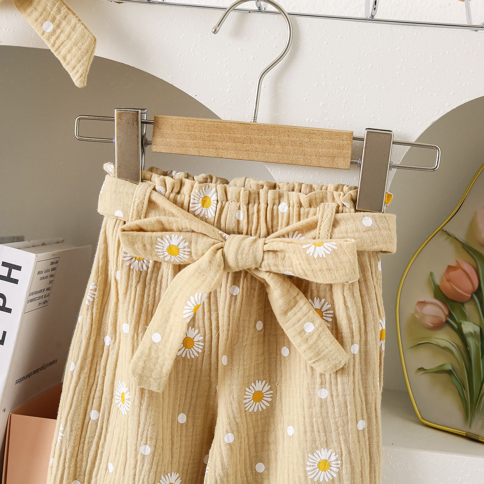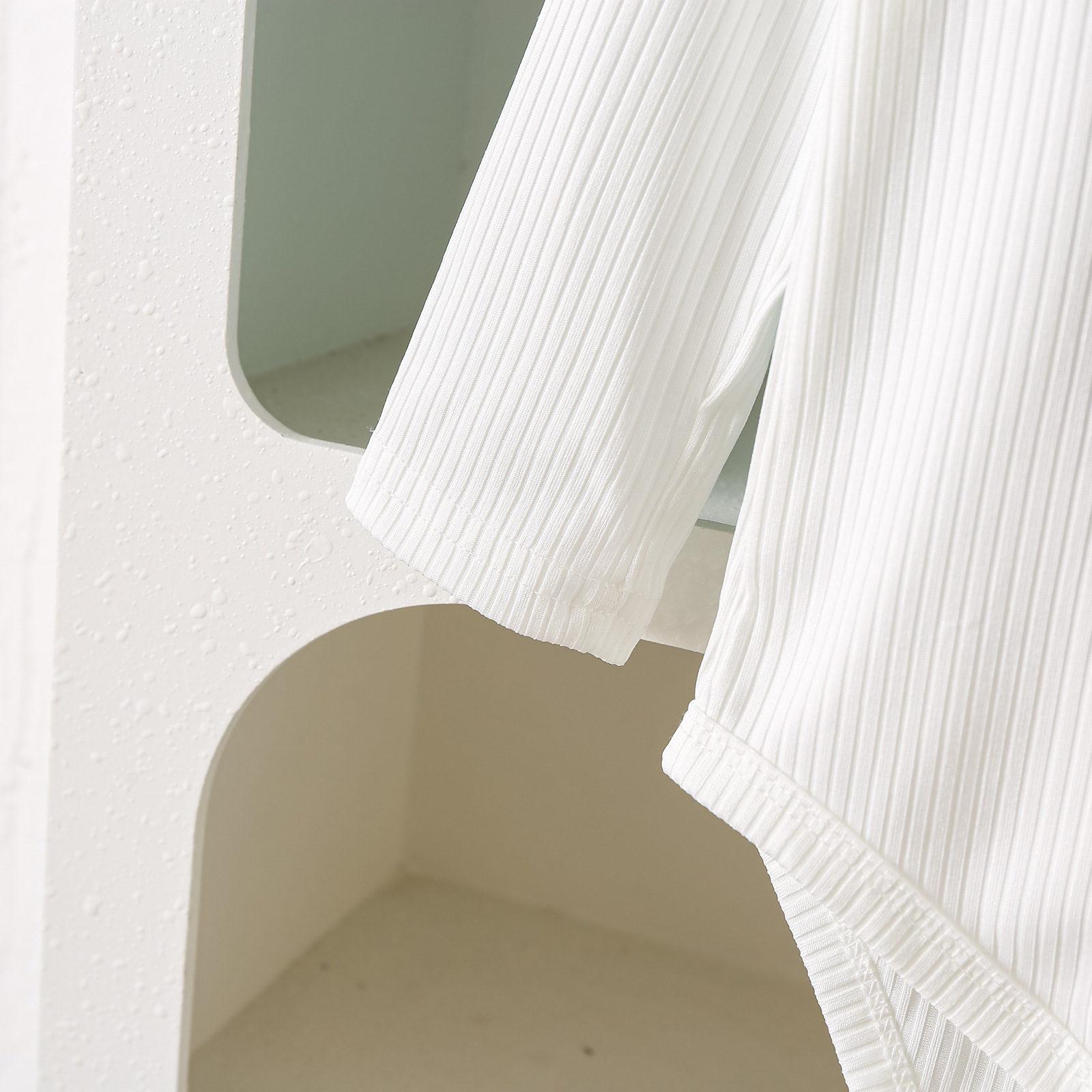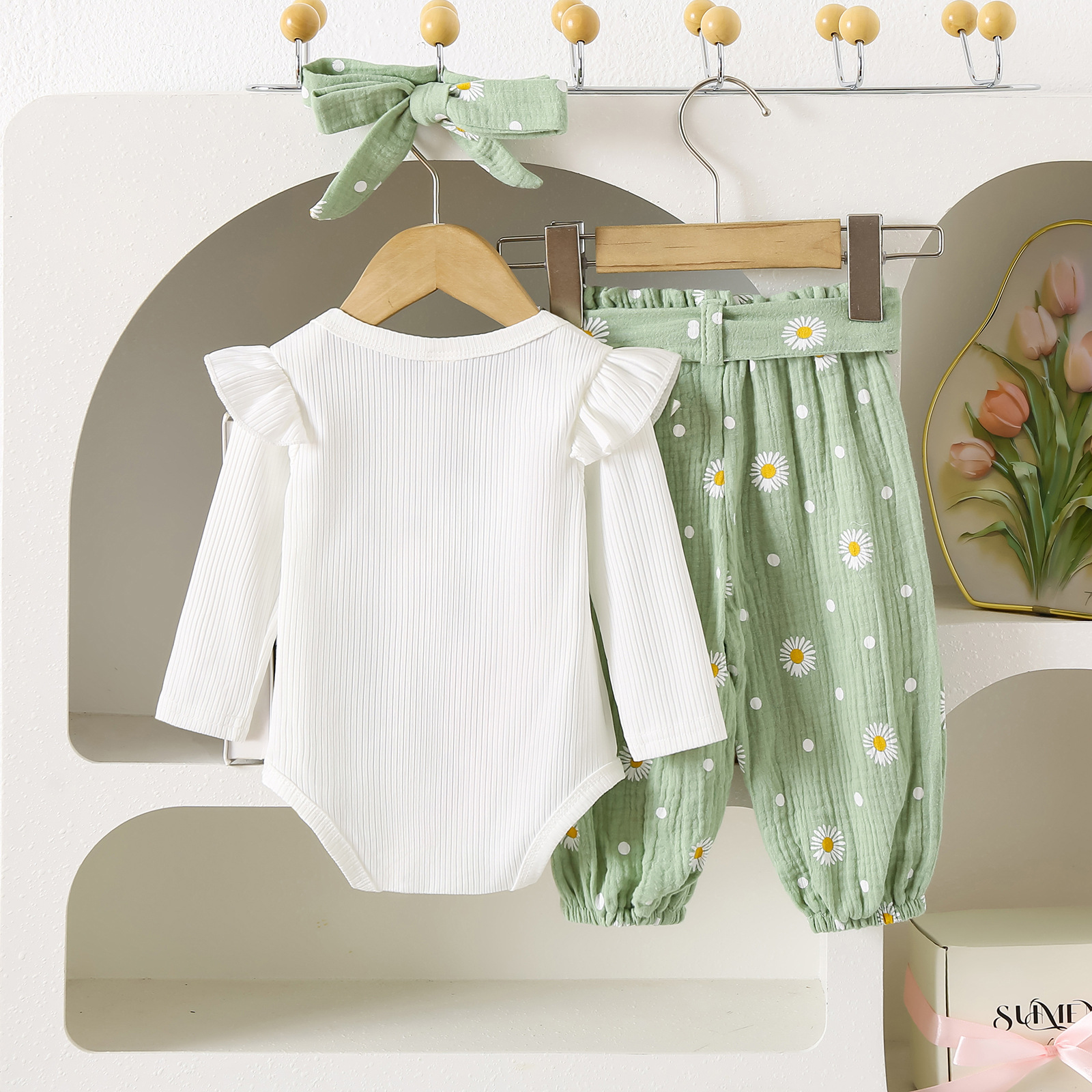 グリーンカーキ色のトップス:ポリエステル100%、パンツ:ポリエステル100% 白のトップス:綿95%、ポリウレタン5% パンツ:綿100%
