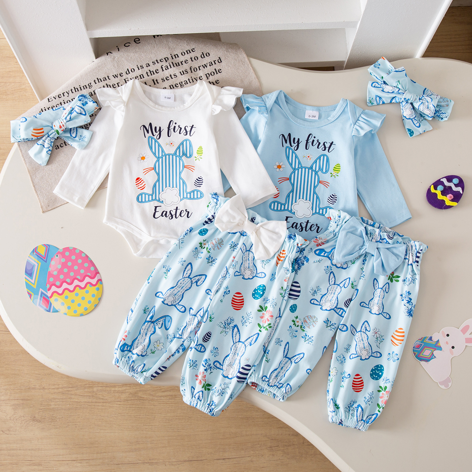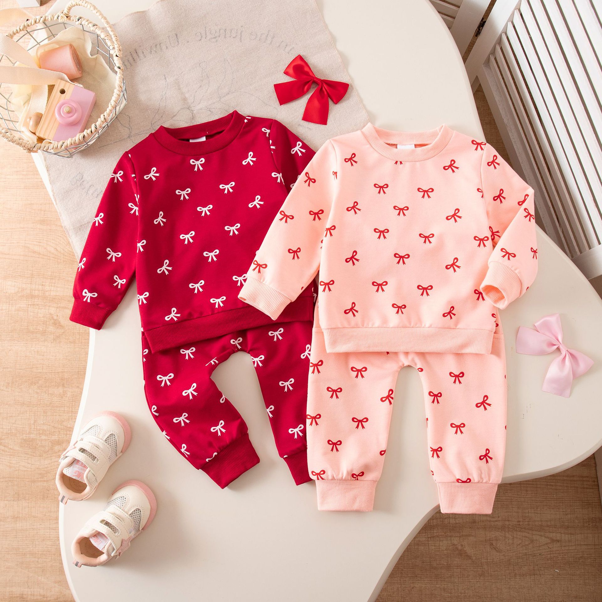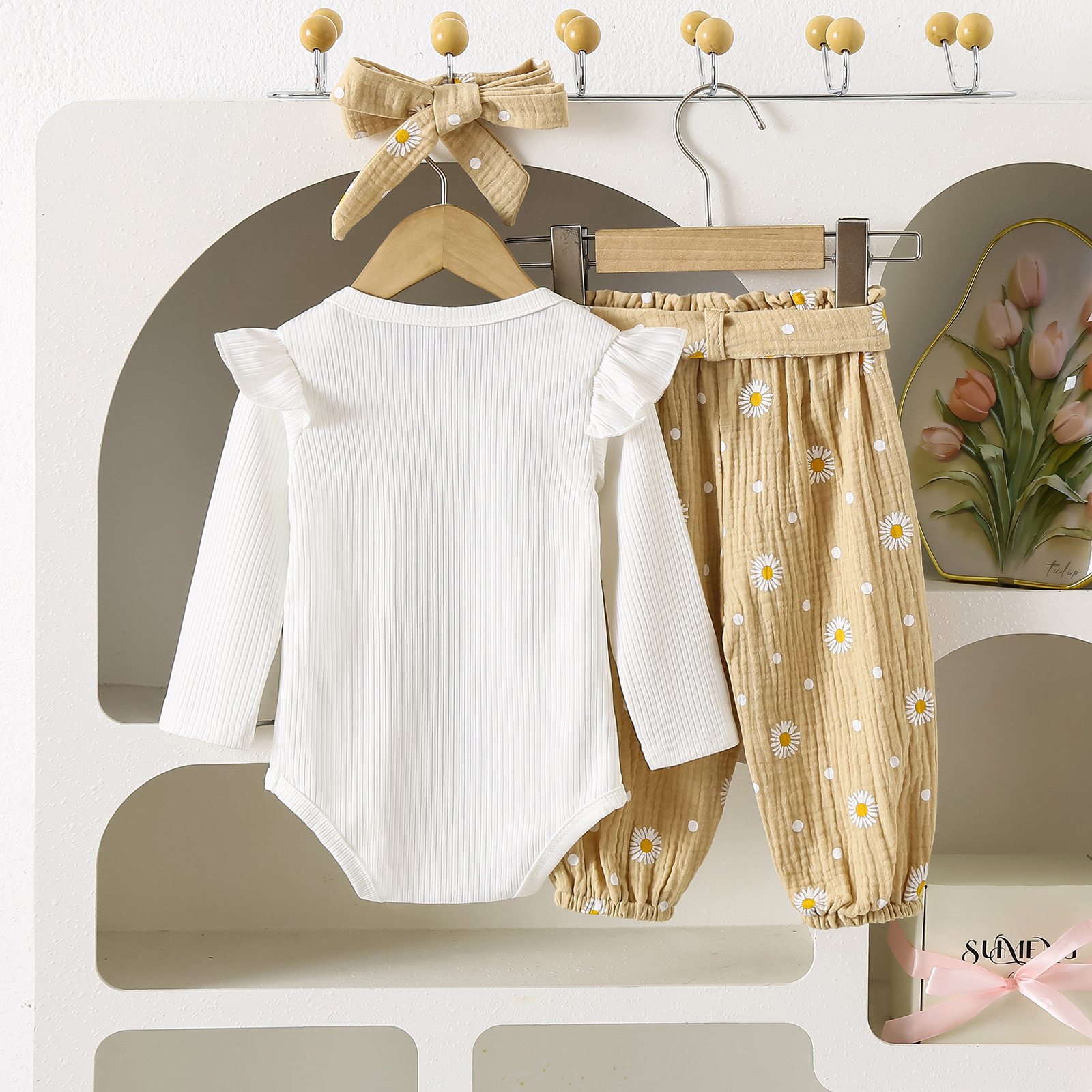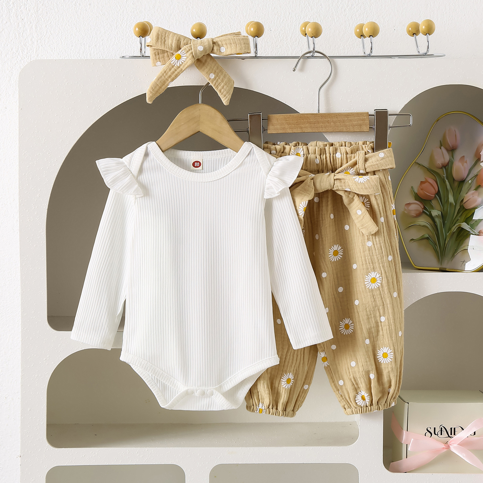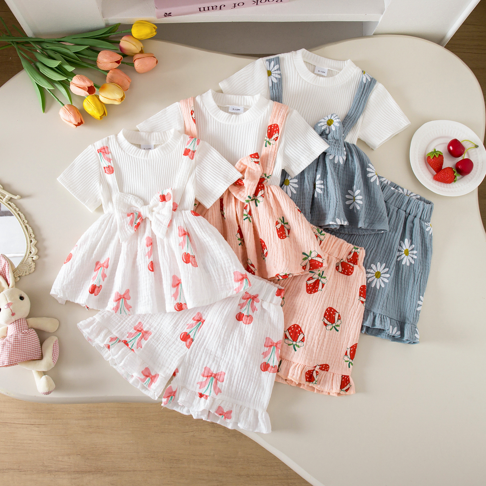 グリーンカーキ色のトップス:ポリエステル100%、パンツ:ポリエステル100% 白のトップス:綿95%、ポリウレタン5% パンツ:綿100%