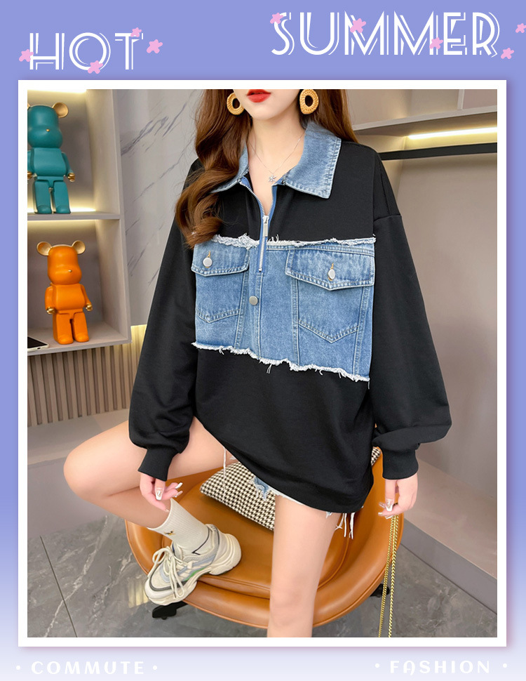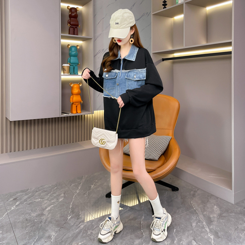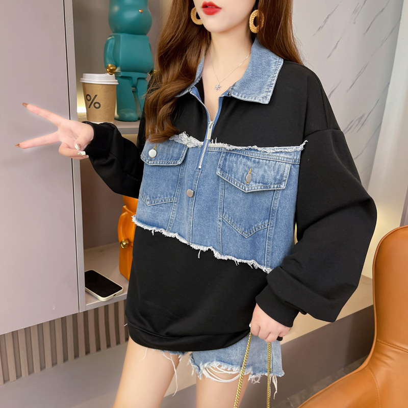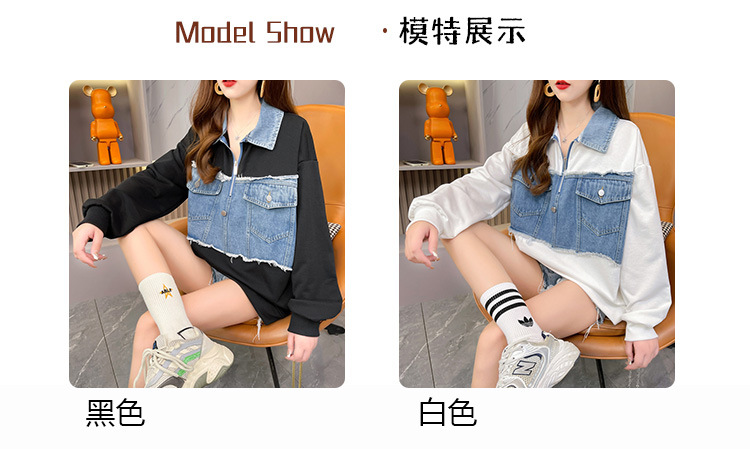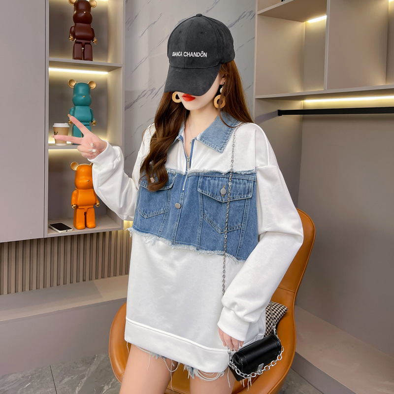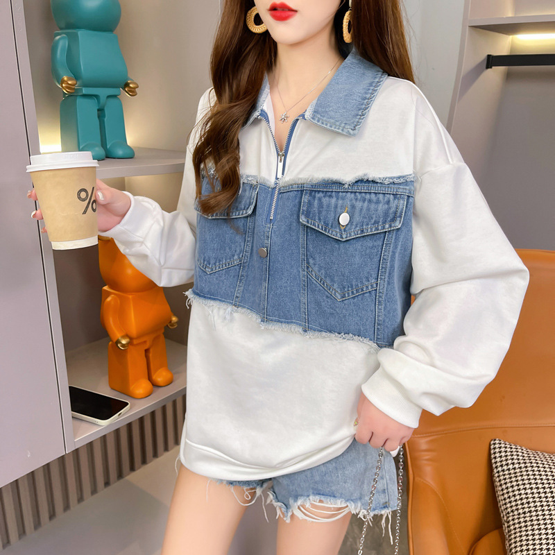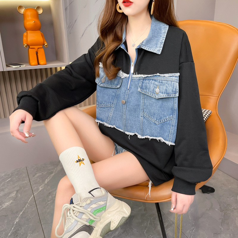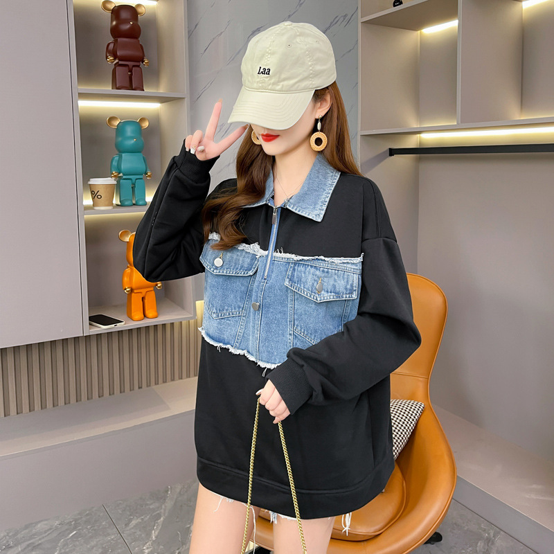 アメリカのレトロな高街の水洗いデニムの女性は長袖の大きいサイズのゆったりした半ファスナーのpolo襟の上着の女性をつなぎ合わせます。
