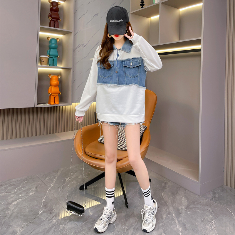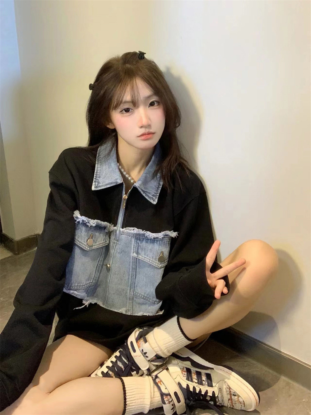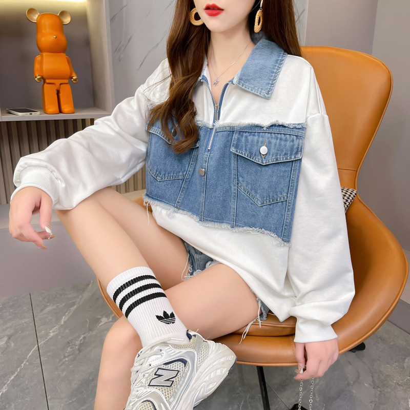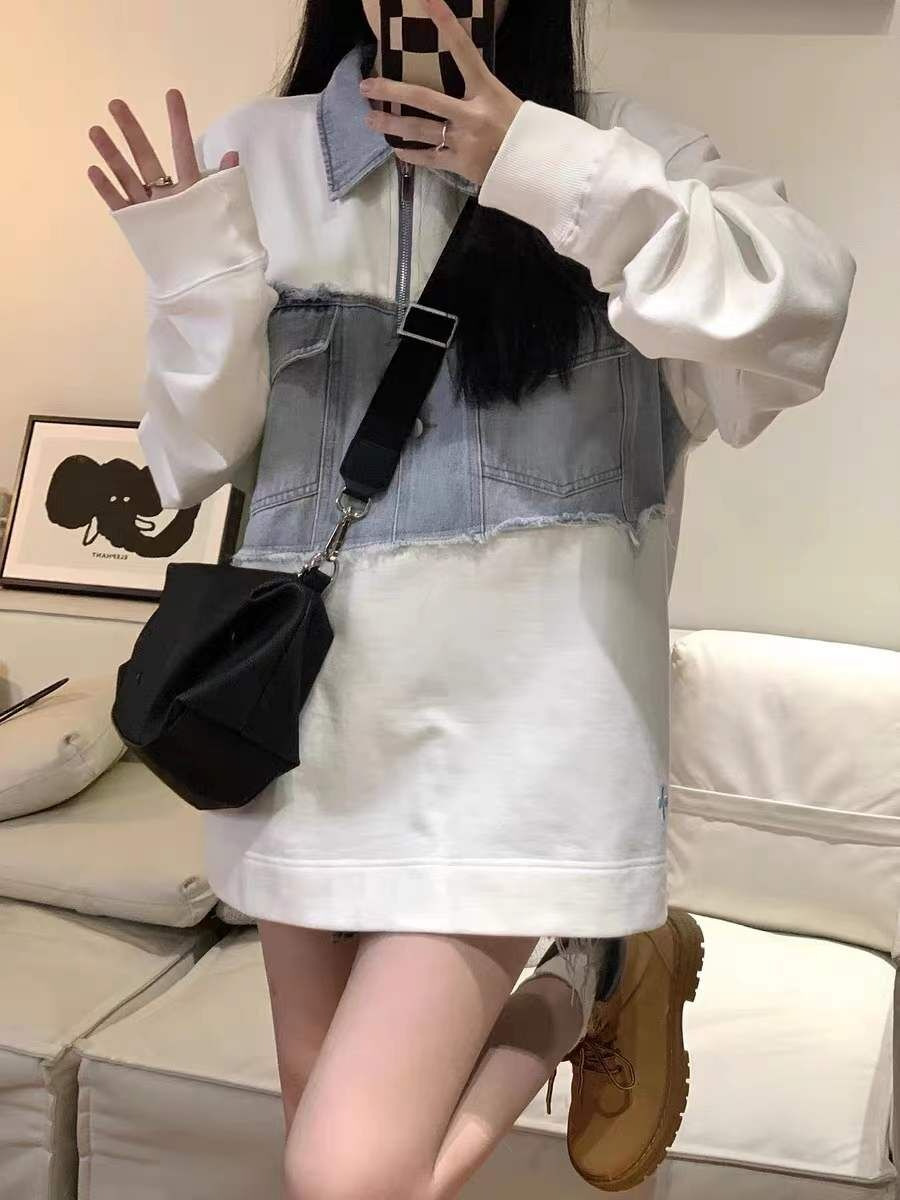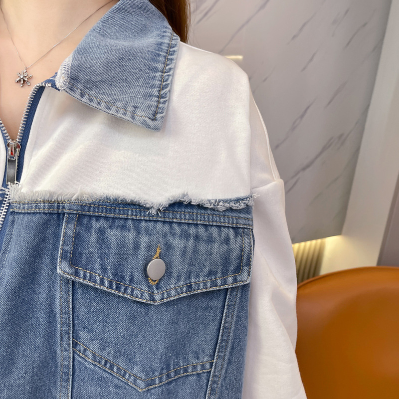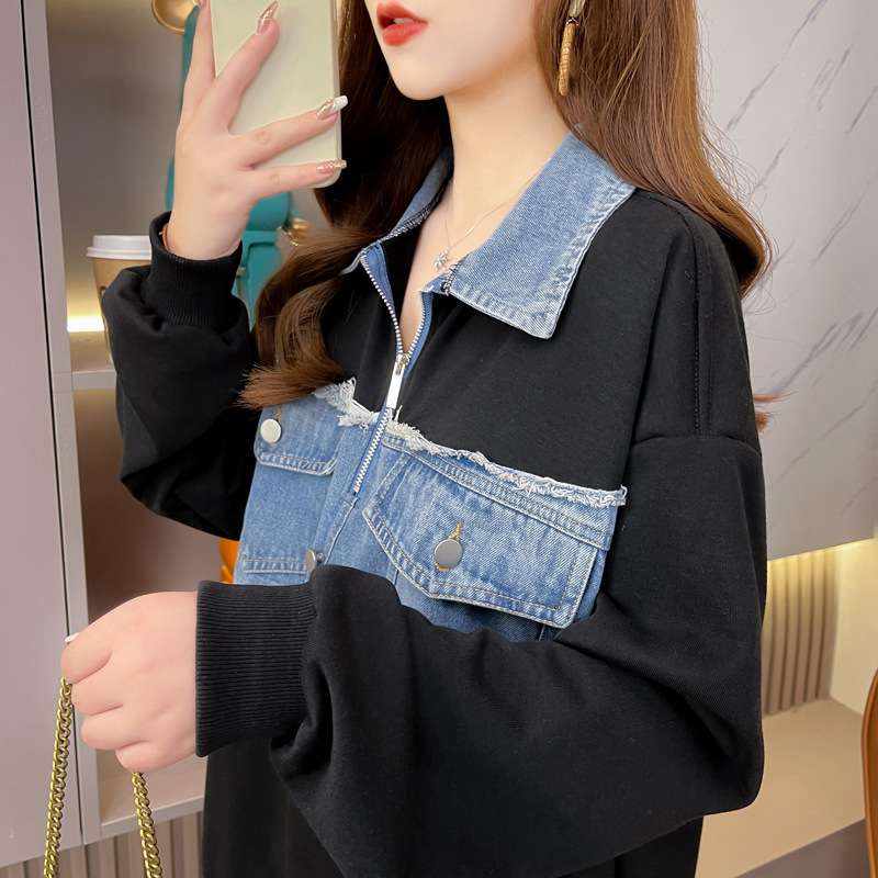 アメリカのレトロな高街の水洗いデニムの女性は長袖の大きいサイズのゆったりした半ファスナーのpolo襟の上着の女性をつなぎ合わせます。
