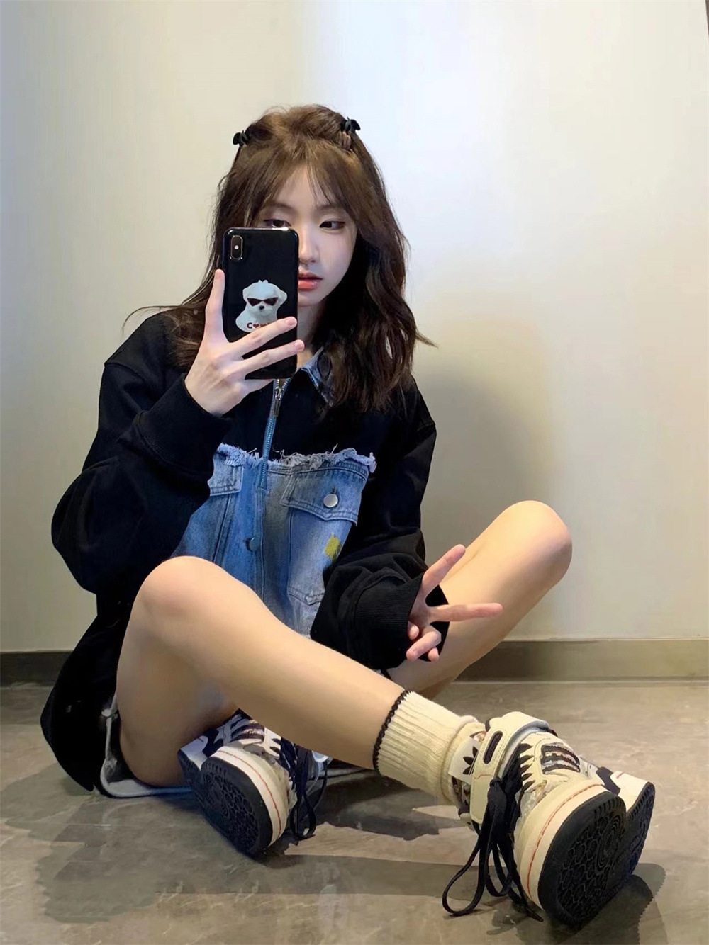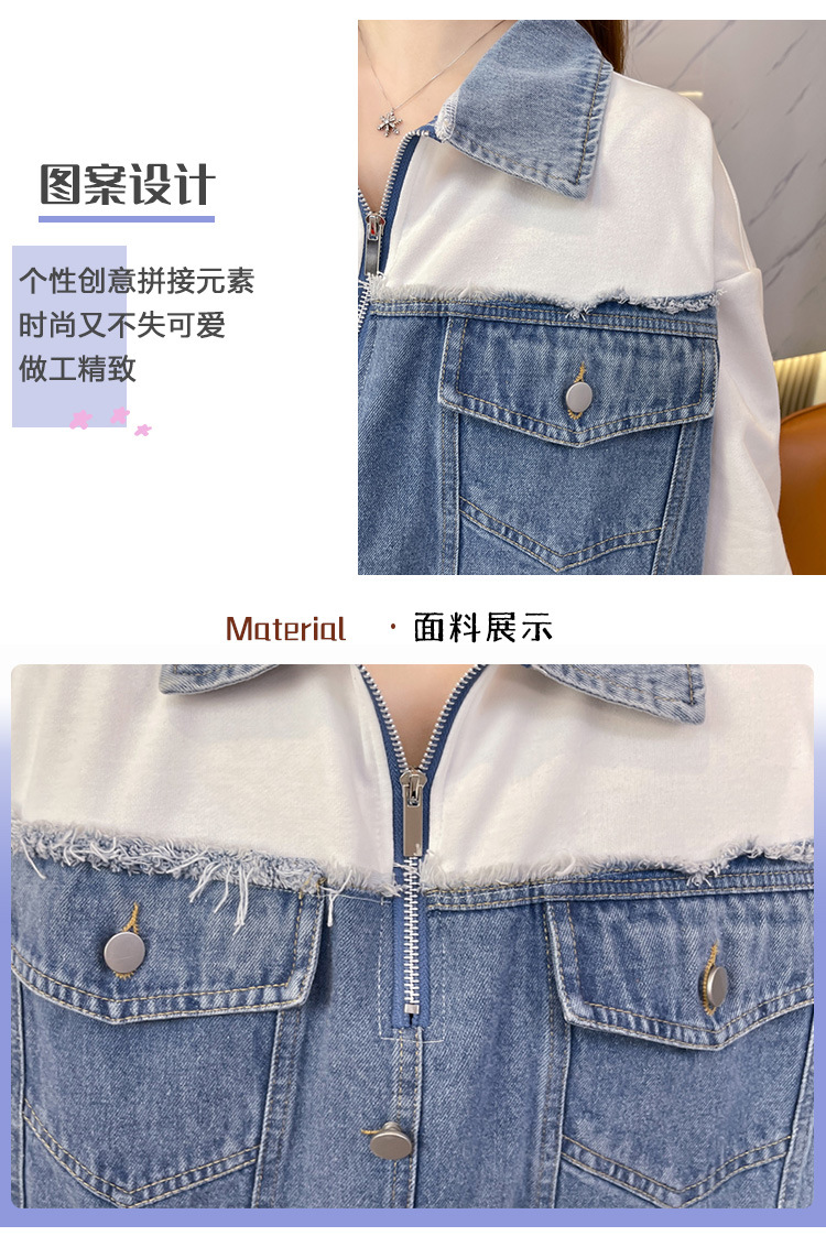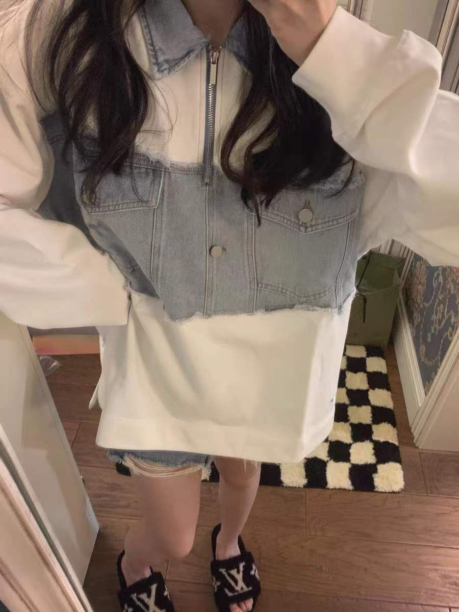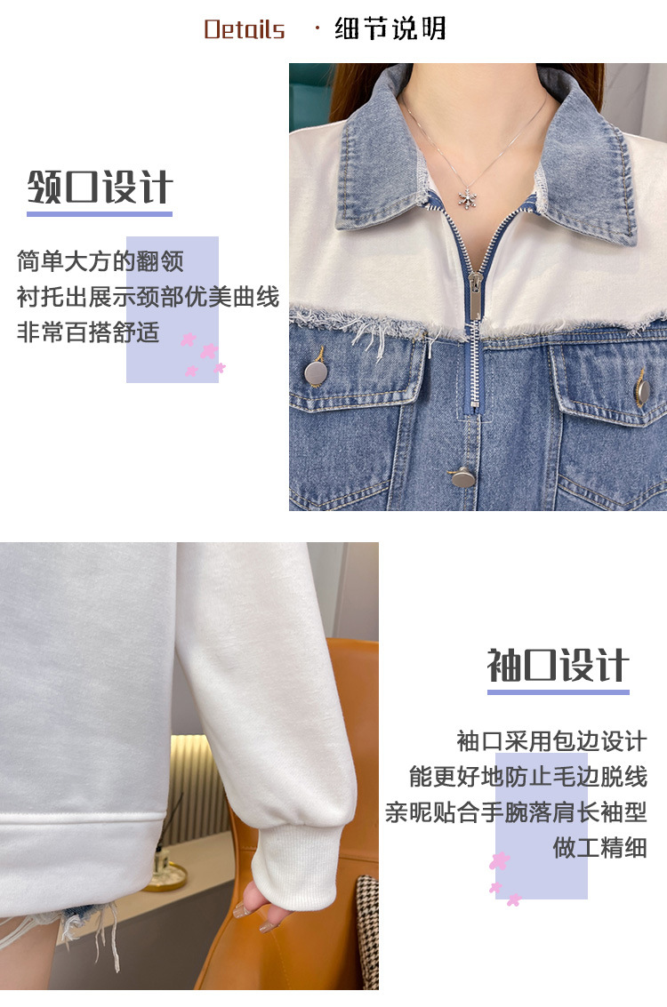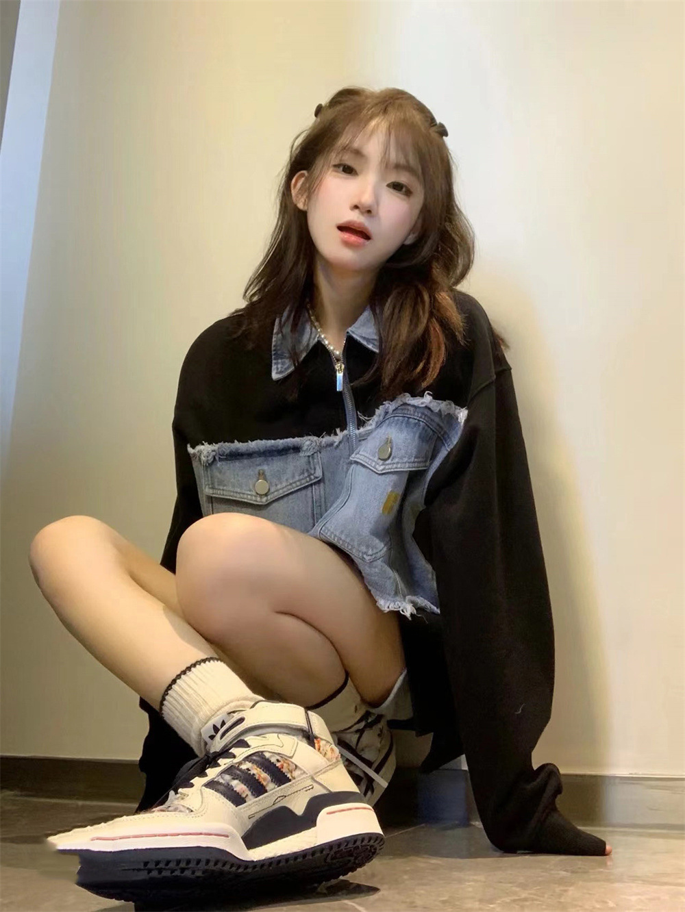 アメリカのレトロな高街の水洗いデニムの女性は長袖の大きいサイズのゆったりした半ファスナーのpolo襟の上着の女性をつなぎ合わせます。