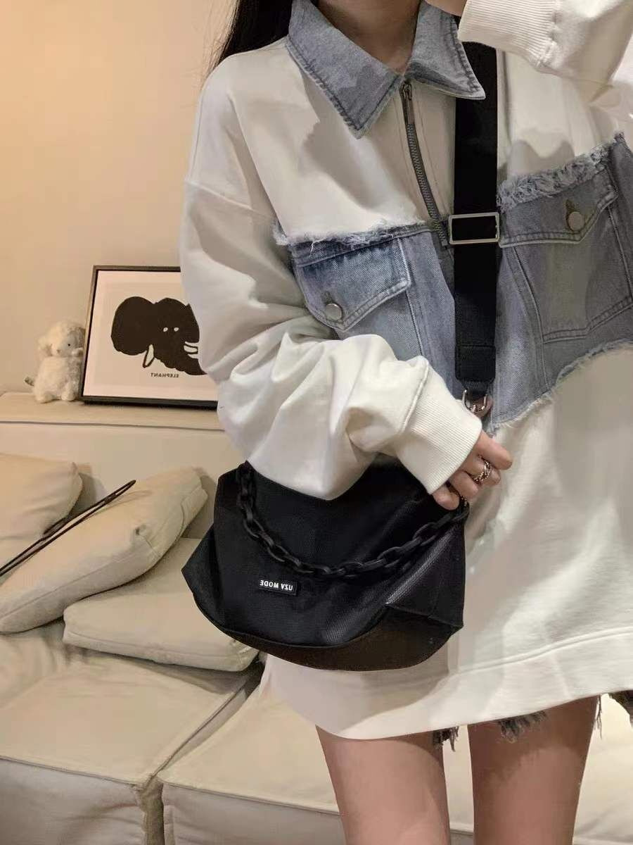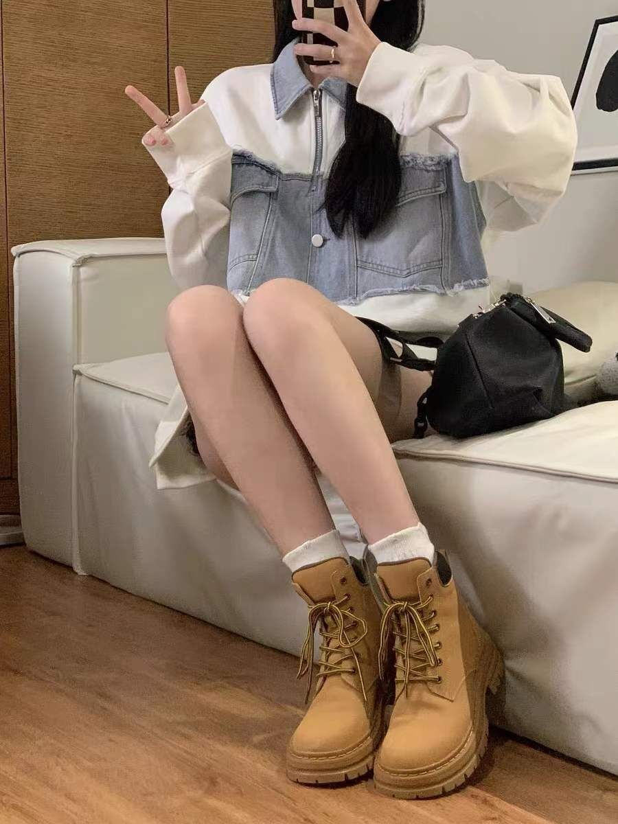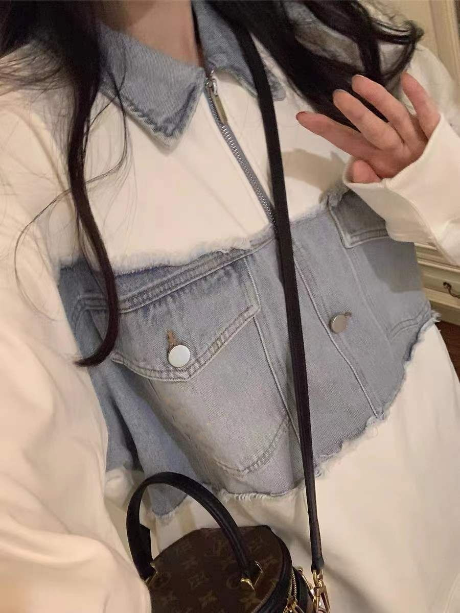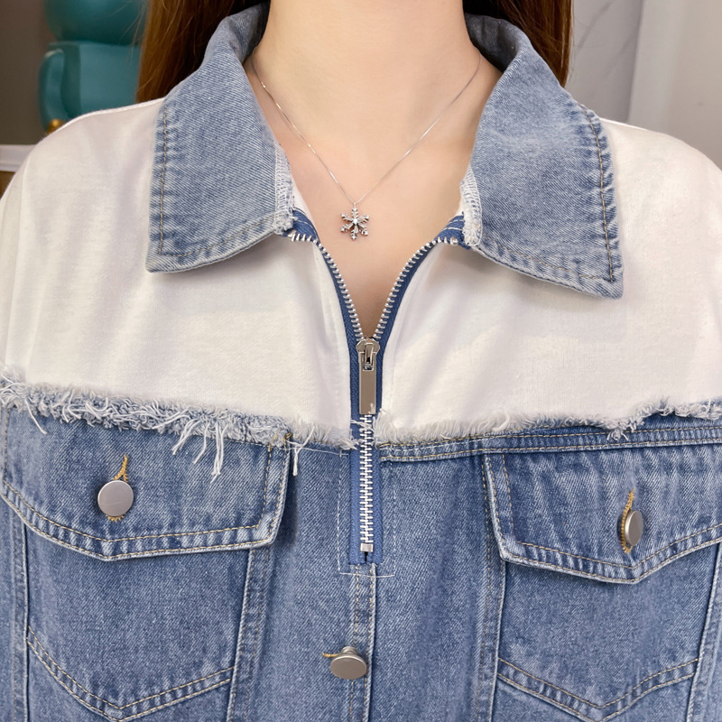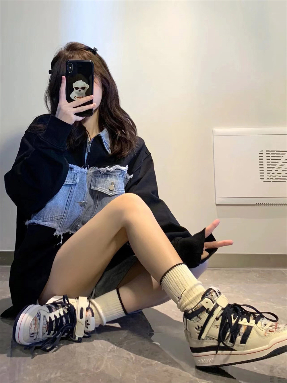アメリカのレトロな高街の水洗いデニムの女性は長袖の大きいサイズのゆったりした半ファスナーのpolo襟の上着の女性をつなぎ合わせます。