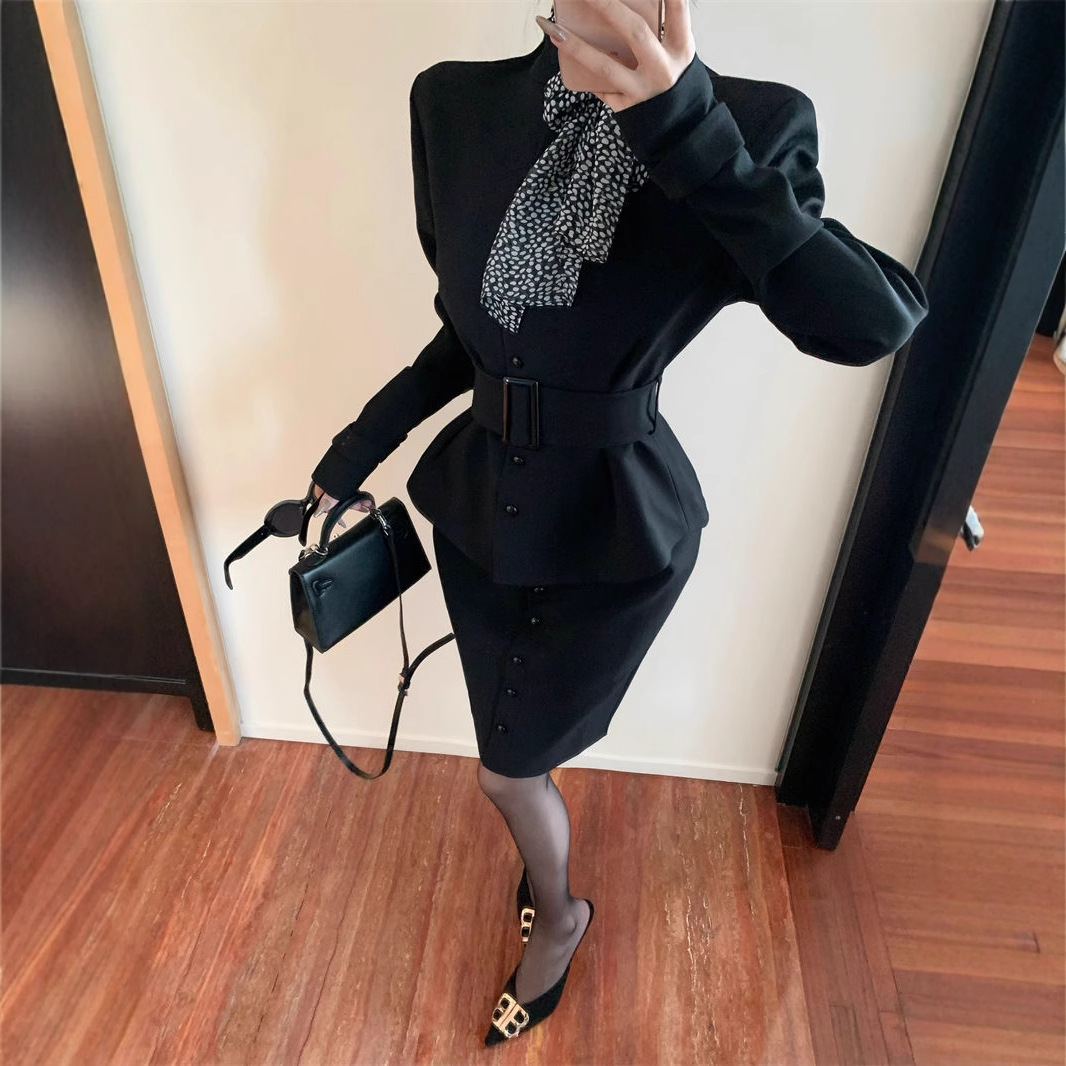 Yujie ハイエンド黒ウエストスーツジャケット水玉シャツ女性の 2025 新しいヒップカバースカート 3 点セット