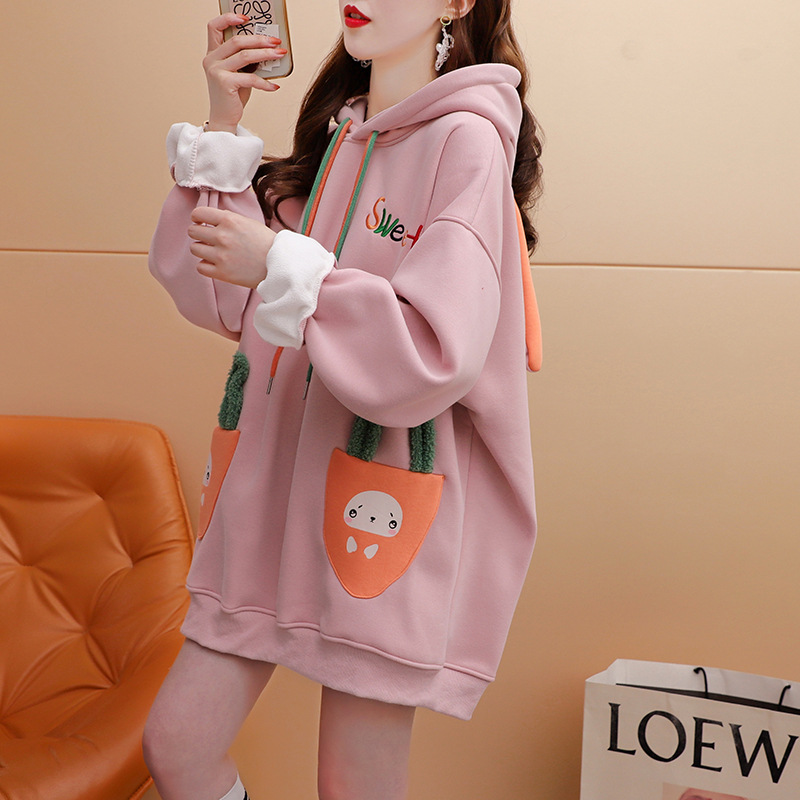 厚手のスウェットの女性は冬のファッションがゆったりしていて、やせています。2023年の漫画のウサギのアルファベットの刺繍と帽子のスウェットの女性の潮があります。