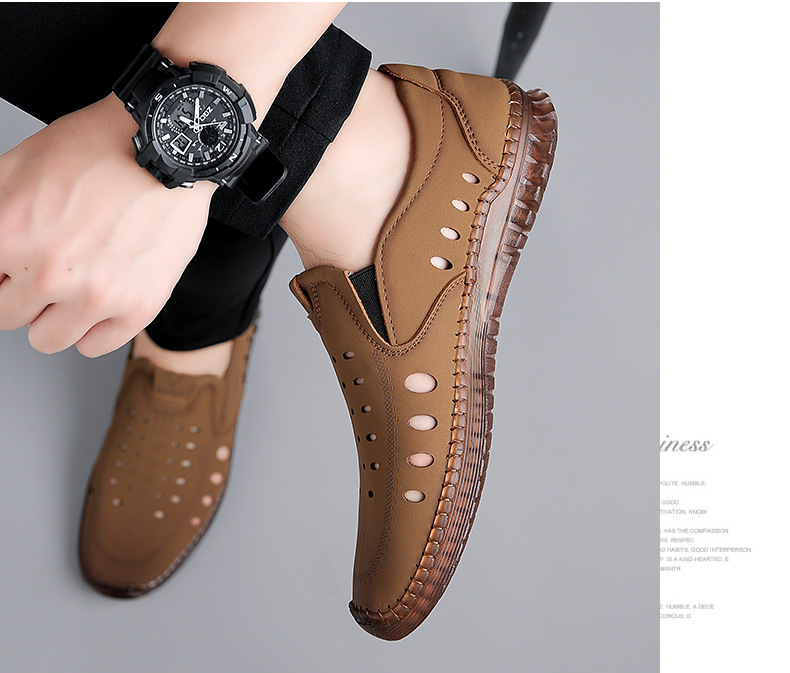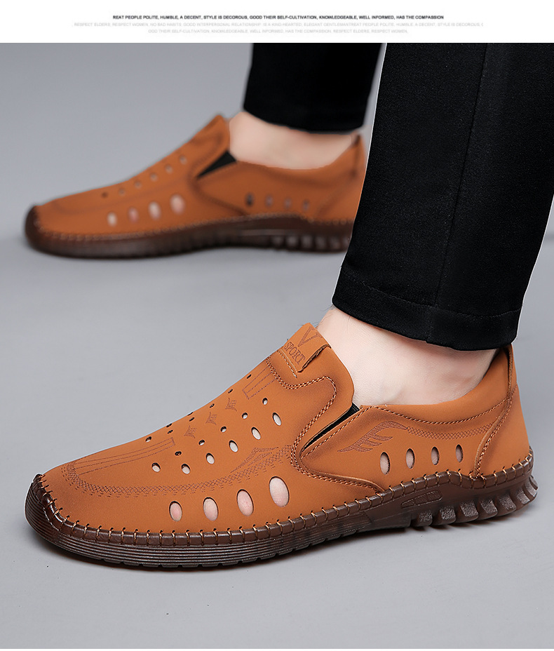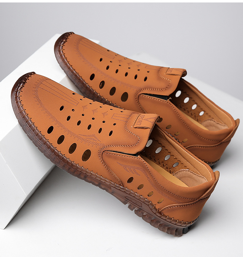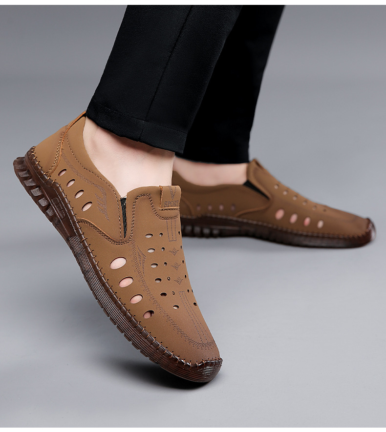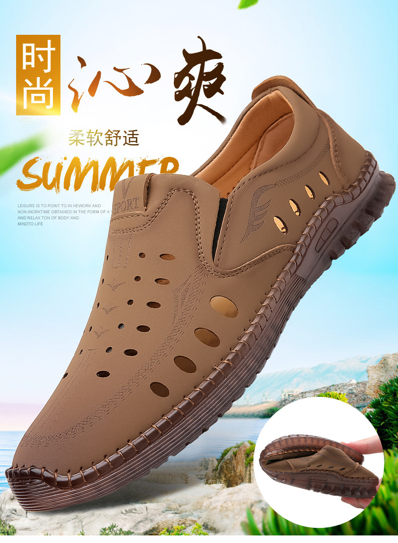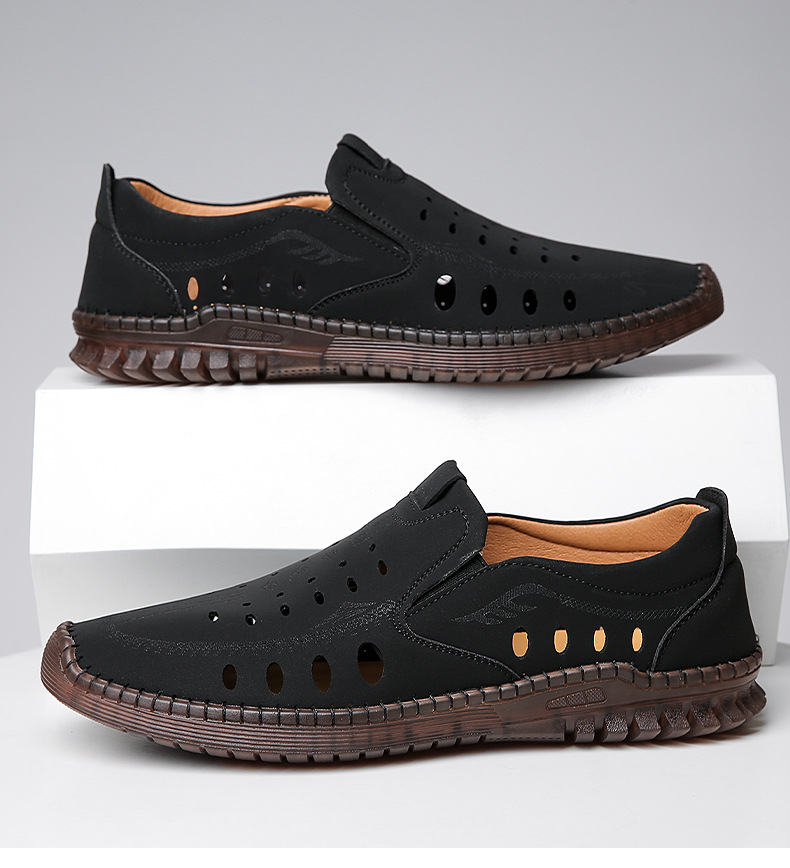 男性カジュアル靴夏の新型透かし彫り滑り止め通気性牛筋底皮サンダル