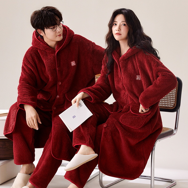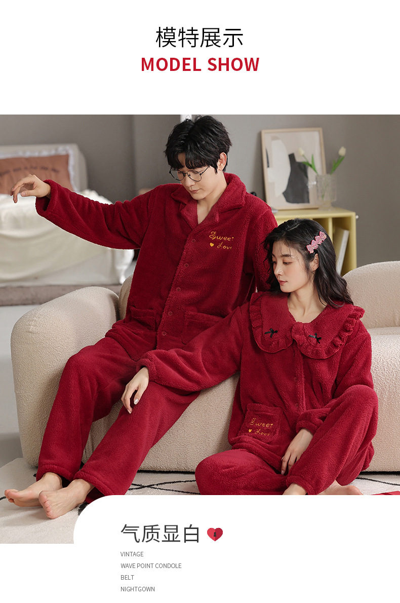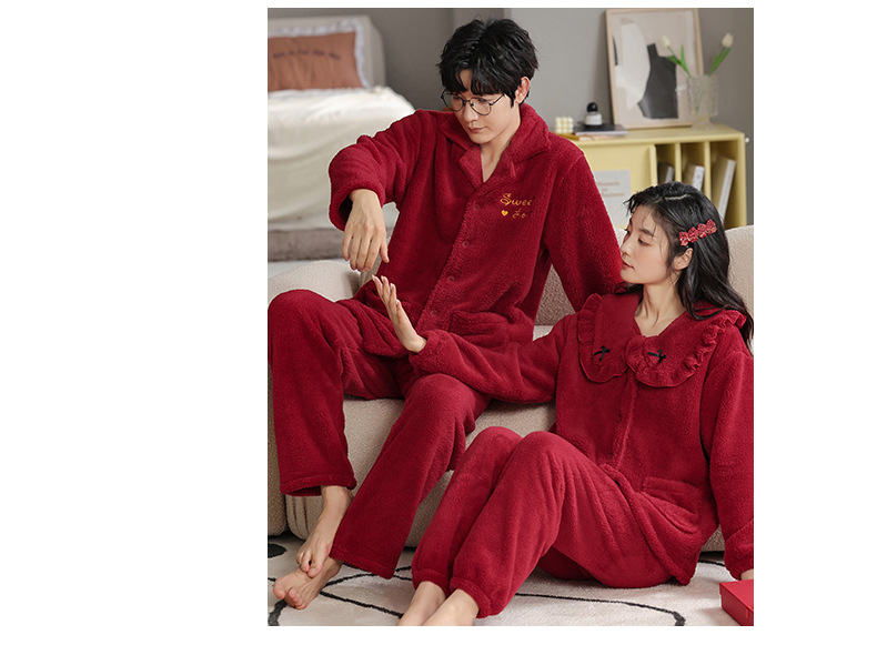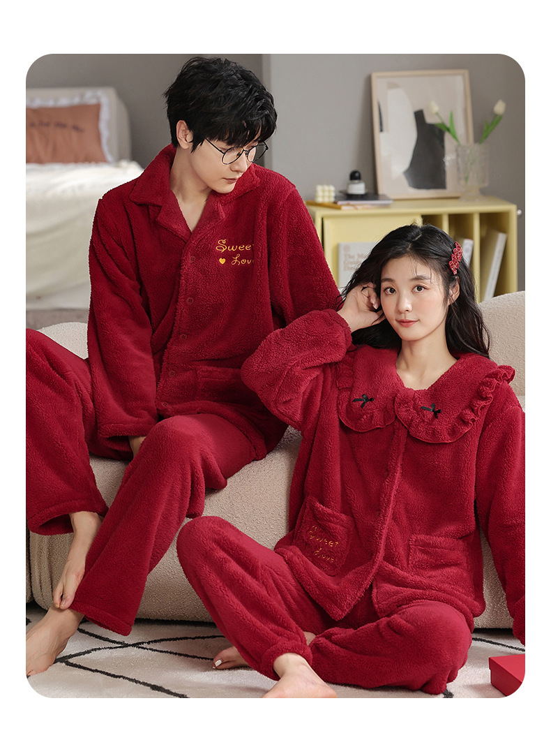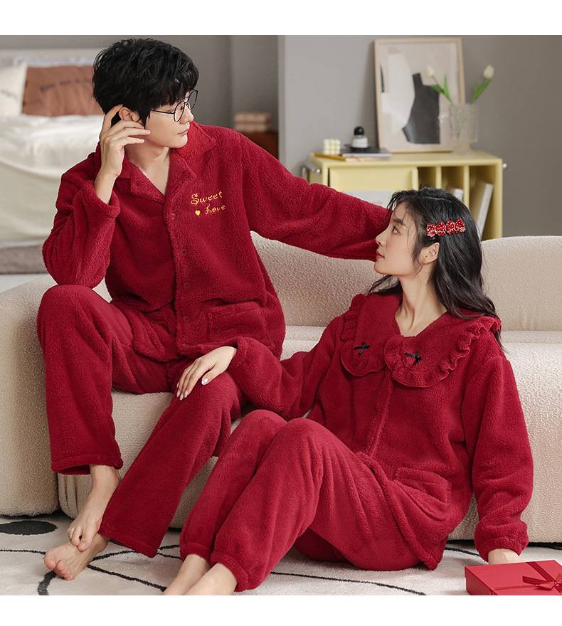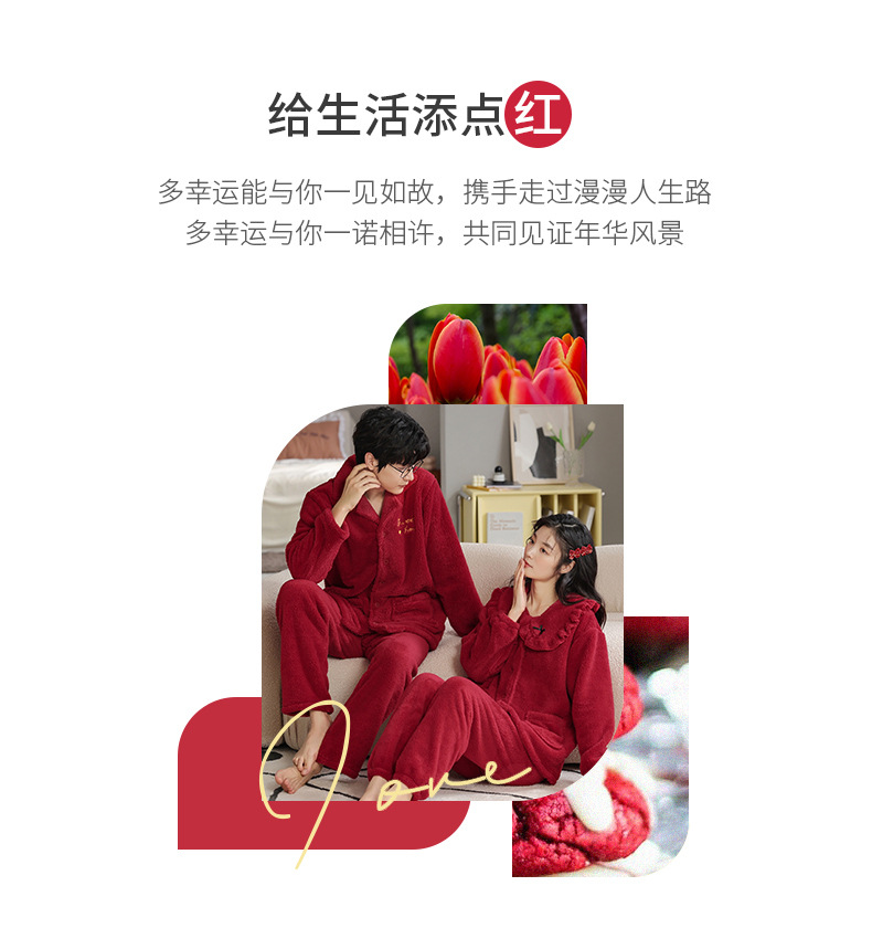 フランネルパジャマ女性冬の新しい赤い新婚のお祝い風サンゴのベルベット保温結婚家庭服セット男性