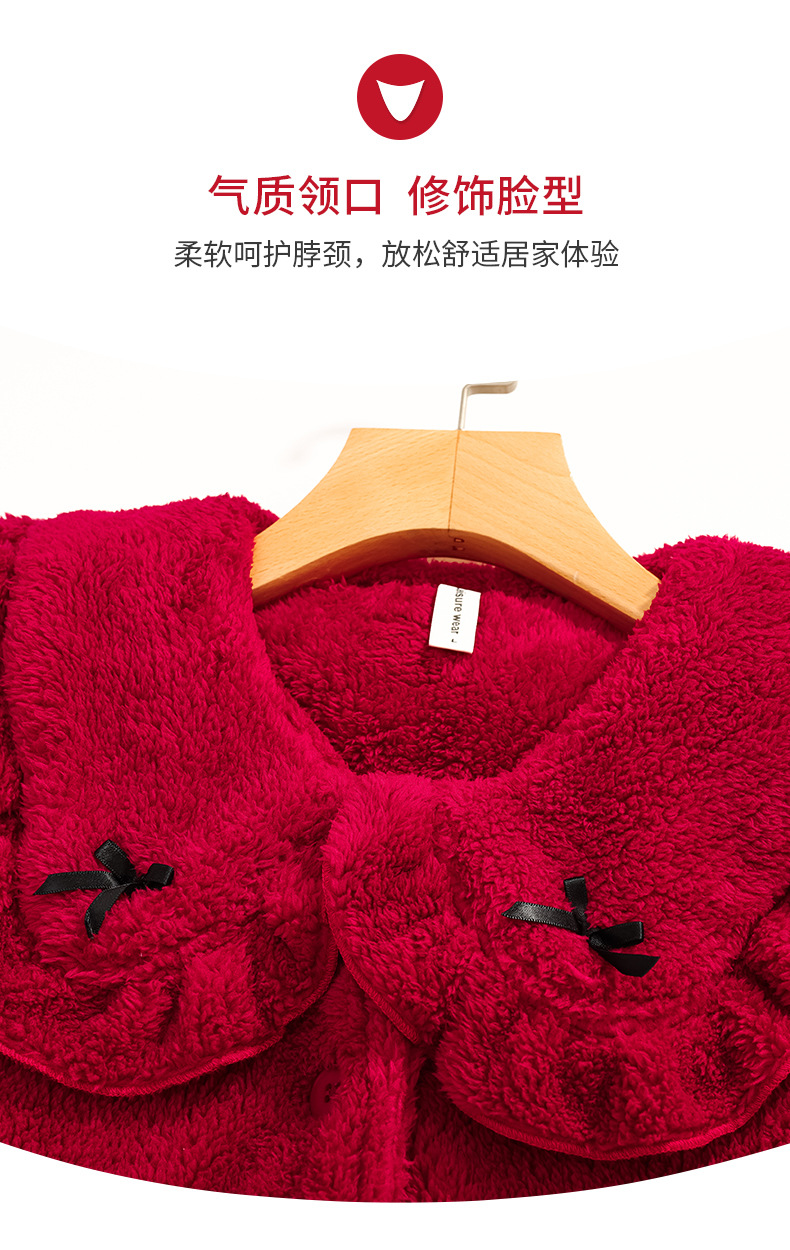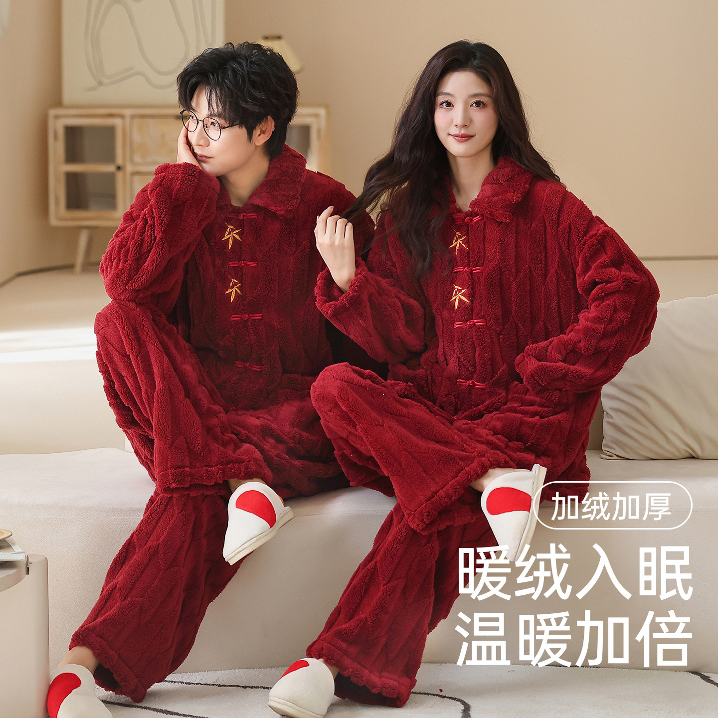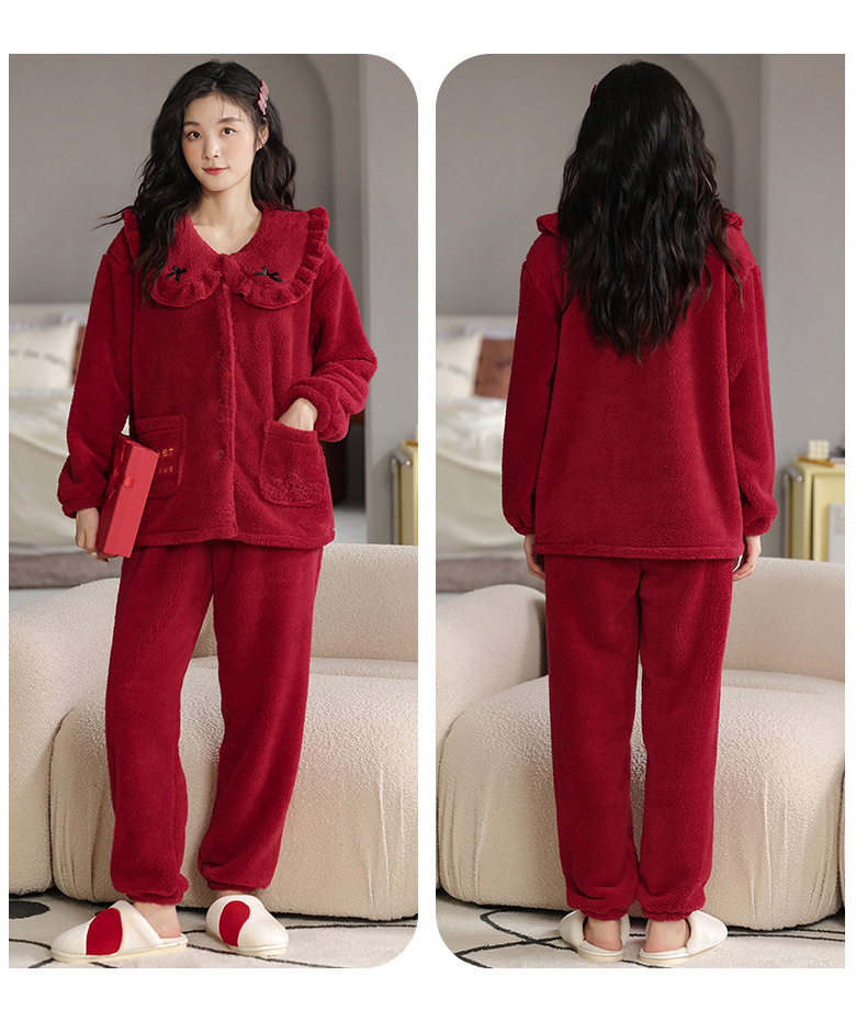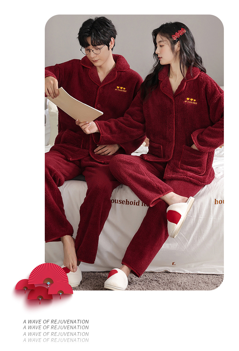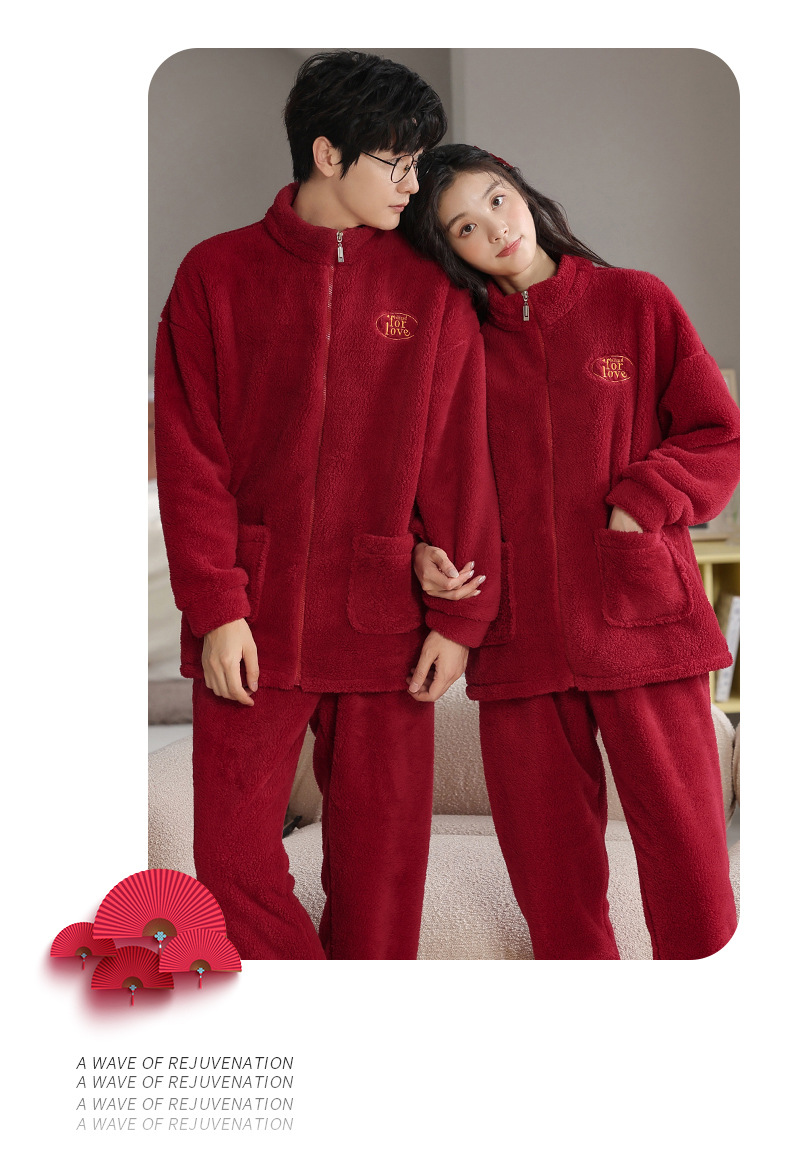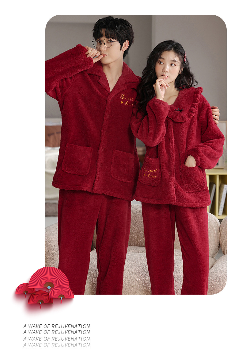 情侣睡衣冬季加绒加厚结婚新婚翻领大红色舒棉绒新中式可外穿套装