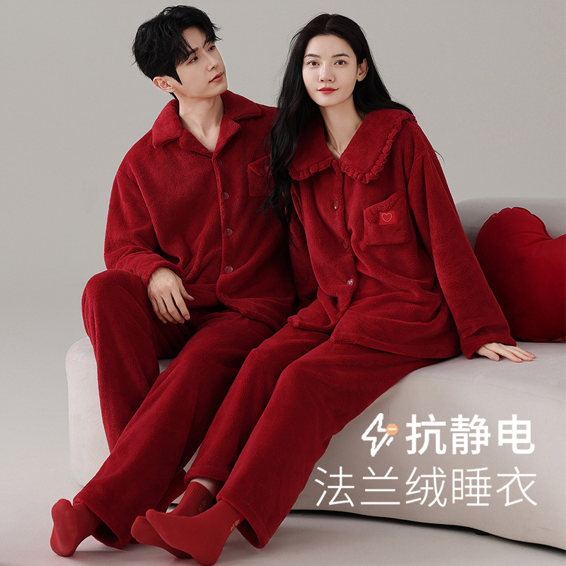 睡衣结婚新婚情侣套装冬季男女红色珊瑚绒情侣装抗菌法兰绒家居服
