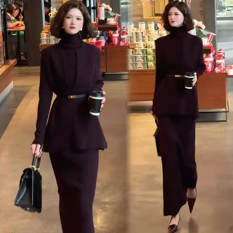 韓国版の気質の高級感の純色はやせている女装の秋冬の新型の流行の腰を収めて底の馬甲の半スカートのスーツを打ちます。