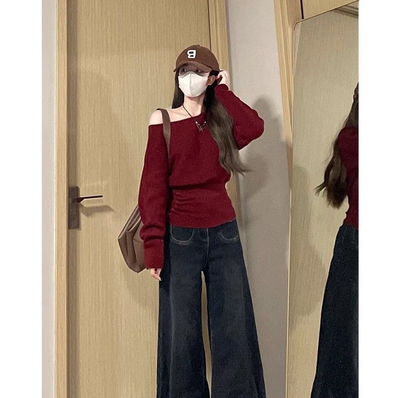 肩の一字の肩の上着のニットの女性の秋の服の新型の修身長袖の赤い肩の黒い一字の襟のセーター