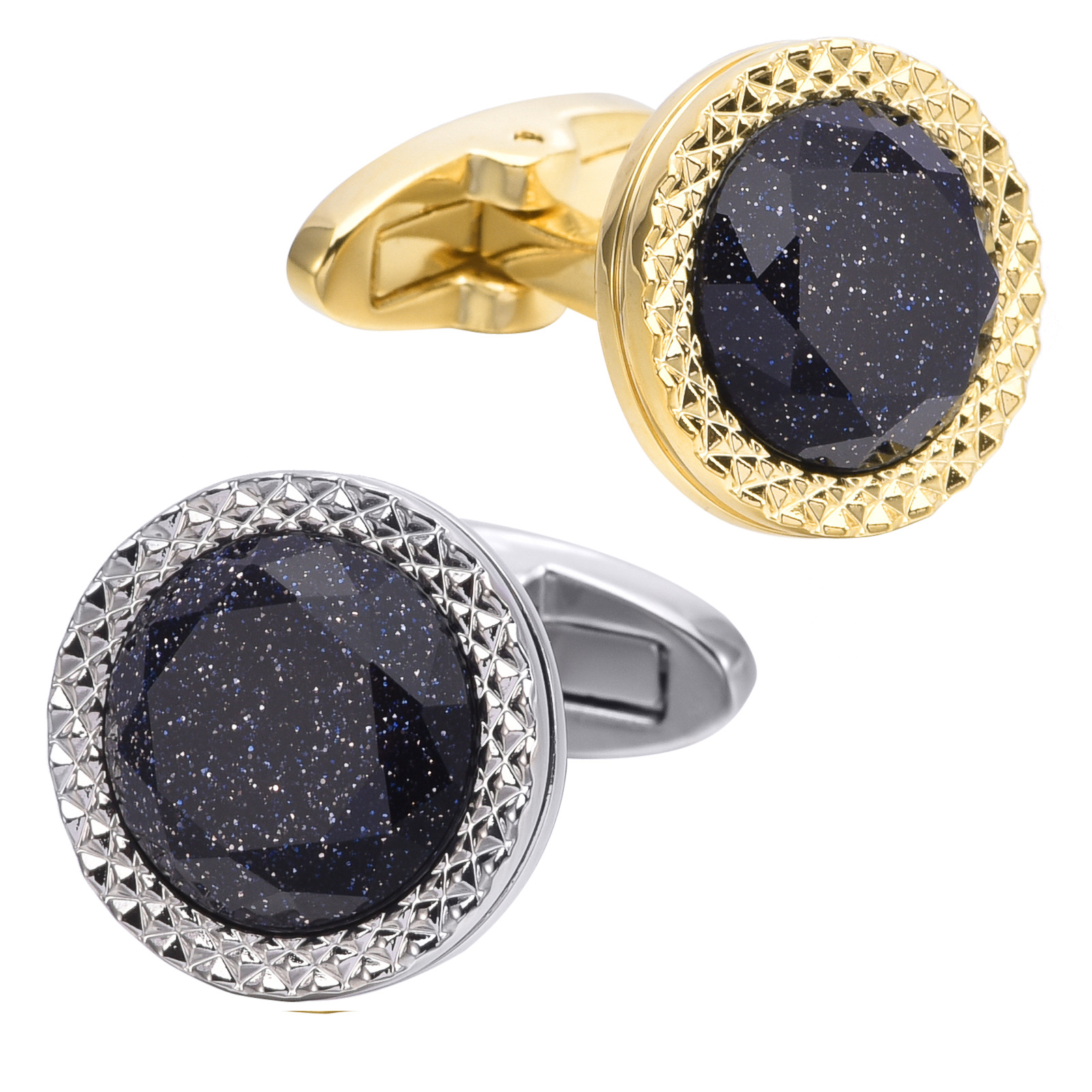 東莞の星空の宝石のフランスのカフスは簡単に斜面の金と黒のカフスの正装のスーツの高級な青い砂の石のカフスを掛けます。