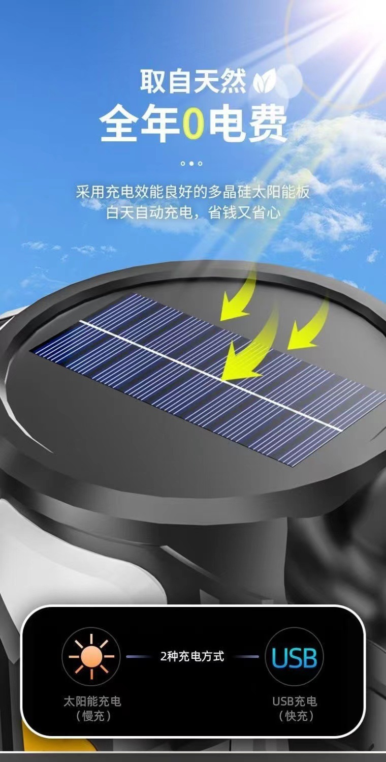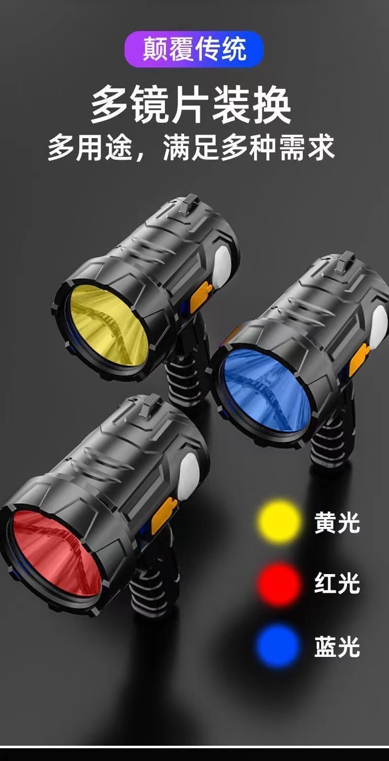 クロスボーダー手持ち懐中電灯屋外led強光サーチライト太陽エネルギー充電宝スタンド手提げライト赤黄緑