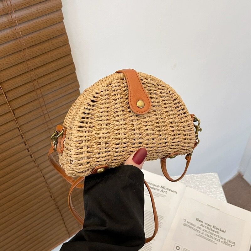 代件新作小清新斜めショルダー編みカバン休暇ビーチカバン森系半円草編みカバン韓国風女性カバン