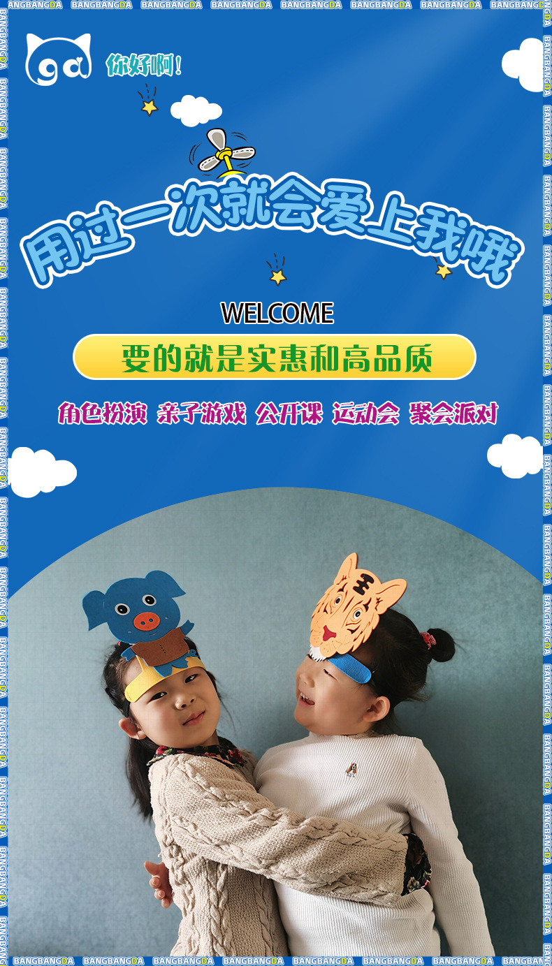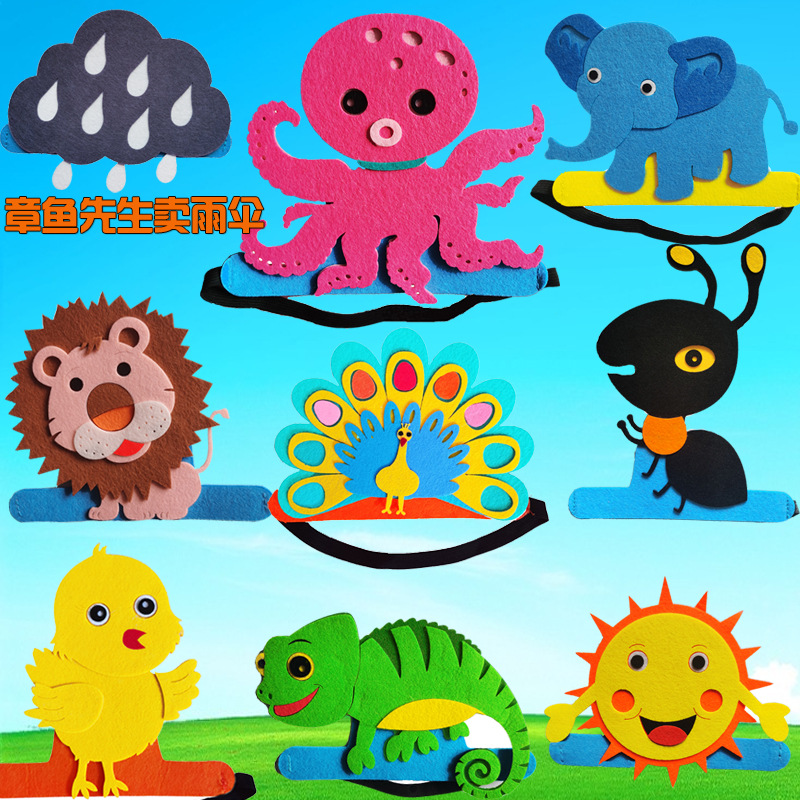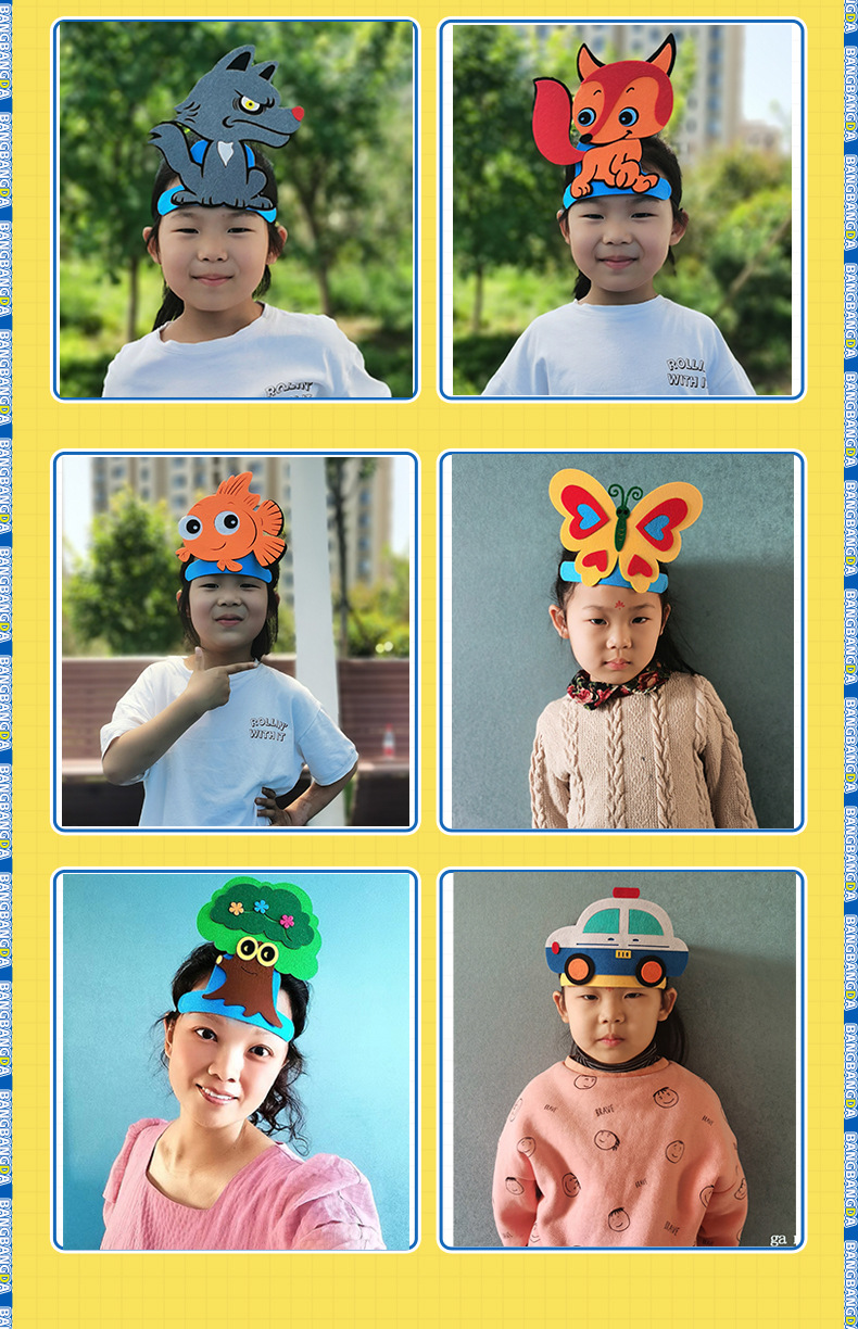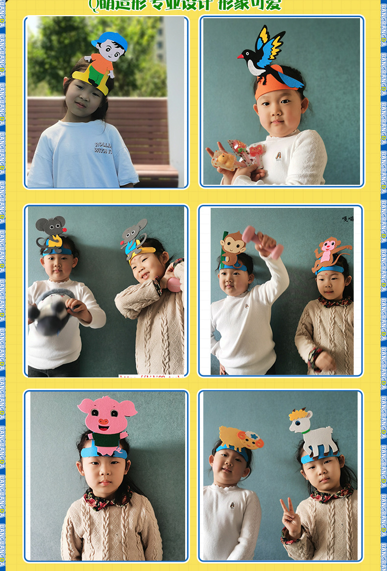 子供の日の幼稚園の漫画の動物の頭は道具のトラのオオカミのキツネの子猫の象の頭を飾って帽子をかぶっています。