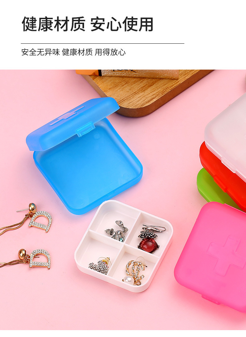 十字の薬の箱の4格のプラスチックの小さい薬の箱の四角形の携帯用の薬の箱の4格の錠剤の箱の収納の箱の卸売り