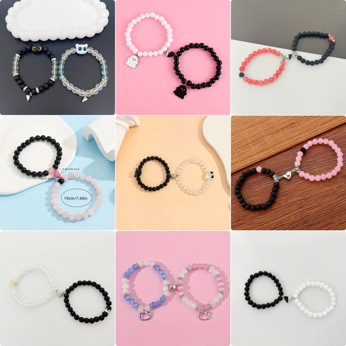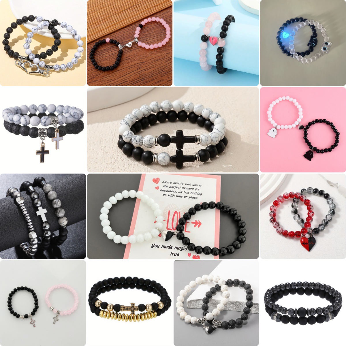 亚马孙爆款一对桃心吸铁石情侣手链 跨境热卖磨砂石粉晶白晶手串套装简约时尚饰品J1299