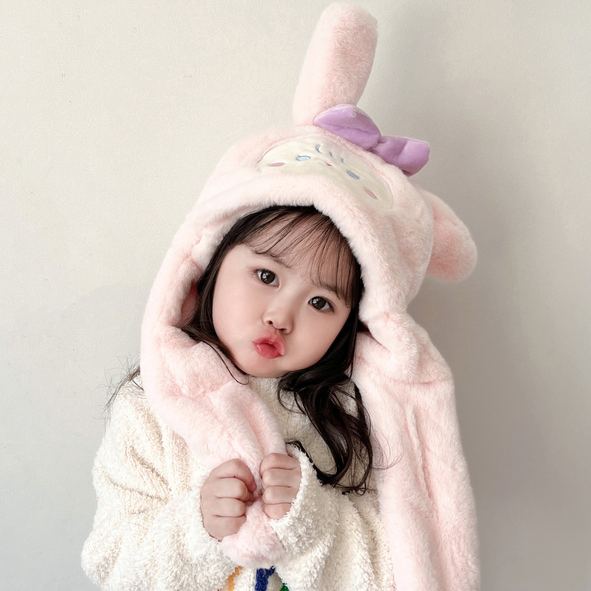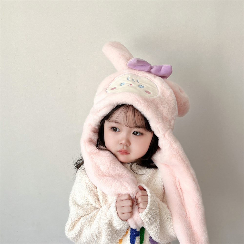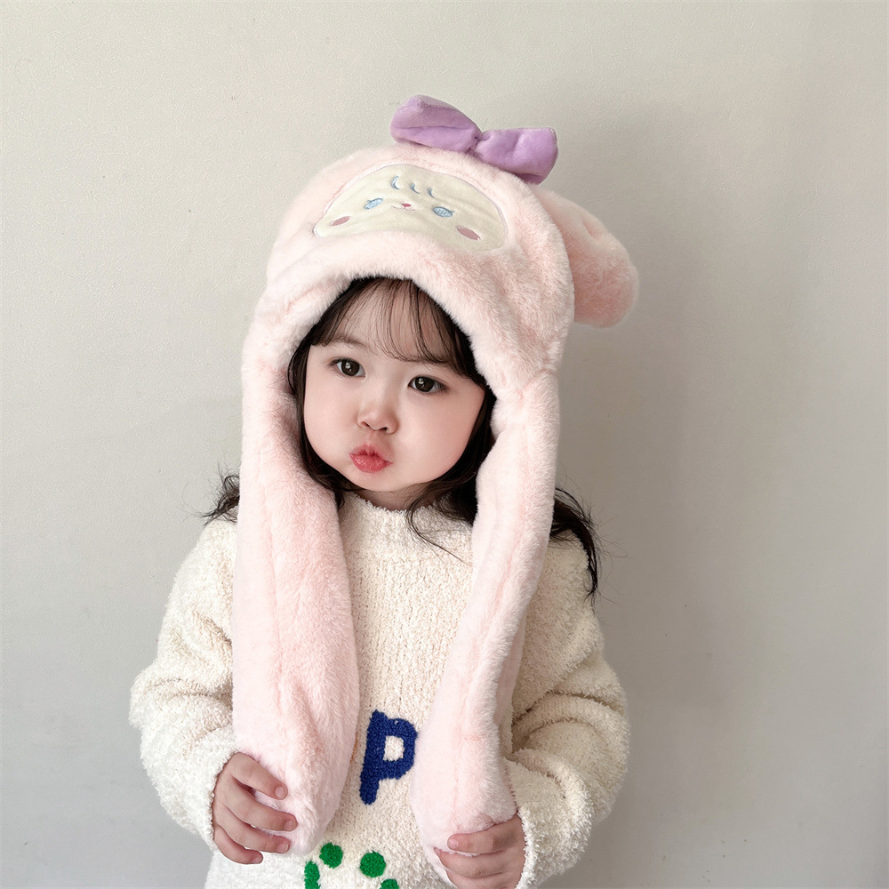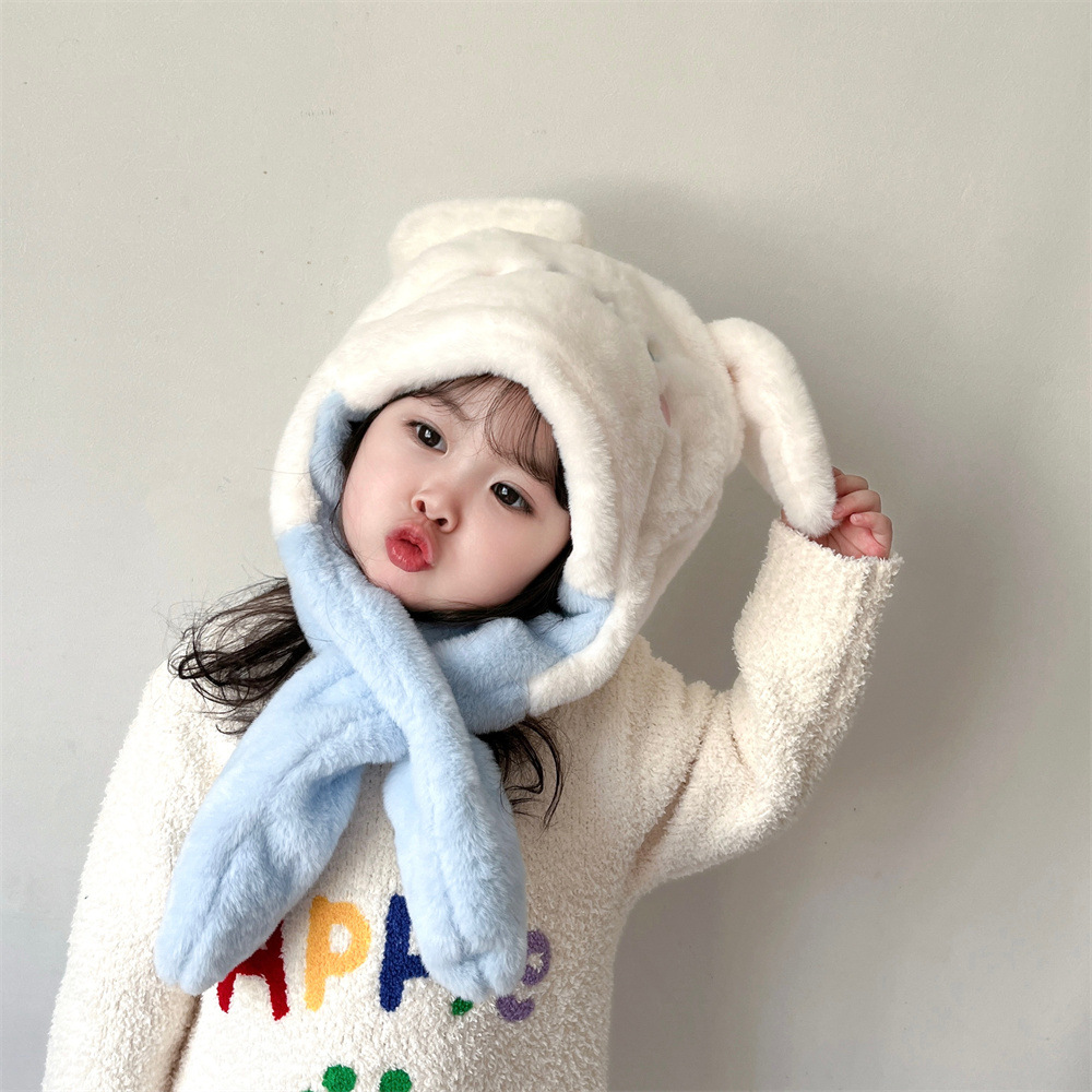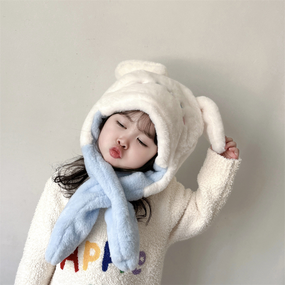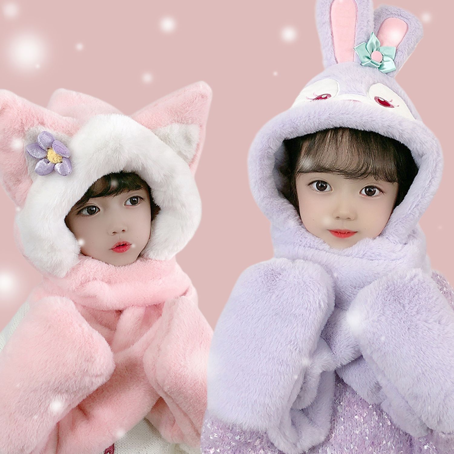 冬季可爱儿童帽子围巾一体女童耳朵会动会叫保暖毛绒加绒宝宝围脖