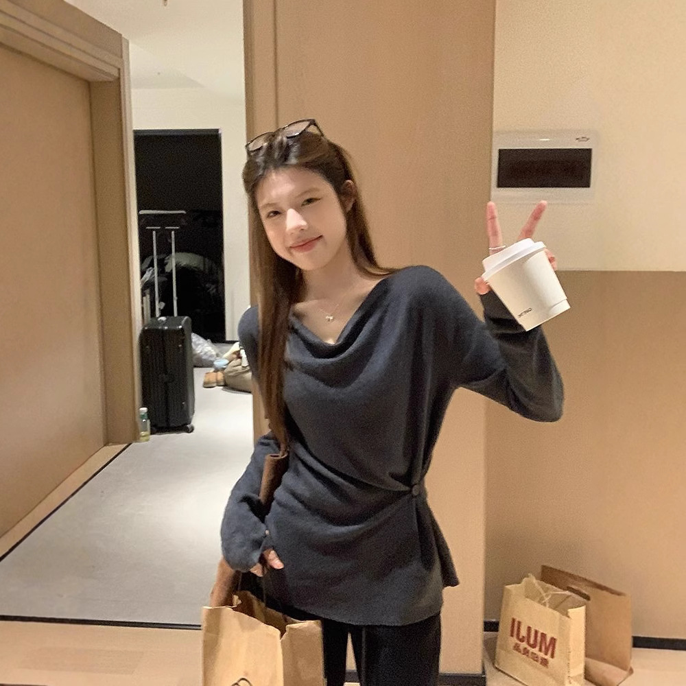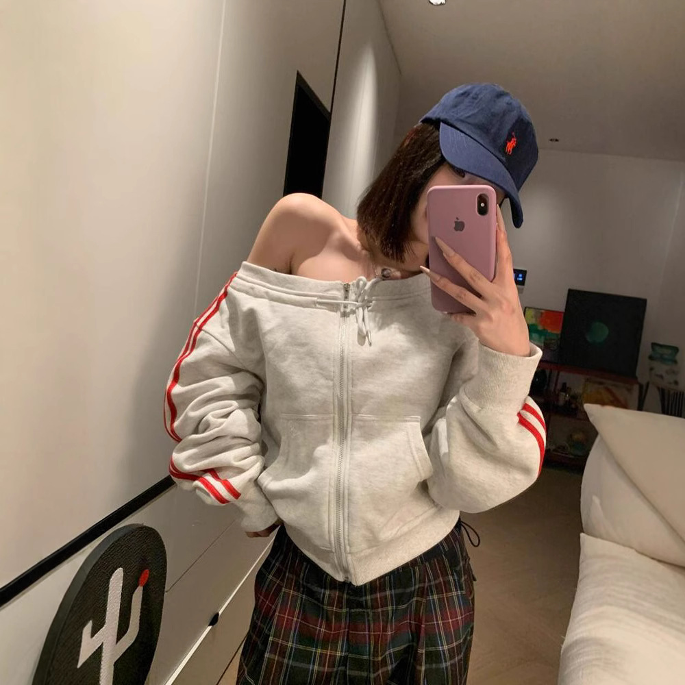 アメリカ式の1字のアメリカ式の肩の長袖の服の女性のギャルのカジュアルな修身のデザイン感の運動はやせて柔らかいモチの上着を現します。
