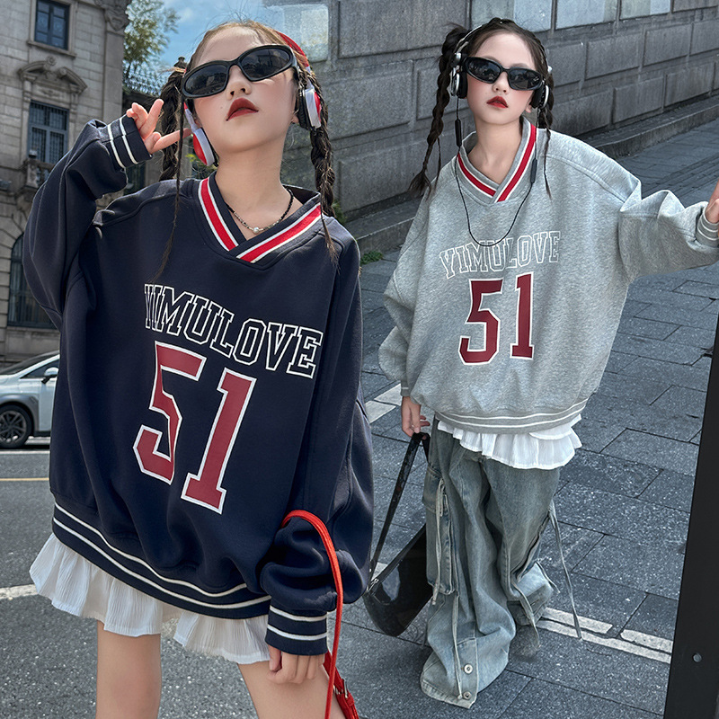 女の子用スウェットシャツ 春秋モデル 中高生向け 秋服 ゆったりプリント長袖トップス カレッジスタイル トレンドブランド
