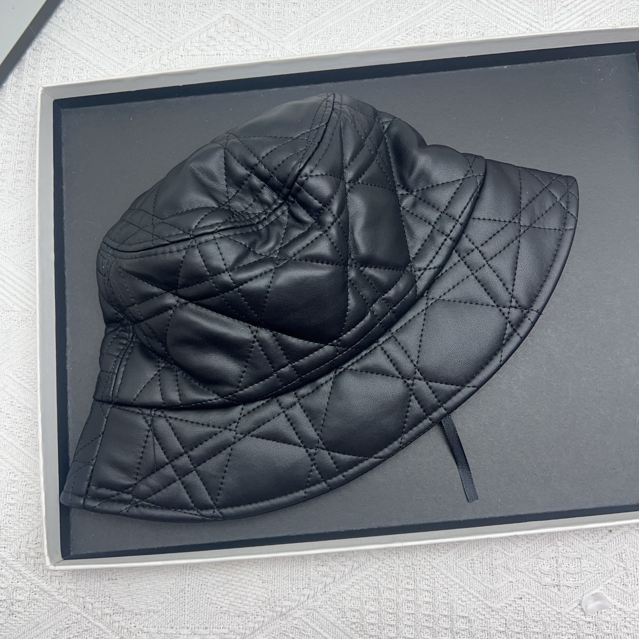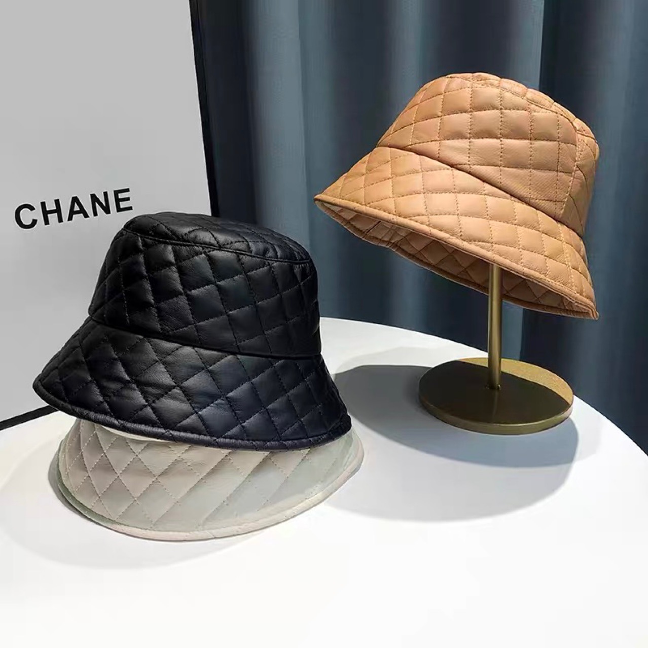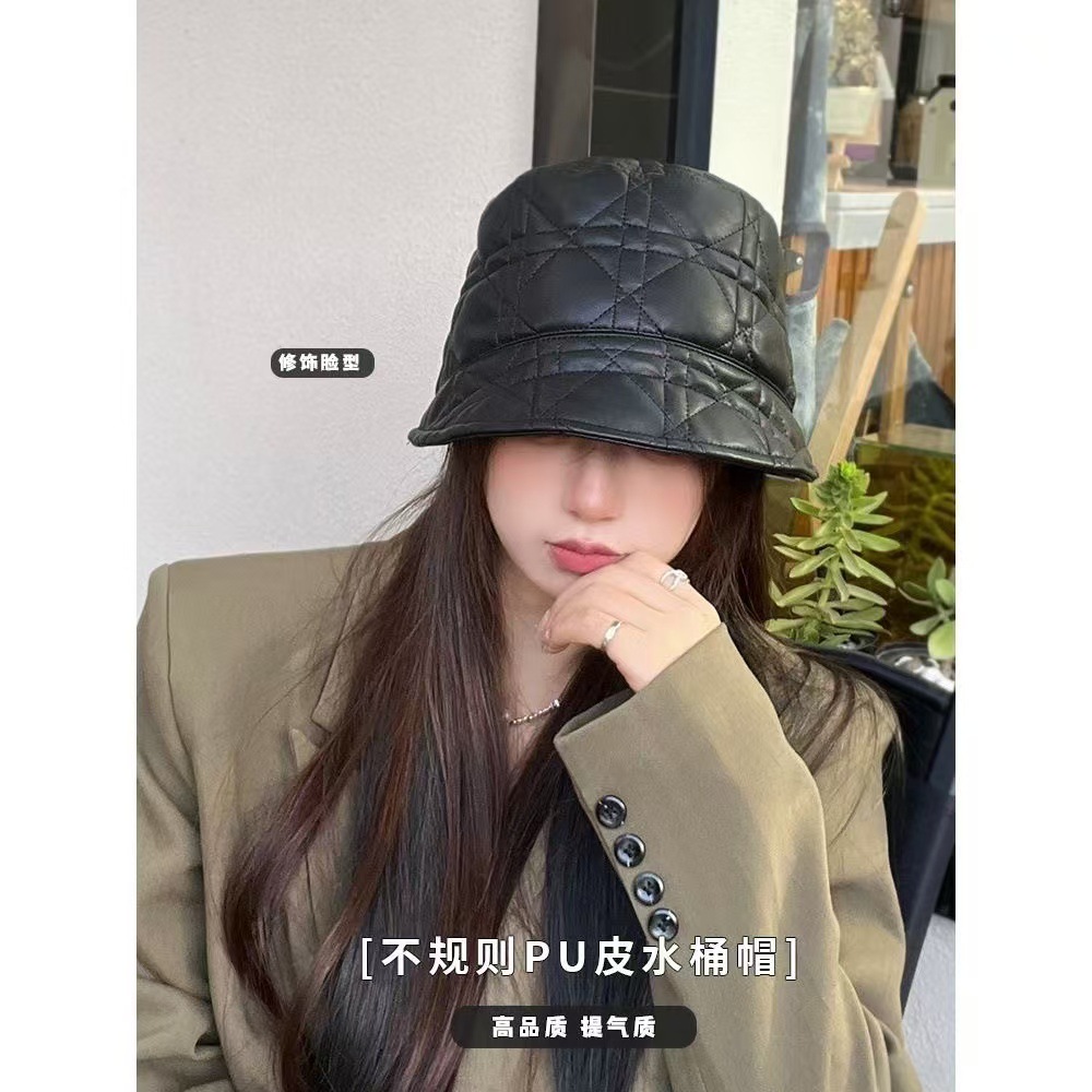 韓国版秋冬菱形格pu皮質盆帽百合顔小黒色バケツ帽保温耳保護漁師帽女