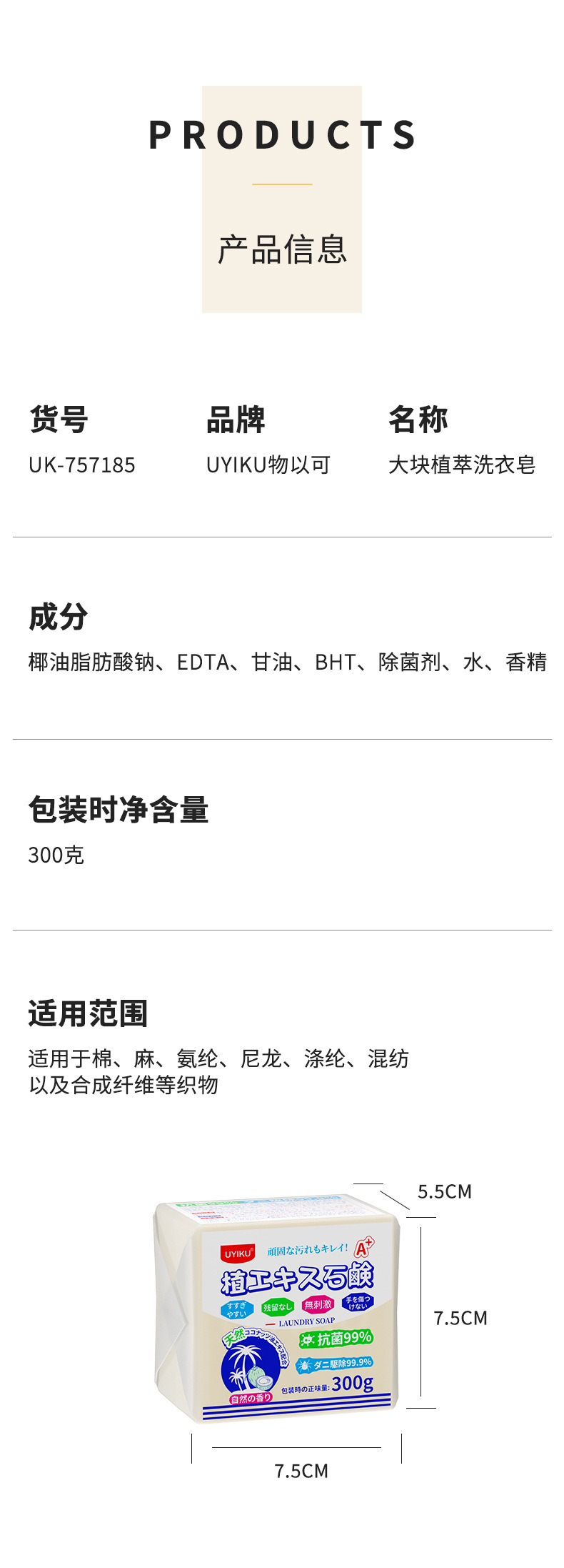 方形大块植萃洗衣皂 300克椰油皂母婴内衣香皂厂家日本物以可