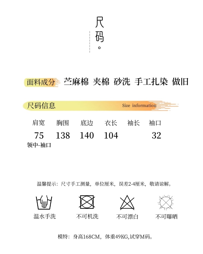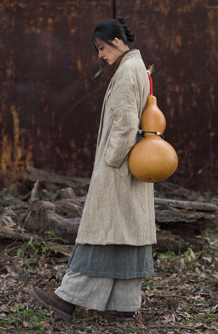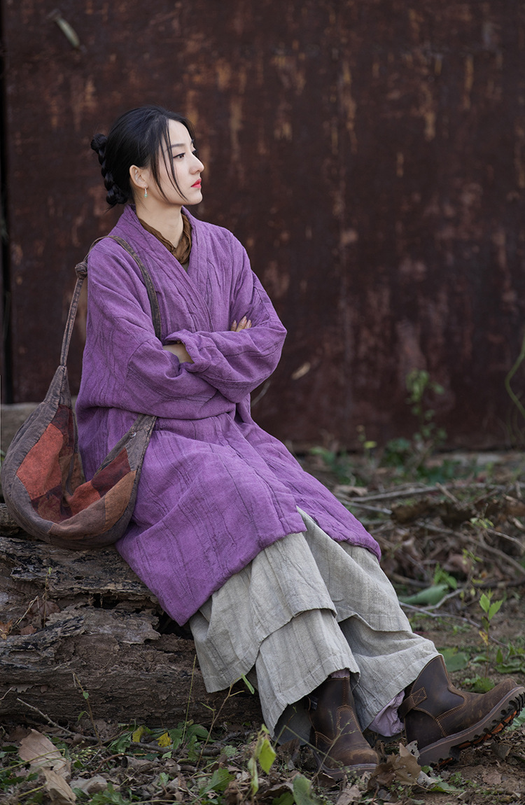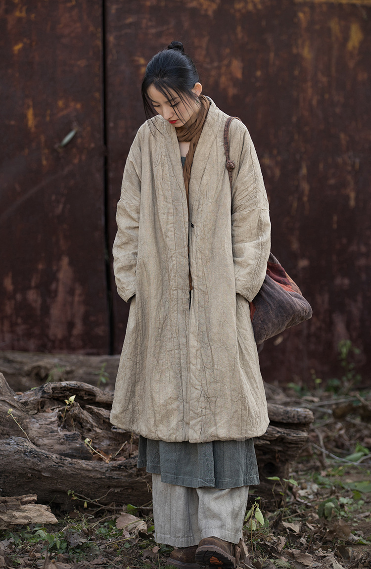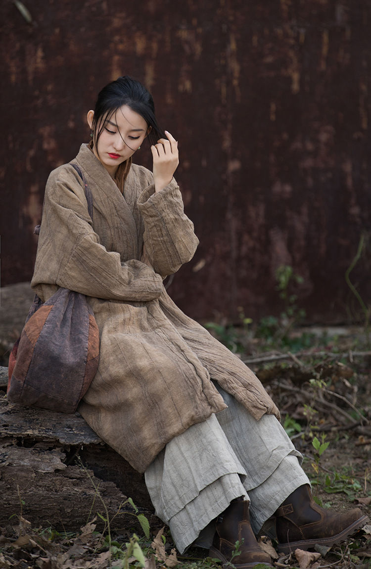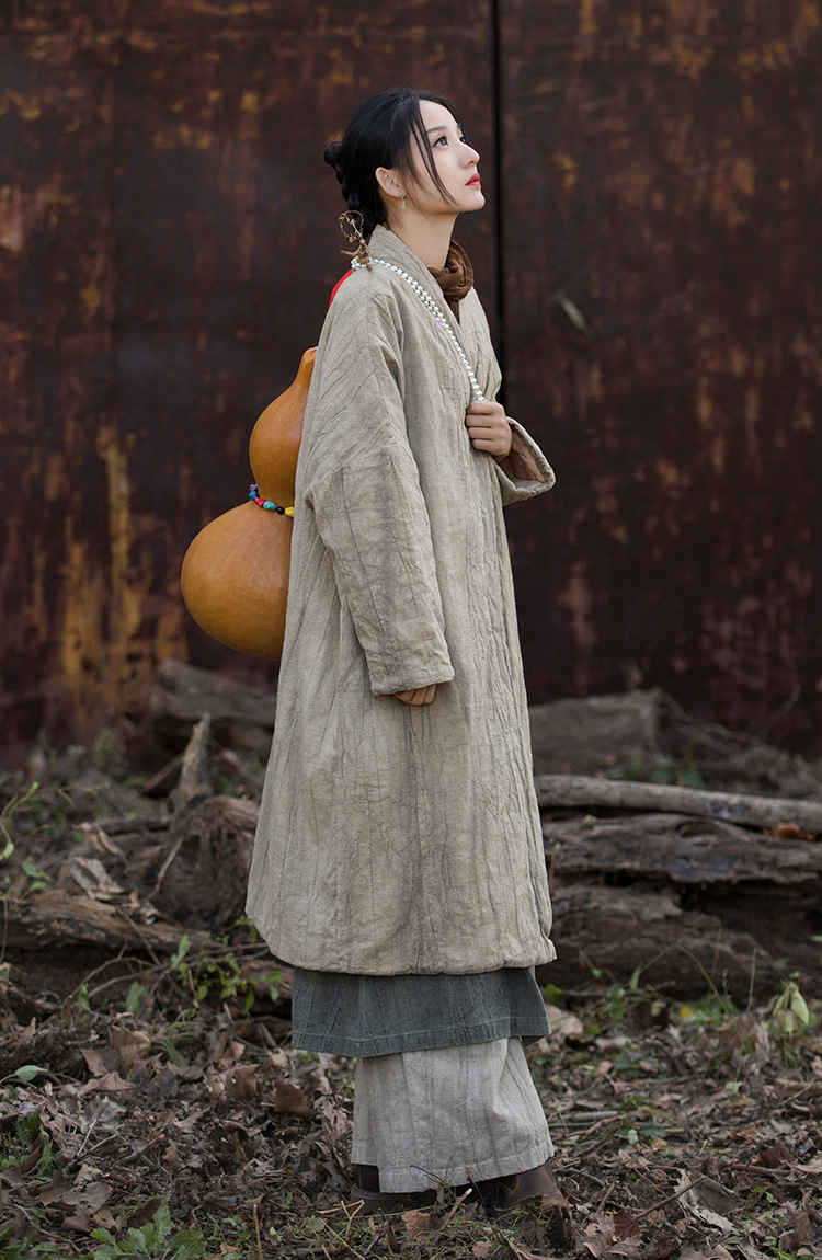 25冬麻手染め加工、古風な風合い、綿入り厚手、禅風ロング丈綿麻婦人服