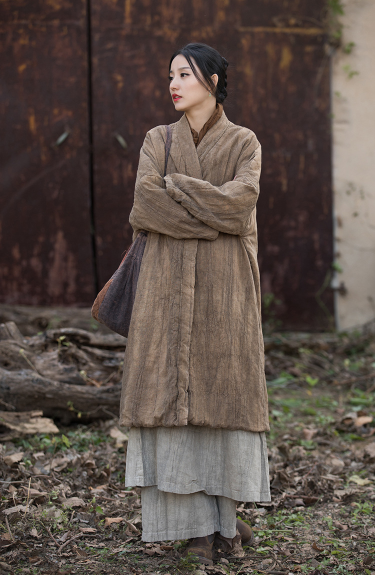 25冬綿麻婦人服新作、綿入り厚手保温加工、染色キルティングロングコート、ボタン留め婦人用ロング綿服、綿衣